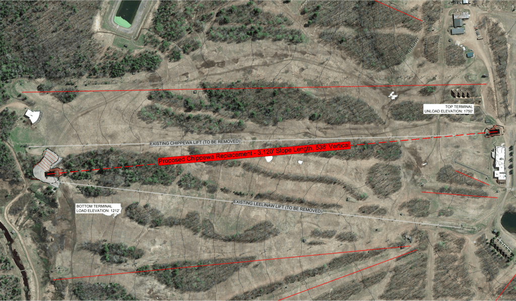 The rumors were true – the first detachable chairlift in Michigan’s Upper Peninsula will debut for the 2023-24 season at Snowriver Mountain Resort. The Doppelmayr six place will replace Chippewa, Leelinaw and Voyagers at Jackson Creek Summit, formerly Indianhead. The existing double, triple and quad have a combined design capacity of 5,250 passengers per hour, though that capacity has not been realized for years. The replacement lift will include 53 chairs yielding a capacity of 2,800 skiers per hour with the opportunity to go to 3,200 per hour if needed. It will take the name Voyageur Express and run from the bottom of Leelinaw to the top of Chippewa. With a line speed of 1,000 per minute, ride time will decrease from eight-plus minutes to just 3.5 minutes. “The new lift will greatly enhance our guest experience at Jackson Creek Summit,” said newly-hired General Manager Benjamin Bartz. “Because the new lift will be much easier for guests to load and unload, we anticipate smoother operations, meaning guests will spend more time skiing and less time sitting on a lift.”