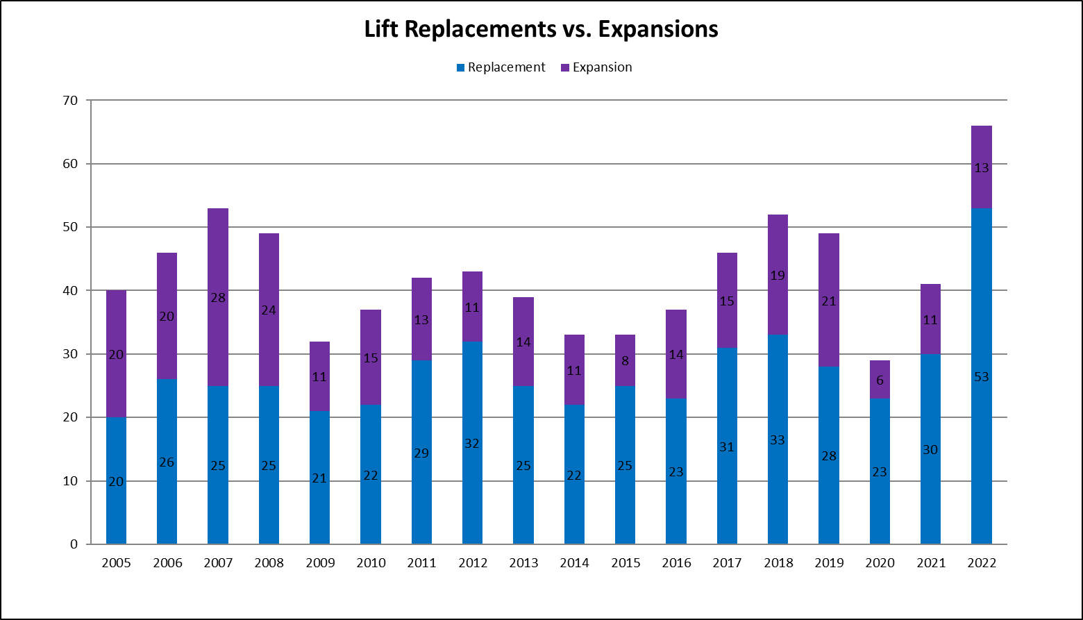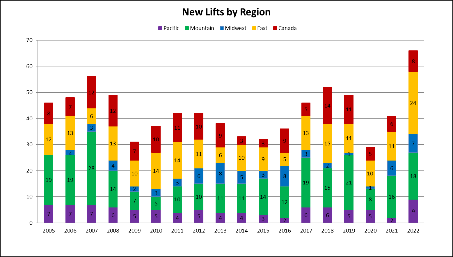 North American lift construction reached a 23 year high in 2023 with 66 installations from California to Maine and British Columbia to Nova Scotia. Not only did 2022 see the largest number of projects since 1999, it was likely the biggest lift investment year ever in dollars. While there’s no way to know exactly how much all the lifts cost, it’s safe to say the new gondolas, bubble chairs and fixed grip quads built this year total hundreds of millions. Amazingly, this feat was accomplished amid immense supply chain and labor challenges and without three large projects postponed at Park City and Keystone. A few lifts remain in final stages of construction this New Year’s Eve but will be completed in the first weeks of 2023 and spin for decades to come.