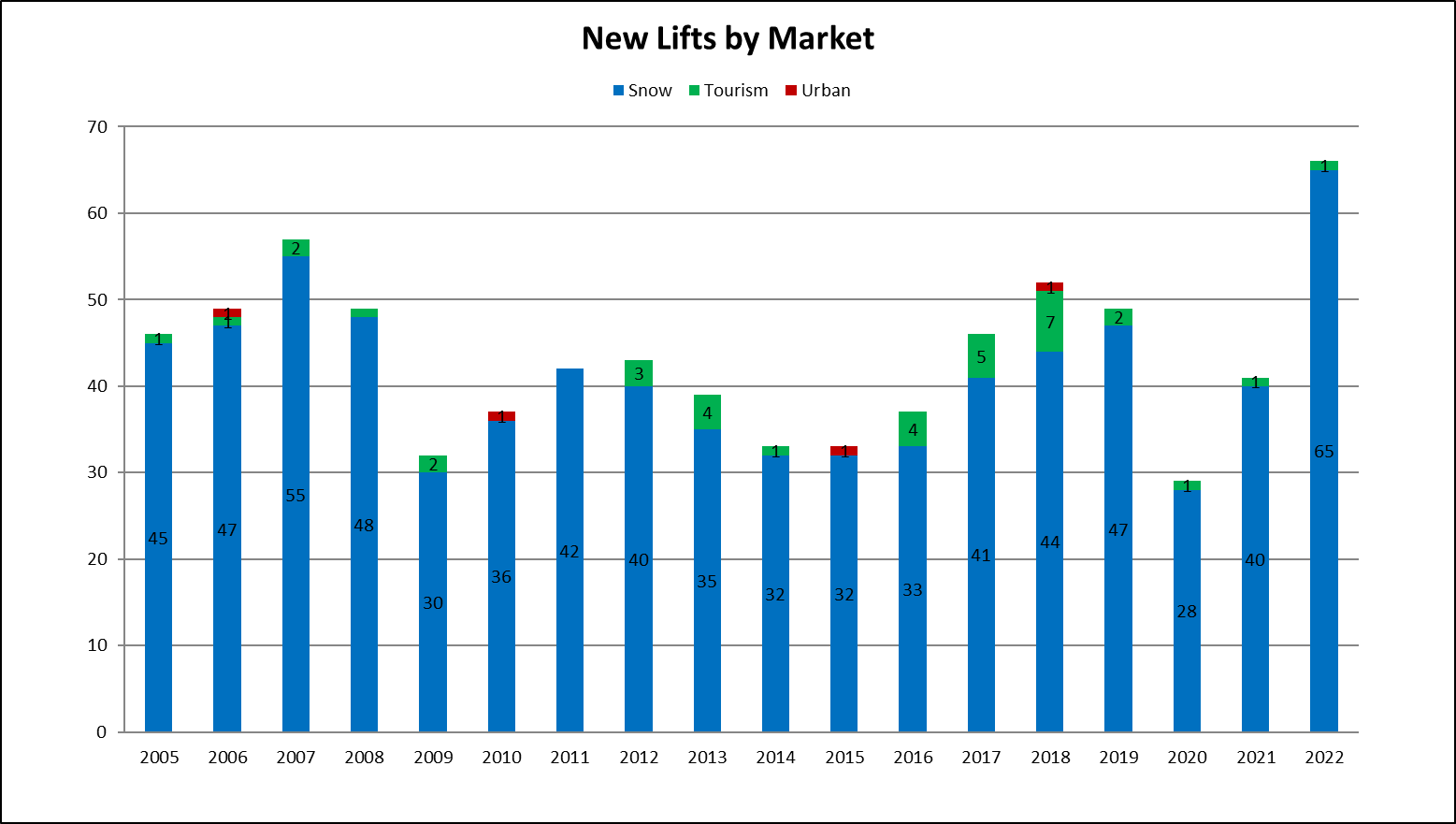 Covid turned into a boon for the ski industry and 65 of 66 projects were at ski resorts. For all the talk of urban gondolas and point of interest projects, skiing remains nearly synonymous with the lift business. An outfit called SkyLand Ranch near Gatlinburg, Tennessee saw the lone non-skiing installation for 2022. So far only one of next year’s project is non-skiing at a California winery.