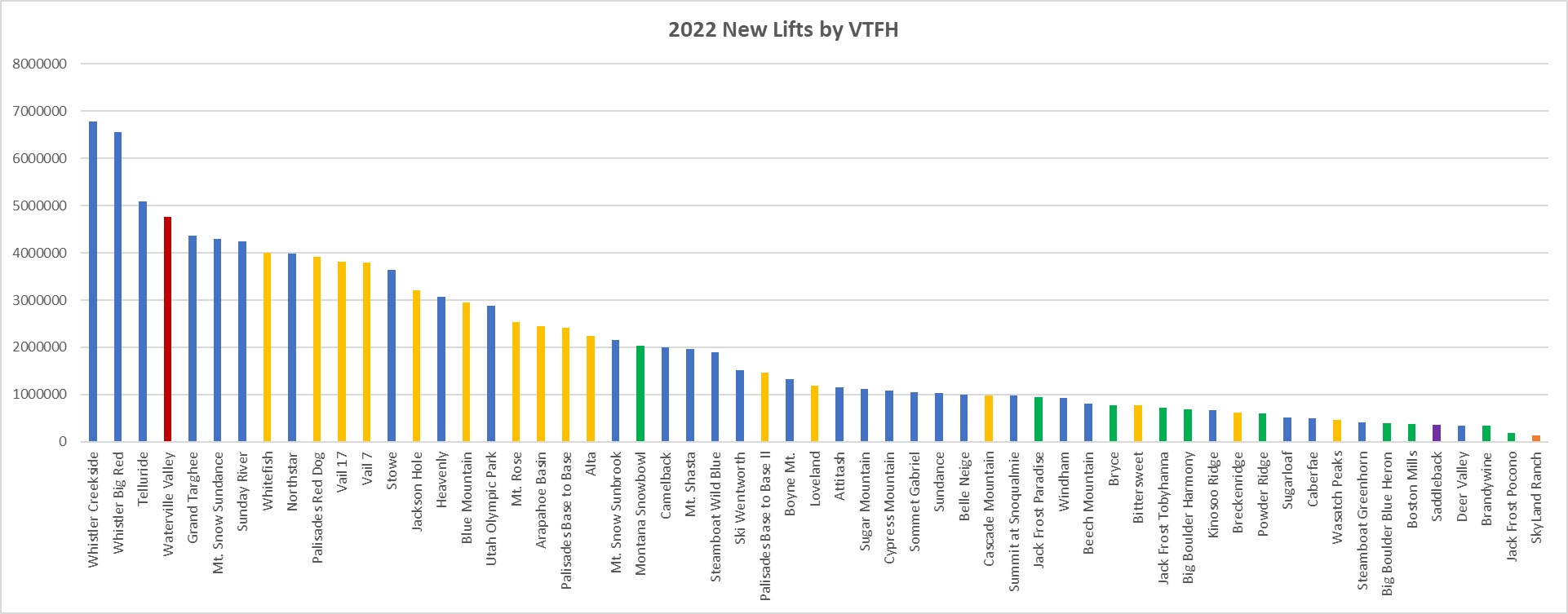 Vail Resorts realized an incredible 18 new lifts at 12 resorts for the 2022-23 season, the largest-ever investment by the firm and probably any company in North American ski history. Boyne Resorts also went big with multiple eight place installations and a half dozen projects total as it continued renewing lift fleets across its ten resort portfolio. Five year old Alterra Mountain Company launched giant new gondolas at Palisades Tahoe and Steamboat with more big projects in the pipeline for 2023.
