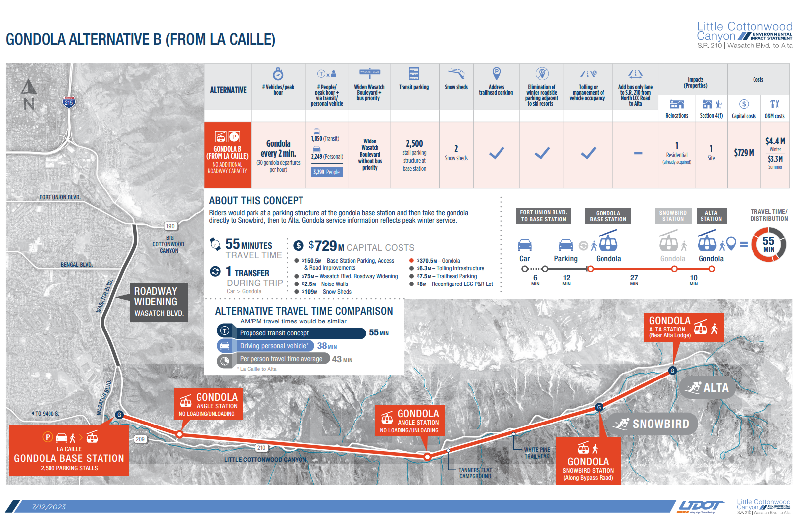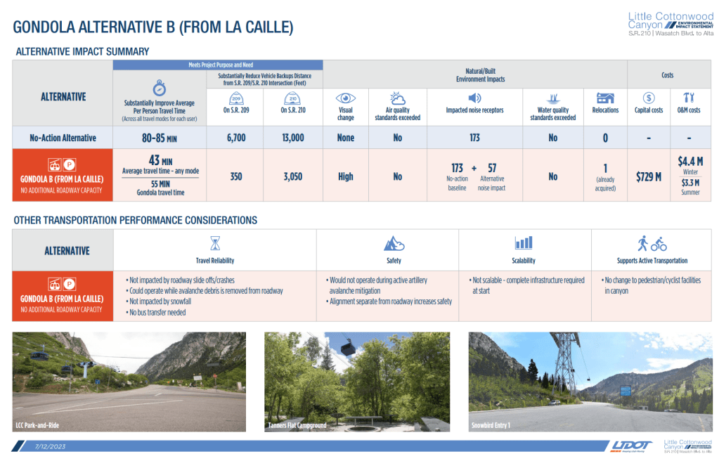 “The gondola provides the highest travel reliability, as it can operate independently of State Route 210, avoiding delays related to adverse weather, crashes, slide offs, and slow moving traffic,” wrote UDOT in its Record of Decision. “While the gondola does have high visual impacts, it has low impacts to the watershed, wildlife movement and climbing boulders, along with low operations and maintenance costs.”