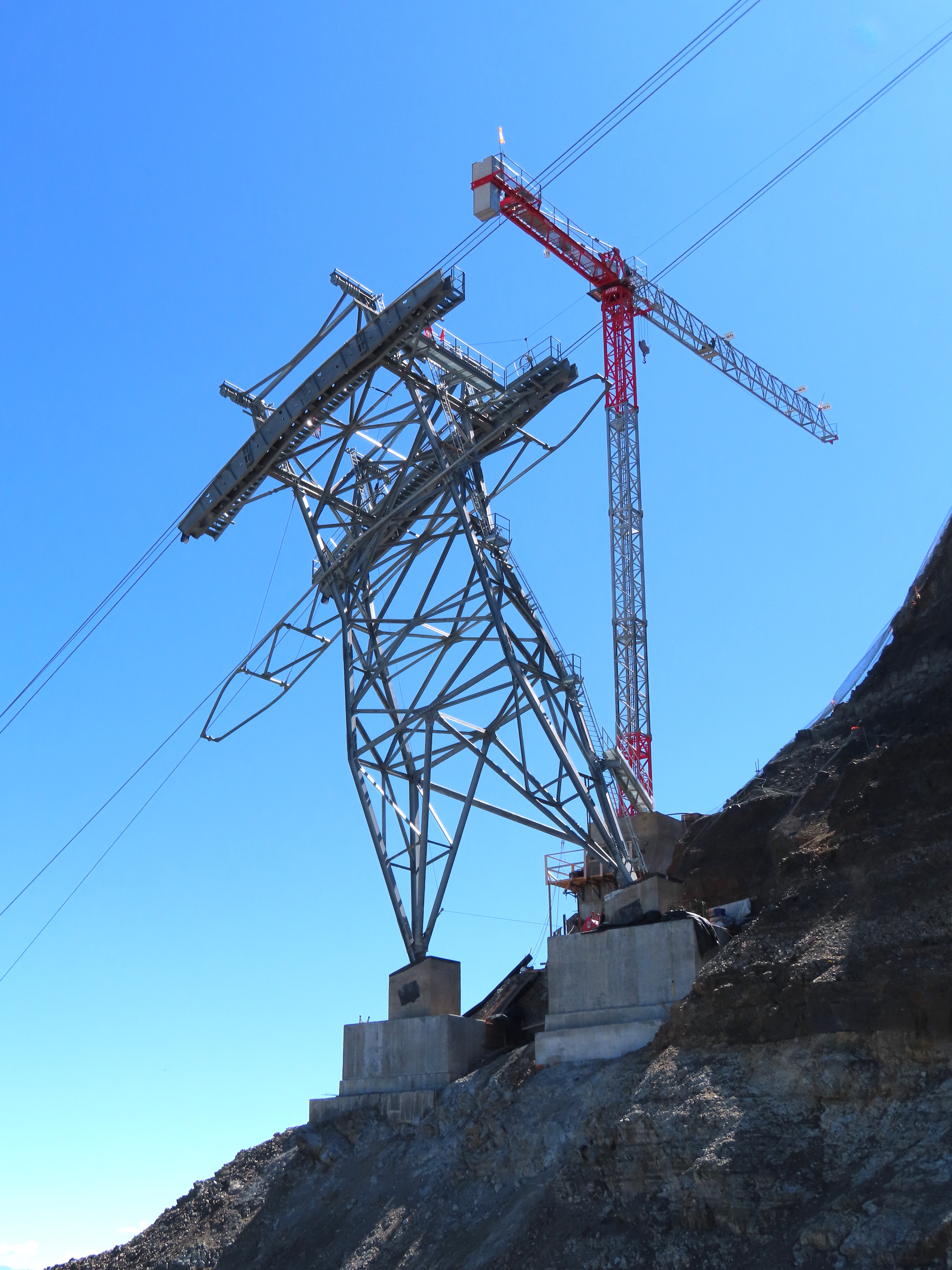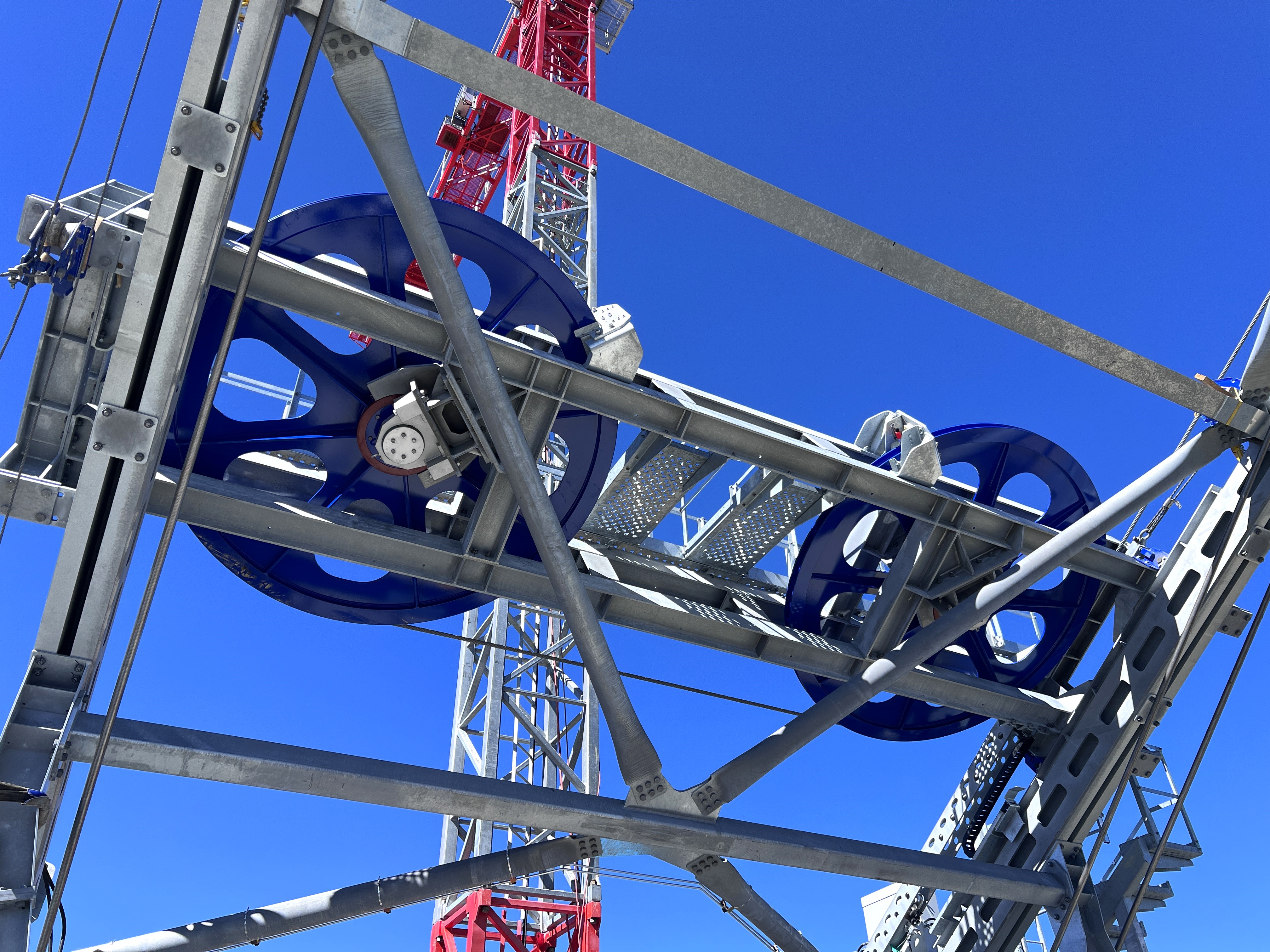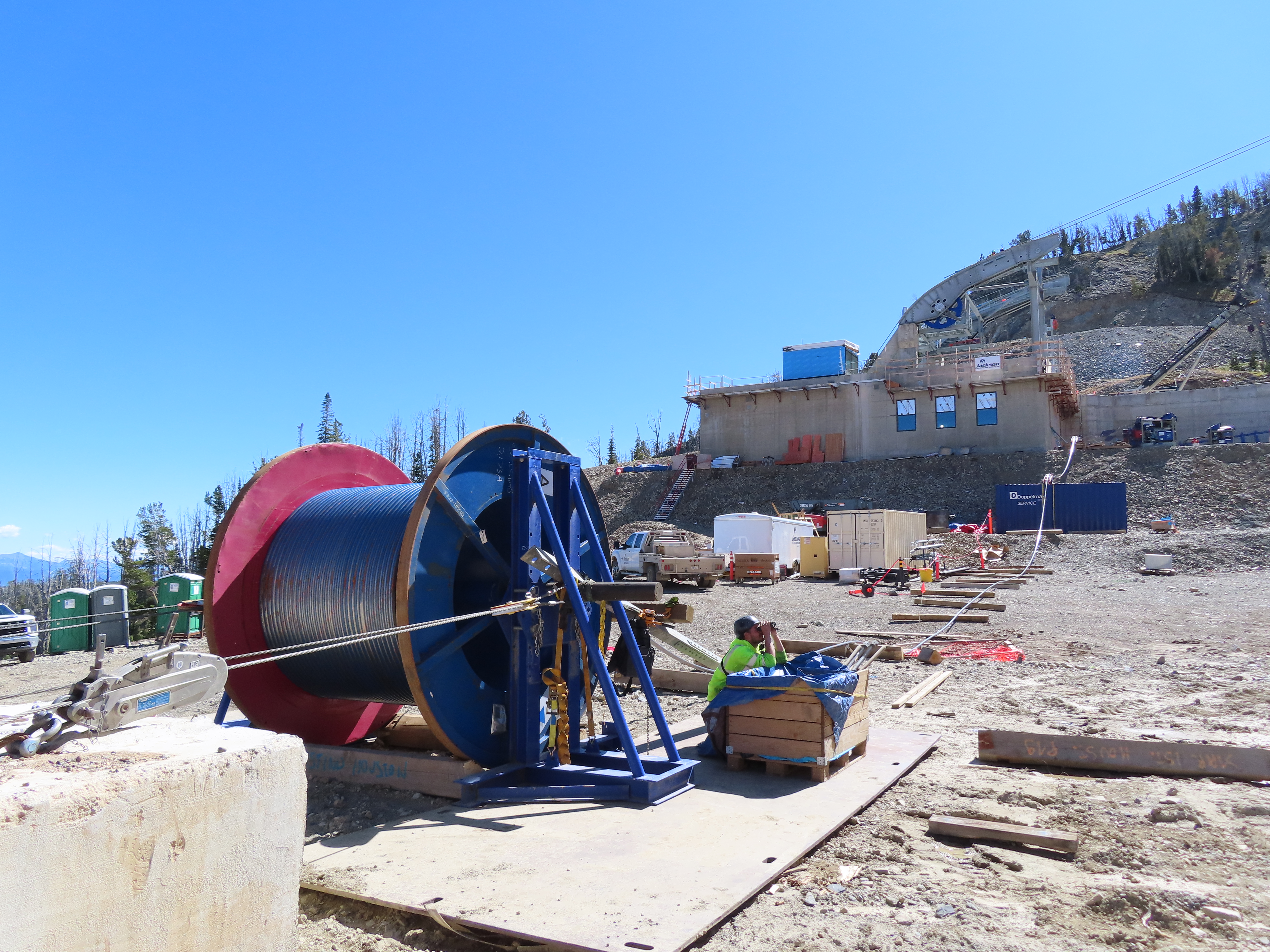 Big Sky and contractors completed micropiles, tiebacks and concrete work last summer, setting the stage for this summer’s steel erection and rope pulling marathon. As of today, three of the four track ropes are on their bollards. A fourth track rope pull is in progress with the haul rope on deck. For each track rope, a helicopter pulled a 10 mm pilot line up to the top terminal and back down. Then crews attached and pulled successively larger 18 mm, 22 mm and 32 mm ropes until finally the smooth 48 mm track rope was up the line. The process is slow and steady with up to 10 Swiss men on headsets and binoculars monitoring every inch of progress for 5-6 days per rope. The 37 mm haul rope will be pulled in similar fashion and spliced into a continuous loop like more traditional ski lifts. The tram will be driven from the bottom station with no counterweight required for tensioning. Redundancy is built in everywhere, from multiple transformers to dual motors, evacuation drives and generators. Frey AG Stans supplied the lift’s state-of-the-art control system, similar to one recently installed on Snowbird’s tram.