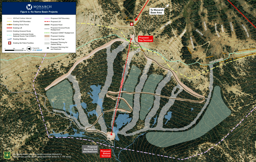 Independent Monarch Mountain would expand lift service to No Name Basin in a plan under review by the Forest Service. No Name sits over the Continental Divide from the existing Breezeway terrain pod and is currently skied via snow cat. If approved, the first new lift at Monarch since 1999 would be a fixed grip triple or quad rising 960 vertical feet. It would be approximately 2,700 feet long and carry 1,800 skiers per hour to an elevation of 11,700 feet.