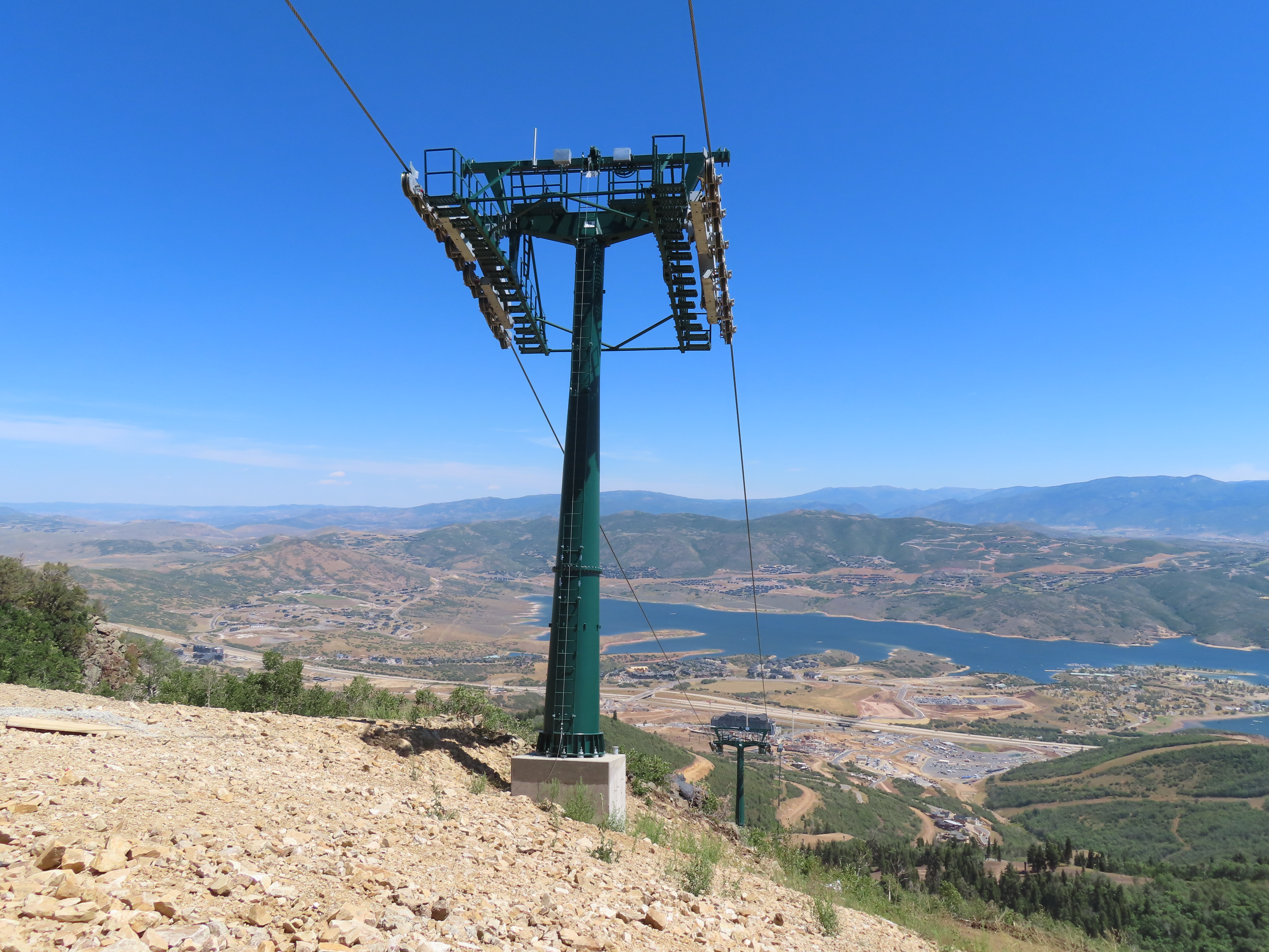 The flagship East Village Express gondola will run all the way to Park Peak. A behemoth of a mid-station sits on Big Dutch Peak, where the lift’s two sections connect at an angle. Each segment features its own direct drive and a Fatzer Performa-DT haul rope with cabins able to switch between lines. All three stations and most of the 40 towers were installed earlier this summer. Fatzer subsidiary Rigging Specialties worked to pull ropes this week with the lower line already on most towers. The upper rope, being installed now, will pass over several extremely tall towers and travel downhill at several points along the line.