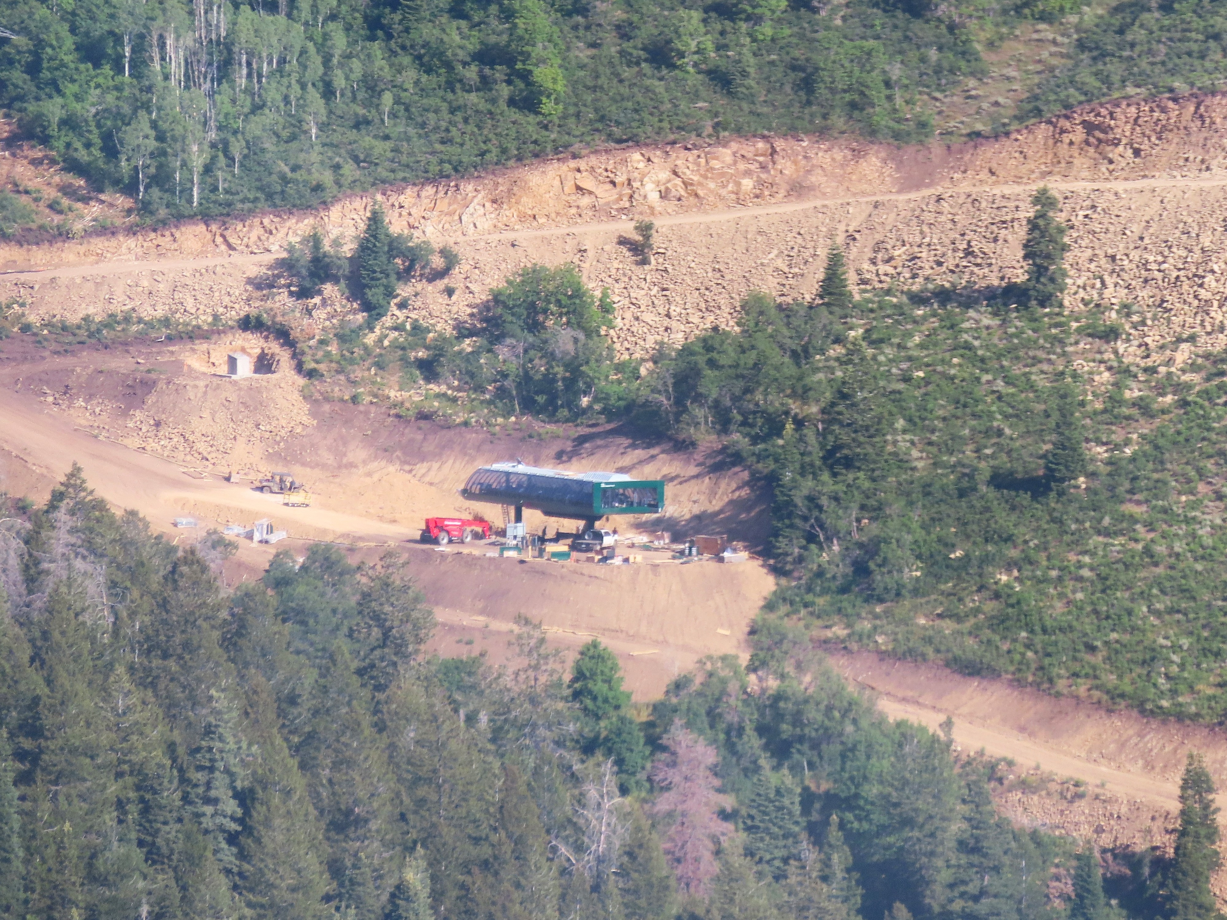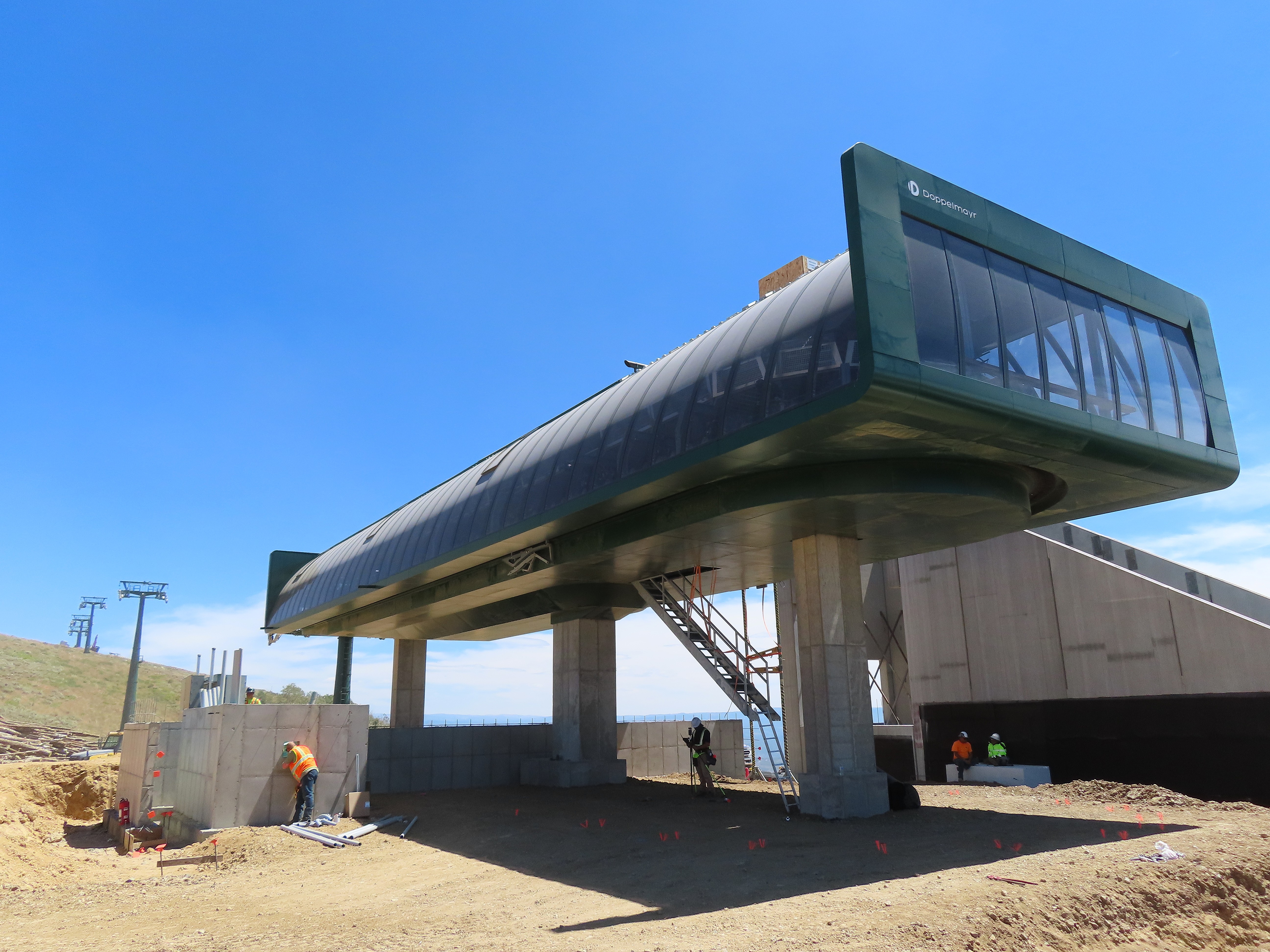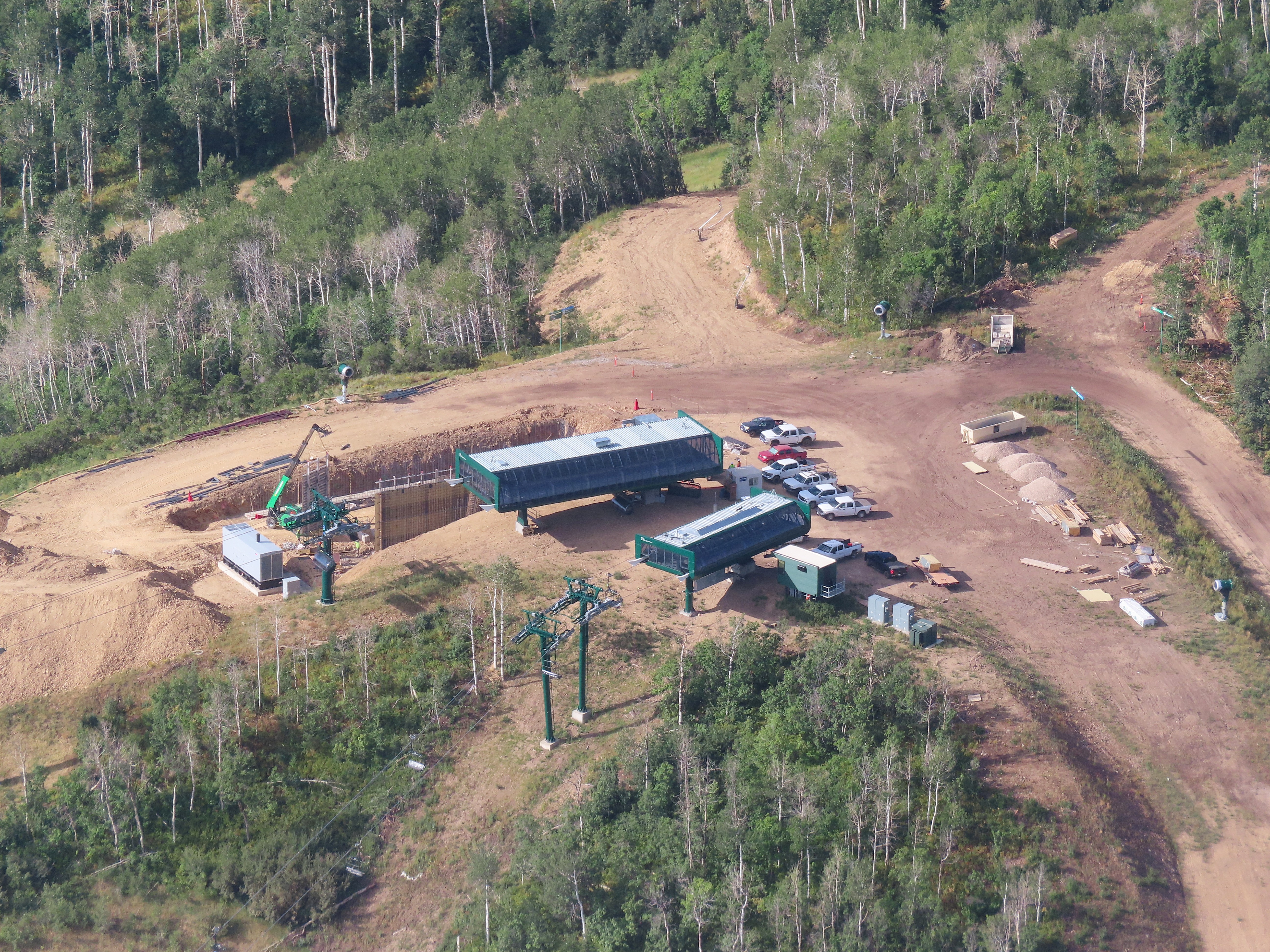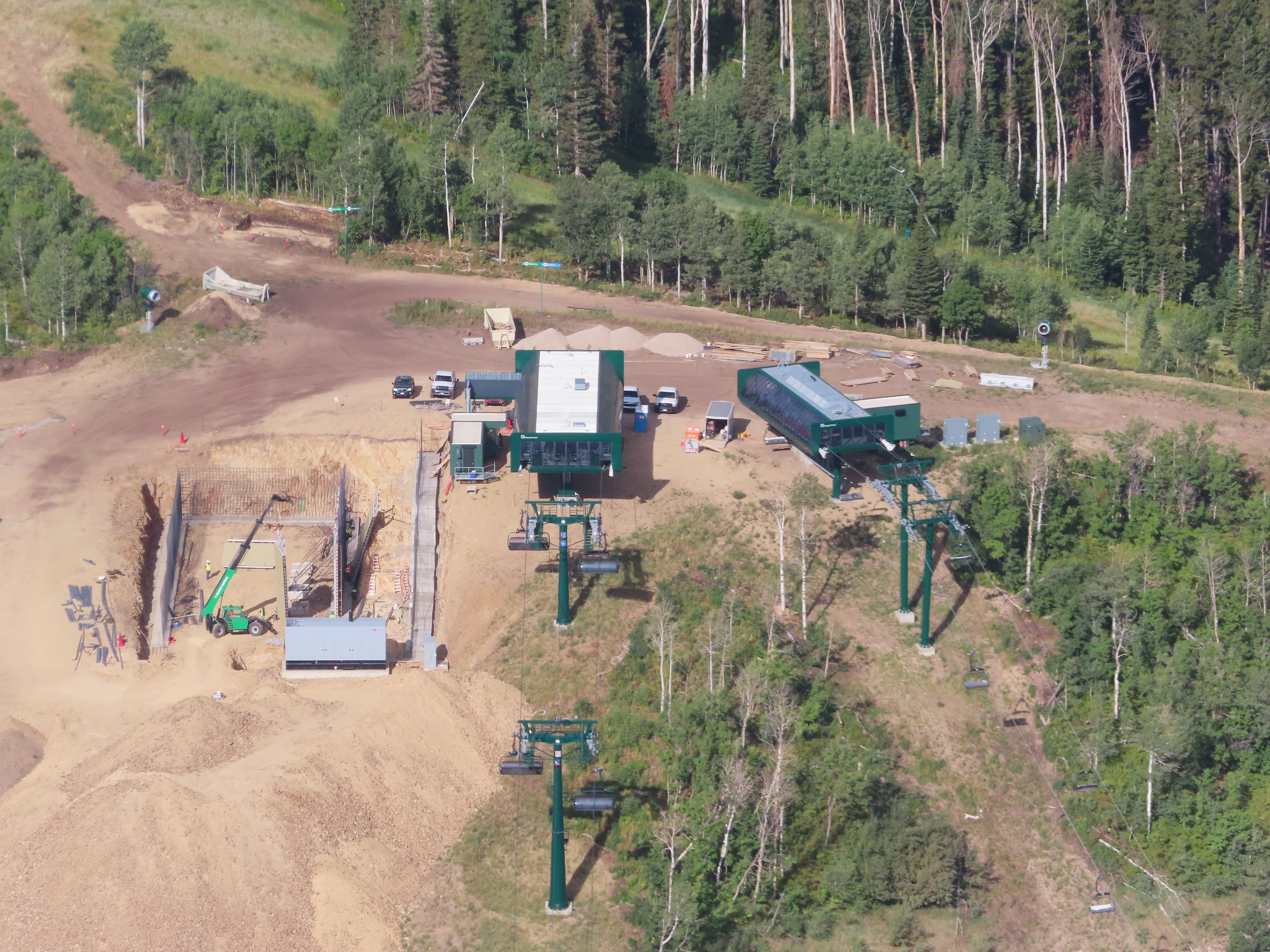 The smallest lift under construction is Neptune Express, set to load below Pioche Village and top out next to Pioche Express. This is one of the two machines Highlander’s installing this summer on top of several last year. The Highlander team was completing the top drive terminal this week with the bottom to follow.