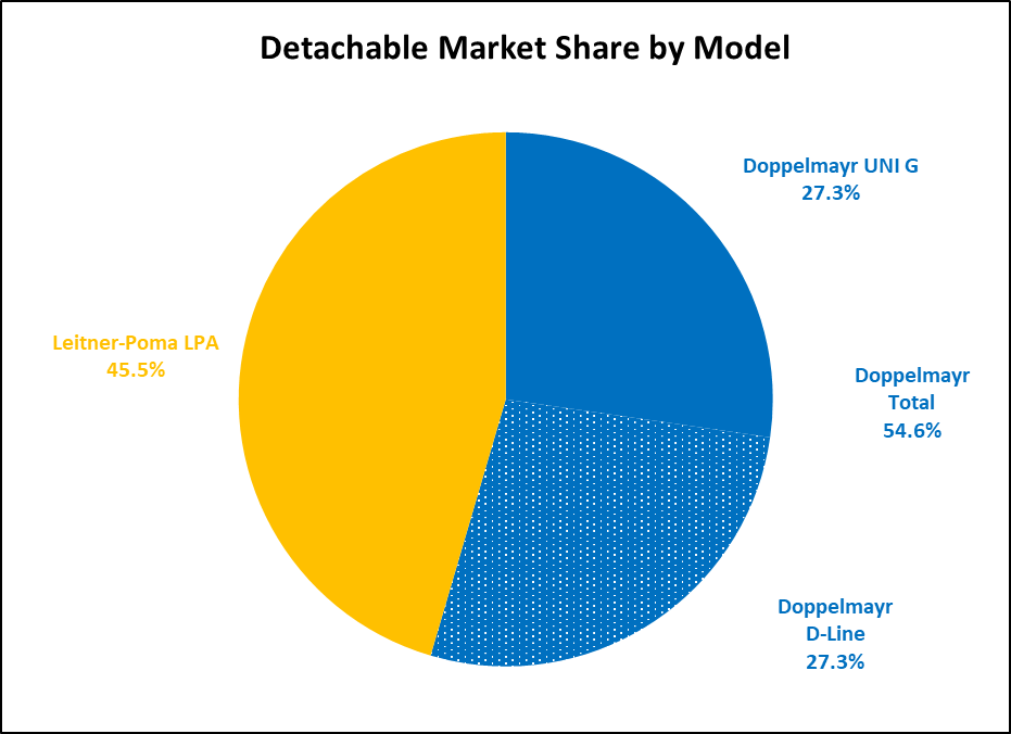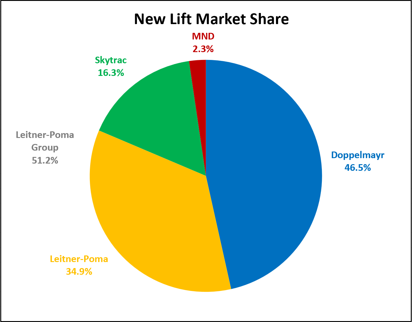 Doppelmayr and the HTI duo of Leitner-Poma and Skytrac continued to dominate the market in North America. LPOA won slightly more than half of projects (22) with Doppelmayr completing 20 installations. HTI paricularly excelled in the fixed-grip realm with five new Leitner-Poma Alphas and seven Skytrac Monarchs. Doppelmayr dominated the gondola and detachable spaces with six D-Lines and six UNI-Gs. By vertical transport feet per hour (VTFH), Doppelmayr edged out HTI with 46 percent of installed capacity vs. 45 percent. MND Ropeways built its first new lift in three years here, a T-Bar for Waterville Valley, New Hampshire.