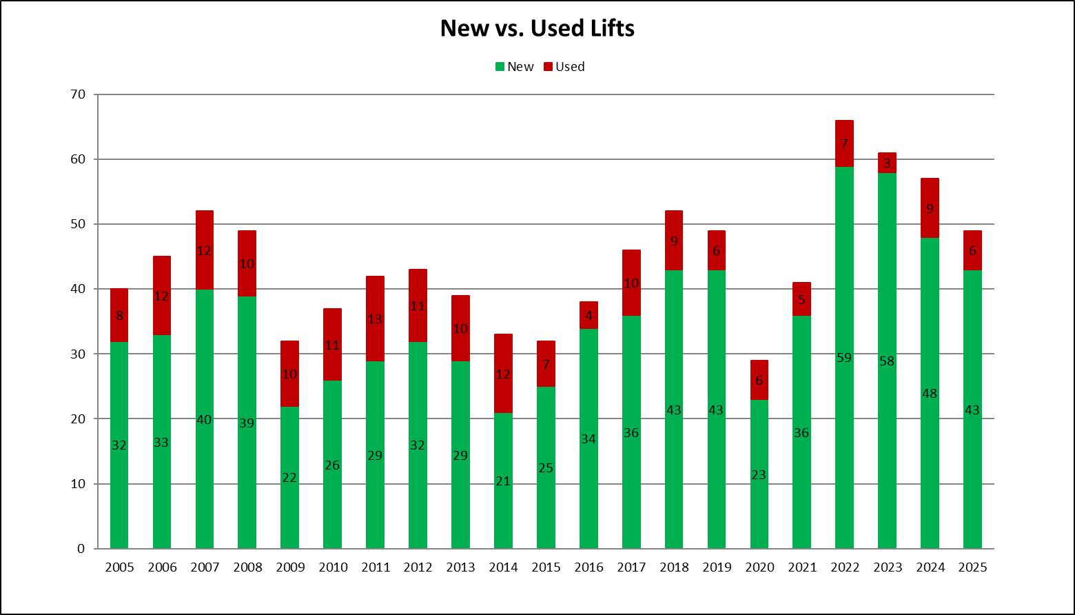 The industry also retired 53 lifts in 2025, three more than last year, at an average age of 42 years. Eight Halls, six Riblets and four Borvigs went to scrap as resorts modernized fleets. Some 211 Halls, 213 Riblets and 118 Borvigs still spin across the continent, however, with more to be replaced in 2026.