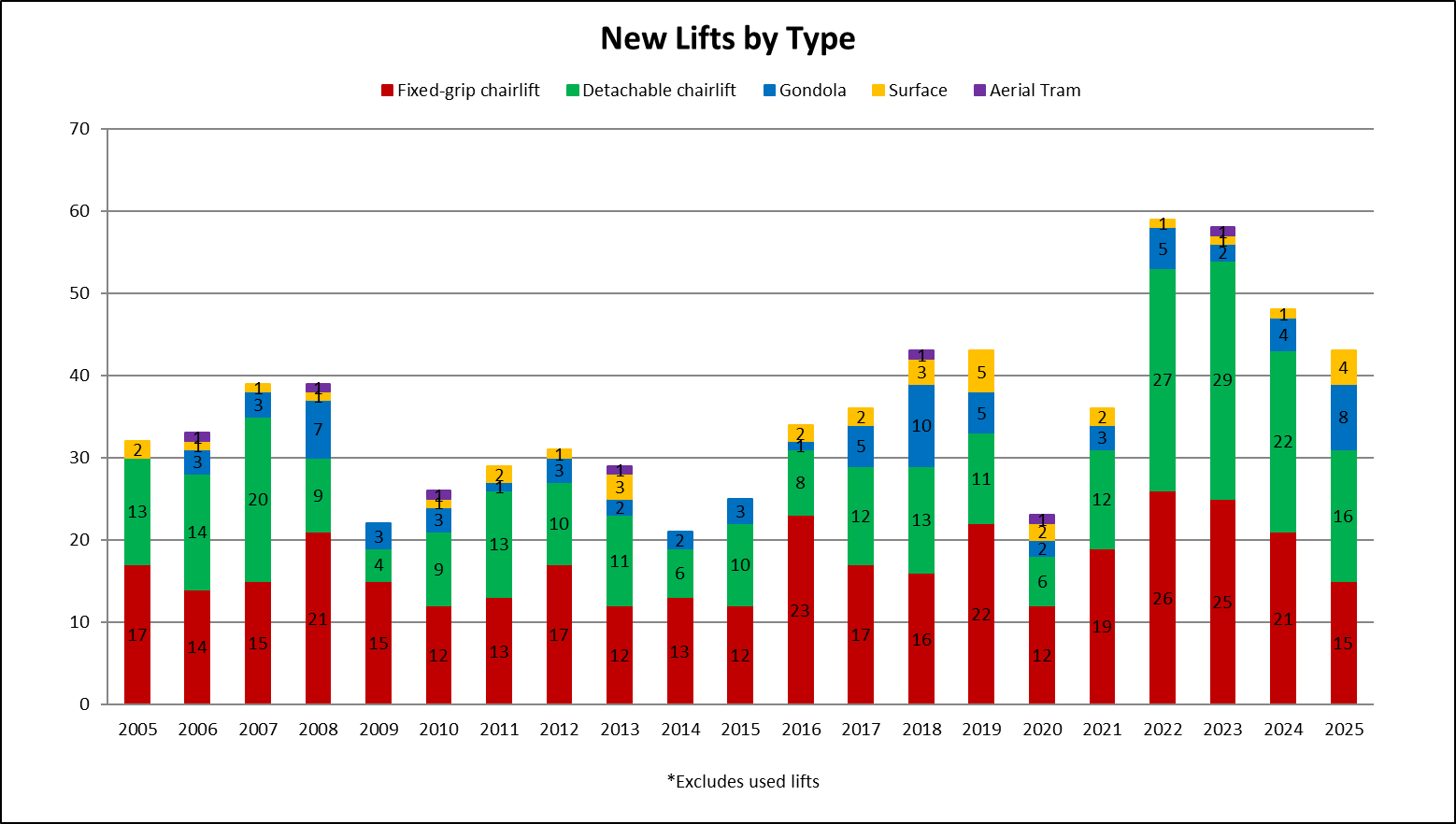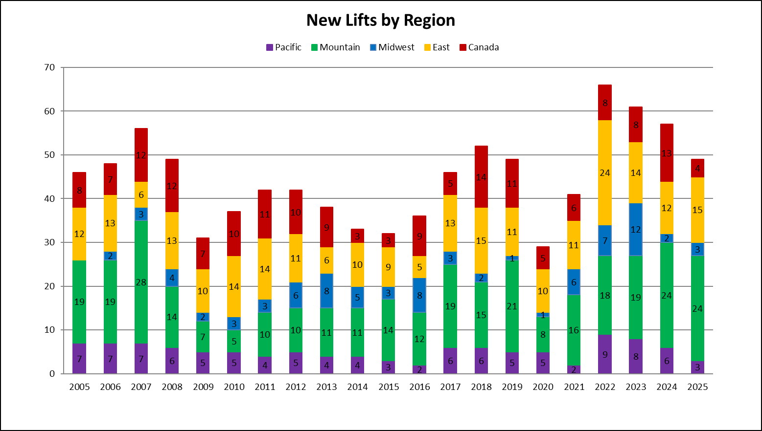 The Rocky Mountain region saw strong investment with 24 lifts opening in Colorado, Montana, New Mexico and Utah. The East also proved strong with 15 new lifts, up by three from 2024. The Pacific states, the Midwest and Canada fared weaker with just a handful of projects each.