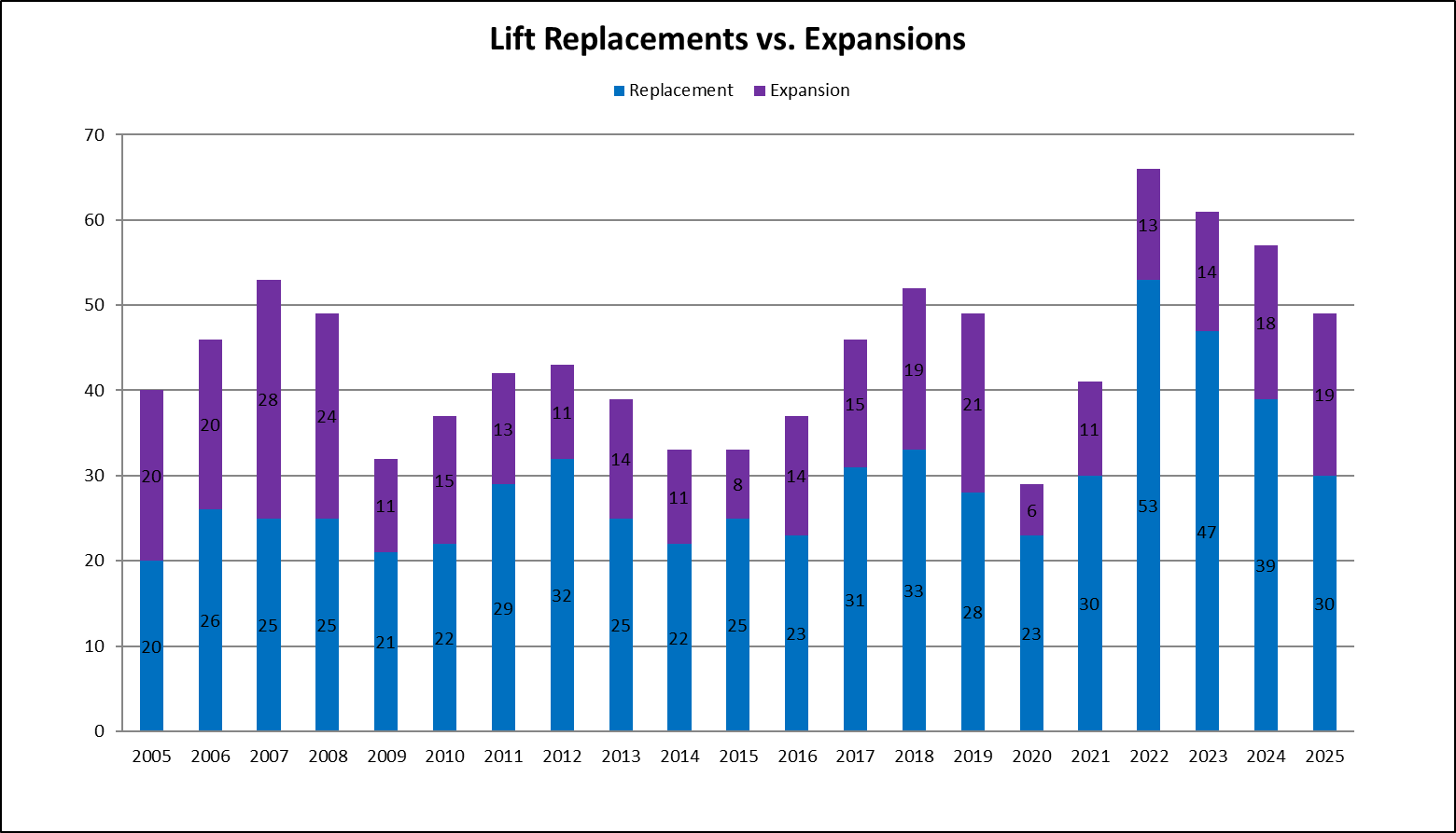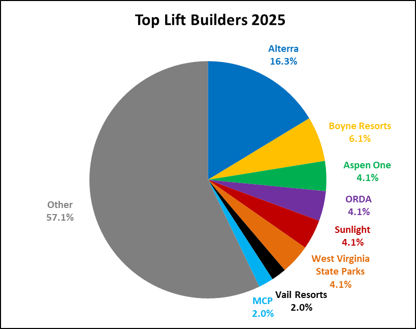 Next year is shaping up to be similar to 2025. Announced new lifts are pacing just slightly behind this time a year ago with 41 installations on my list of likely projects. Several installs initially intended for 2025 were pushed to 2026 including Purgatory’s Gelande triple, Powder Mountain’s DMI and Halfpint lifts, Homewood’s gondola and Bluewood’s summit lift. Several ski areas already announced fresh investments for 2026 including two replacements at Sun Valley, two lifts at Little Switzerland and a new gondola at Sugar Bowl. Independent mountains are poised to continue out-investing conglomerates per capita despite accounting for less than half of skier visits.