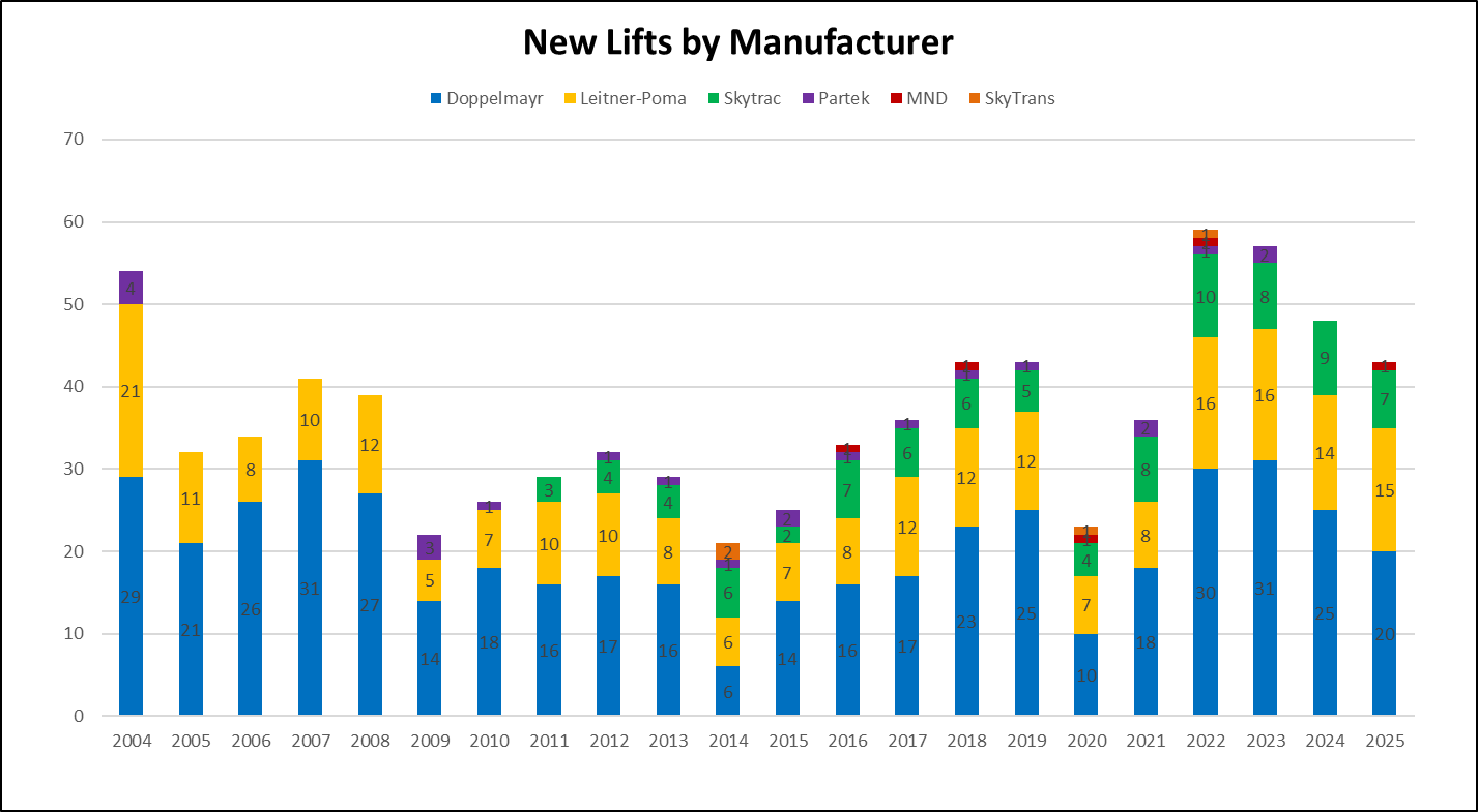 The industry also retired 53 lifts in 2025, three more than last year, at an average age of 42 years. Eight Halls, six Riblets and four Borvigs went to scrap as resorts modernized fleets. Some 211 Halls, 213 Riblets and 118 Borvigs still spin across the continent, however, with more to be replaced in 2026.