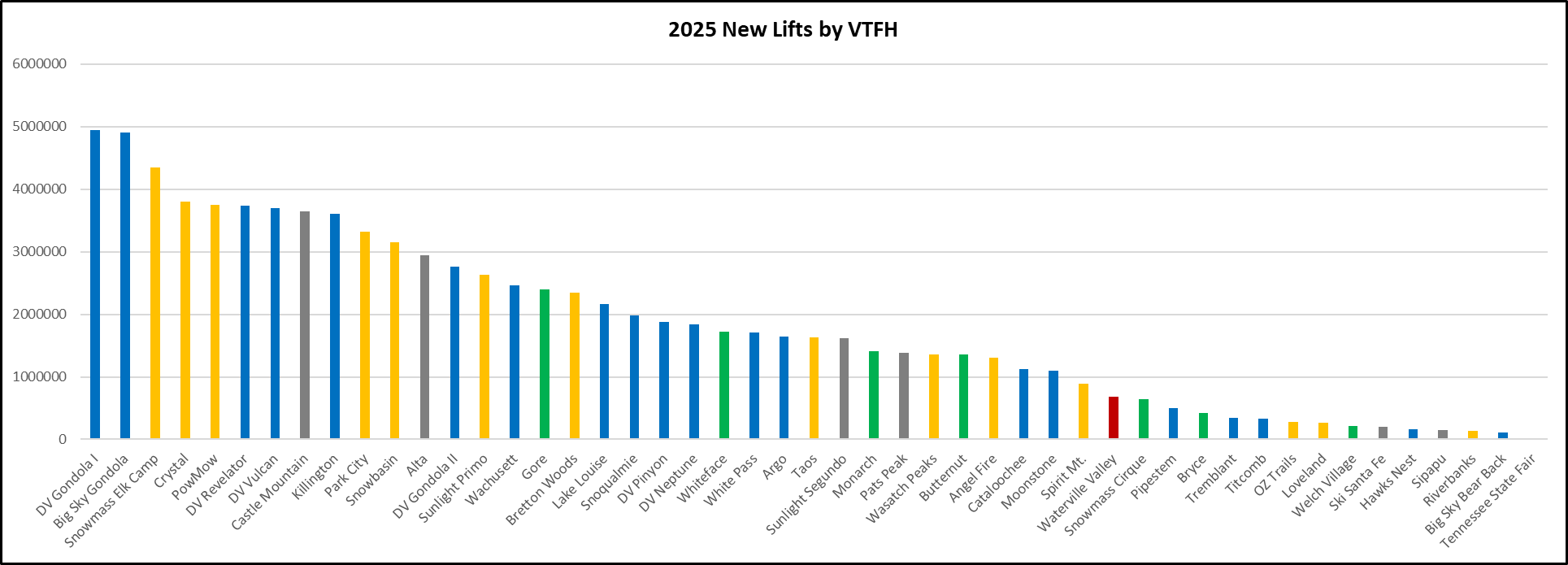 Deer Valley’s new gondola earned largest new lift of the year followed by Big Sky’s Explorer Gondola then Elk Camp Express at Snowmass. Both Doppelmayr and Leitner-Poma engineered lifts across the VTFH spectrum while Skytrac and MND lifts skewed smaller.