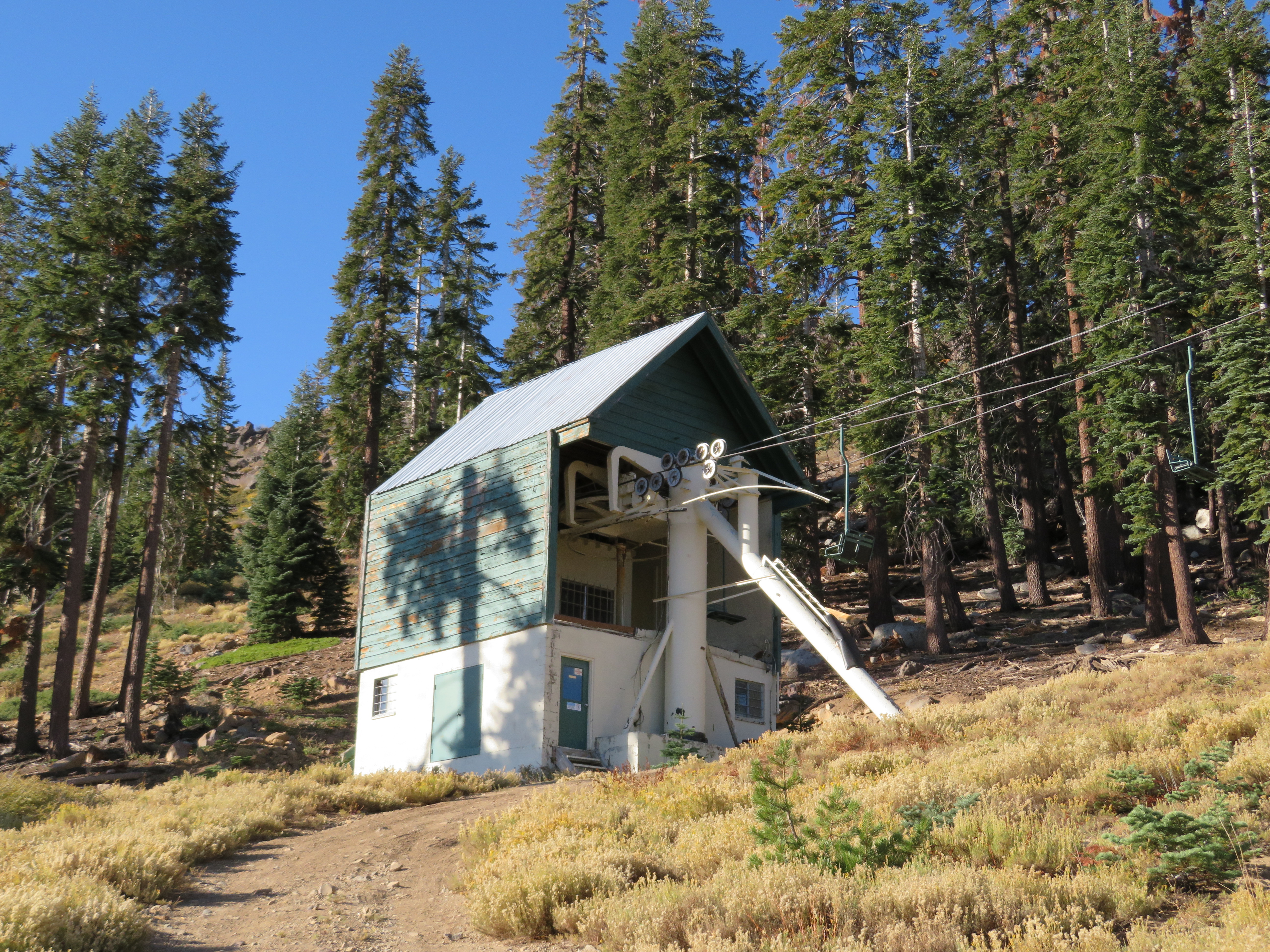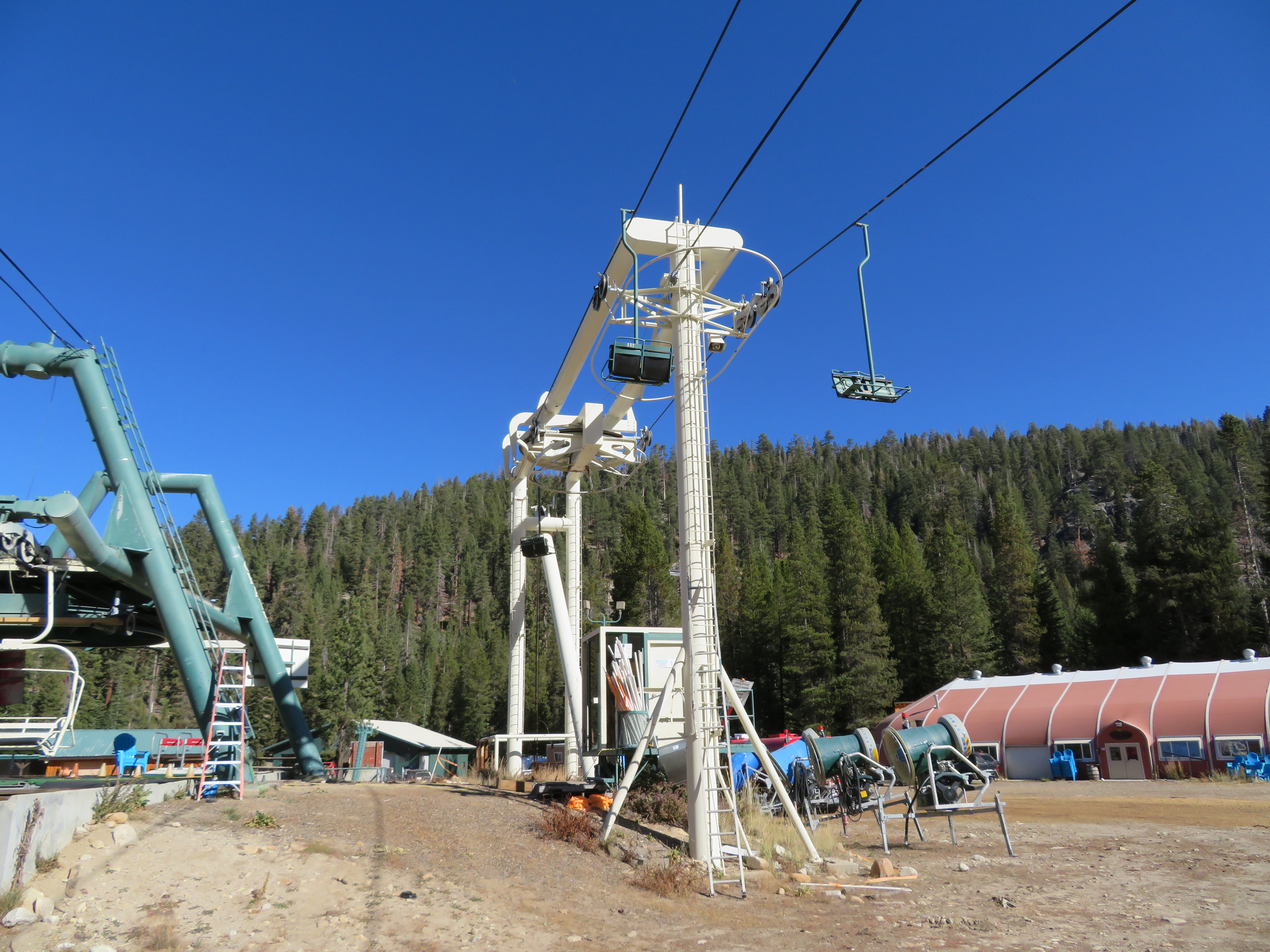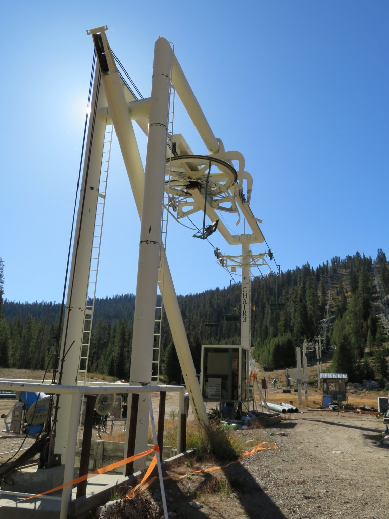 This classic Riblet serves mostly as a backup to Lift 1.It probably has well over 30 towers.Top station with a vault drive.Breakover towers.Flyover unloading with height adjustment ability.Similar setup at the load.The return tension station is really tall!Tension bullwheel carriage.Counterweight.View up the lift line.