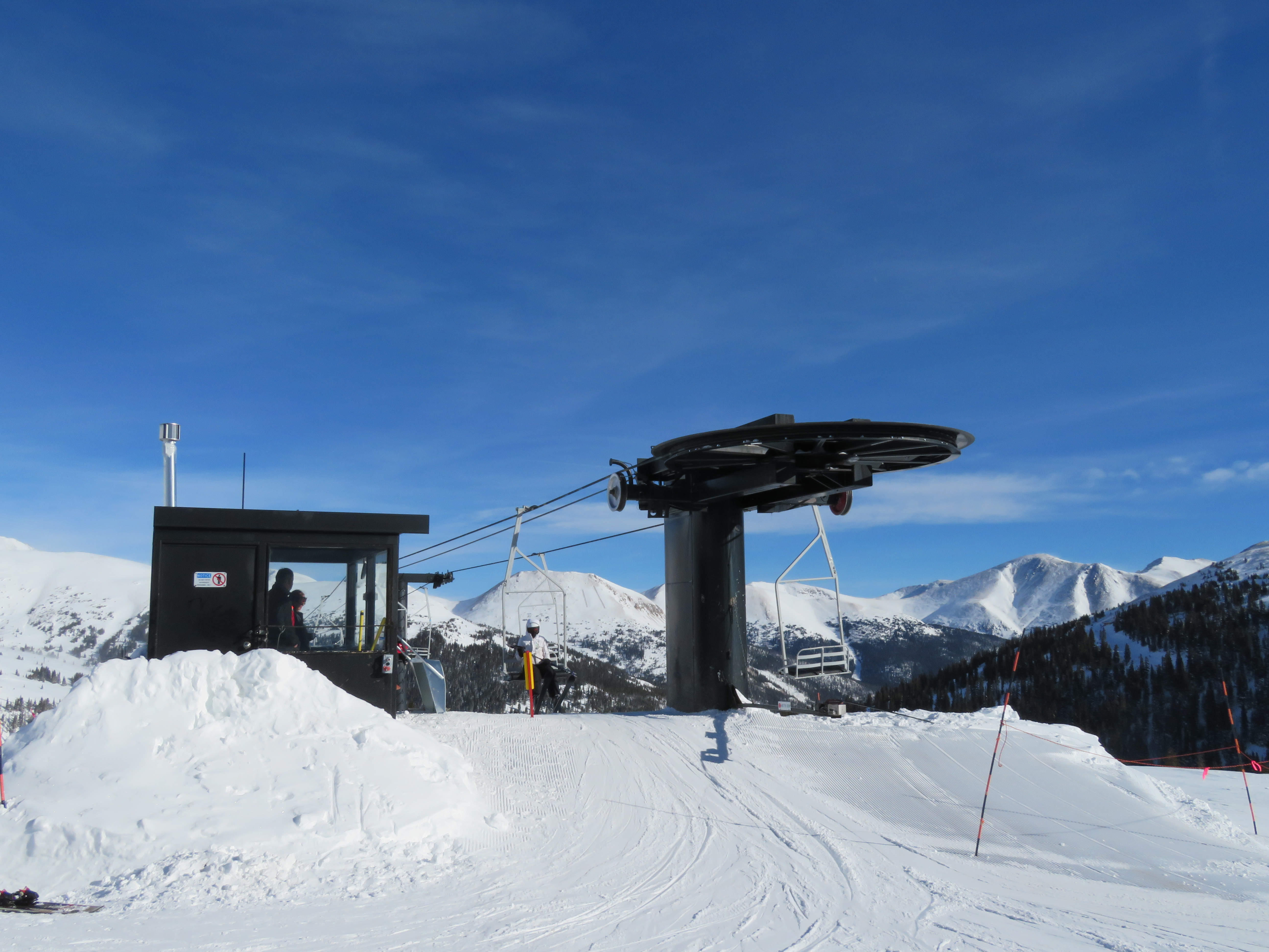This is the oldest remaining lift at Loveland.It crosses under Chair 2.Drive/tension station from below.Another view of the first two towers.Motor room and loading area.Side view of the drive.View up the lift line.Upper lift line.Nearing the summit.Arriving up top.Fixed return bullwheel.Line overview.Lower lift line.