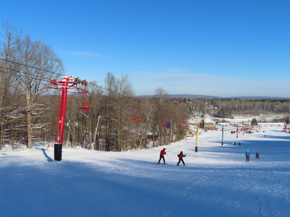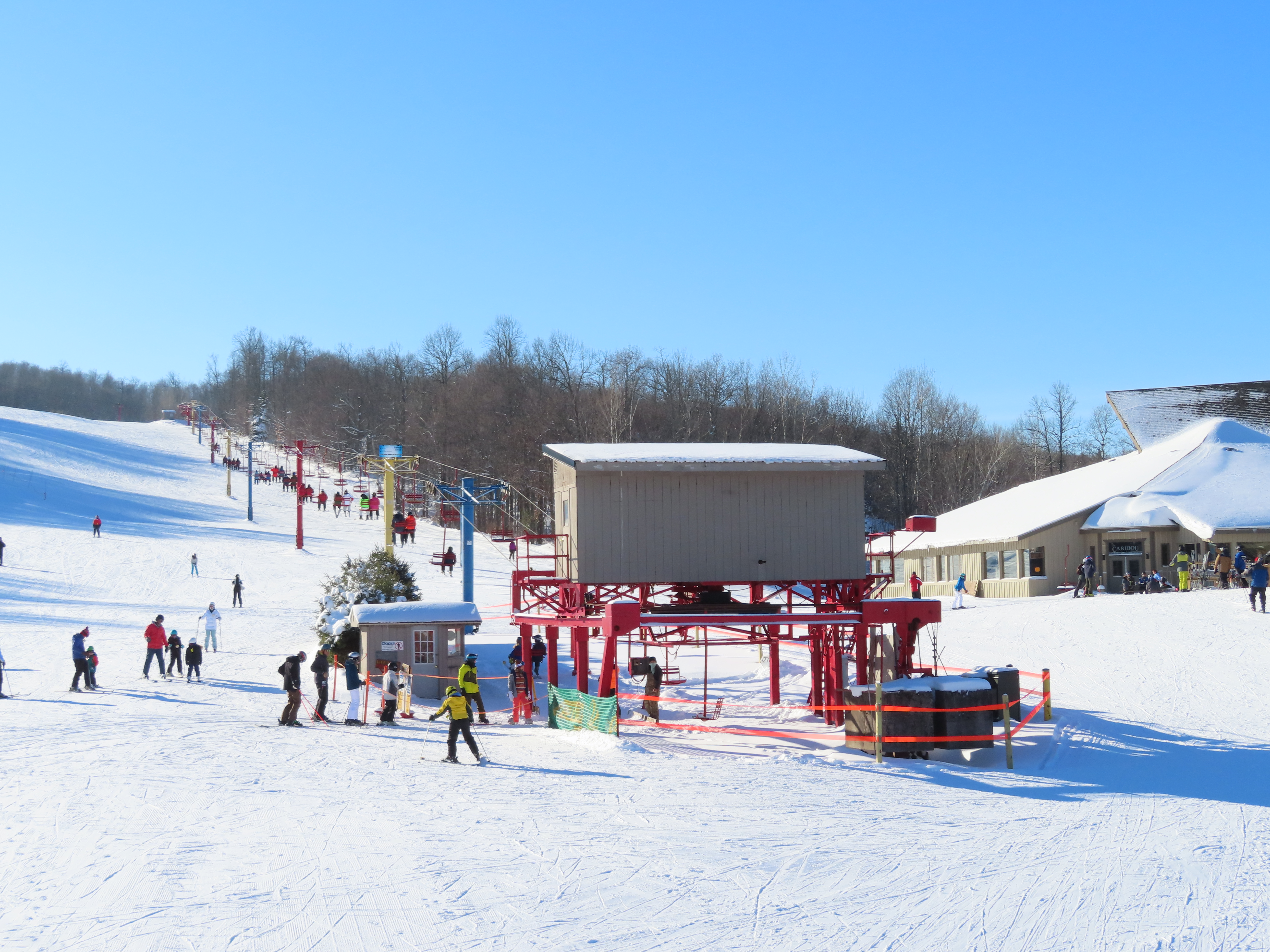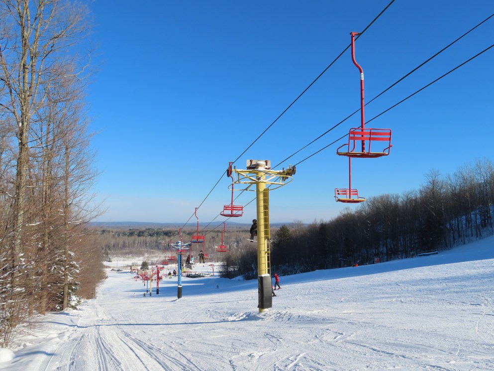 This is the only true beginner chairlift at Big Powderhorn.Also the only lift here not painted all red.Arriving at the top terminal.Lift overview.Return bullwheel with added roof.Looking down the line.The last three towers in three different colors.Middle part of the line.Drive station seen from above.The entire lift seen from Chair 6.