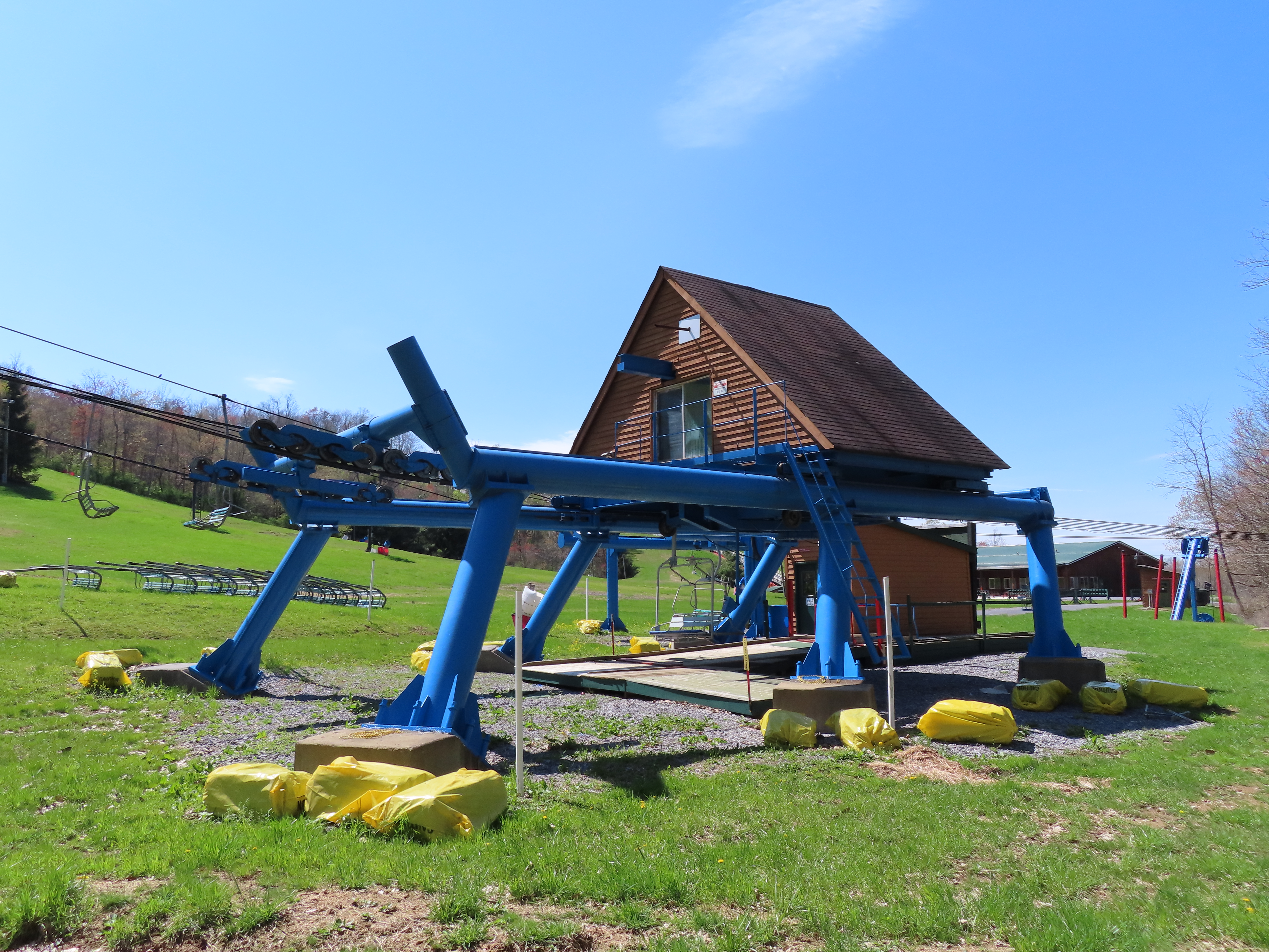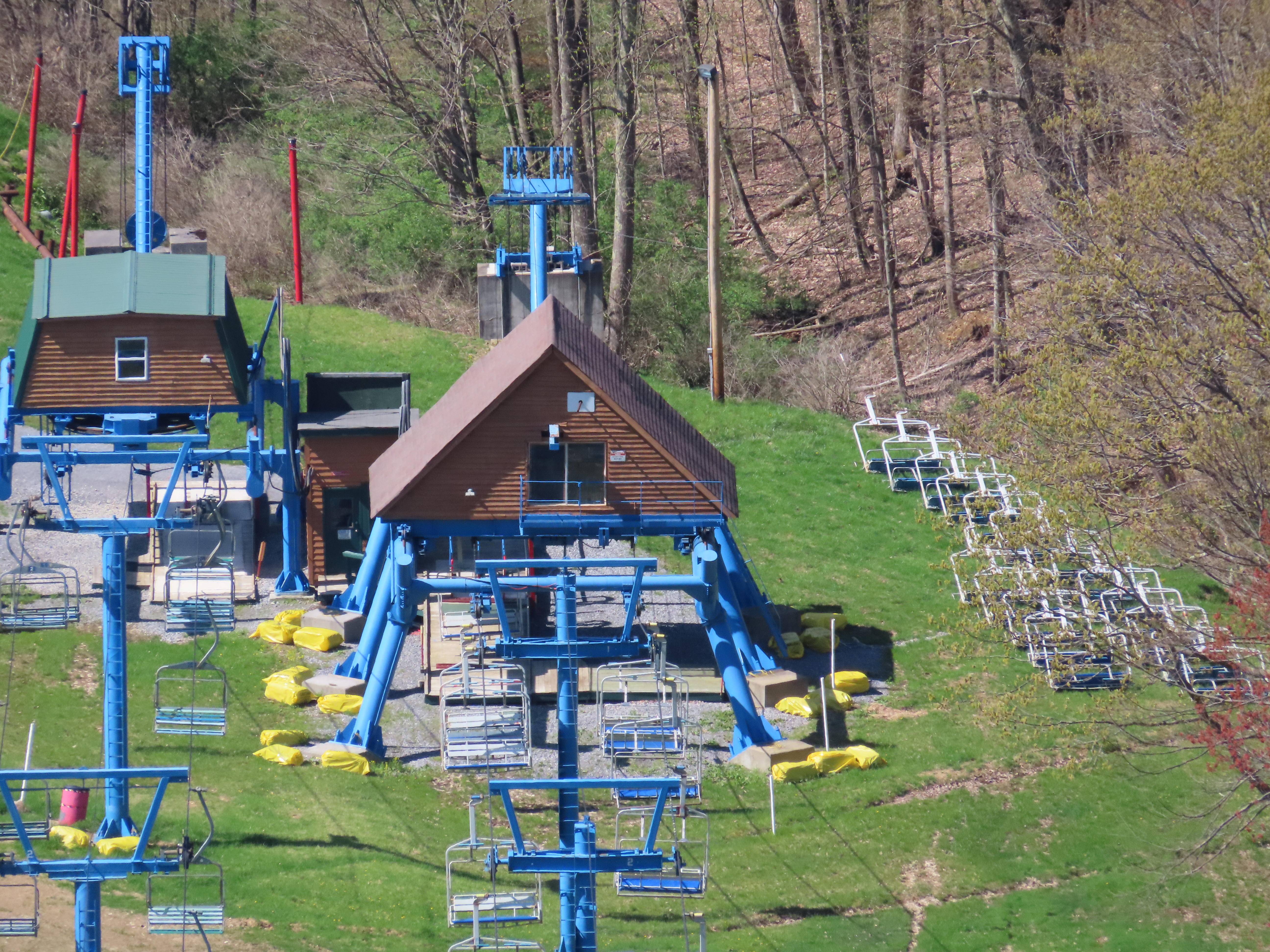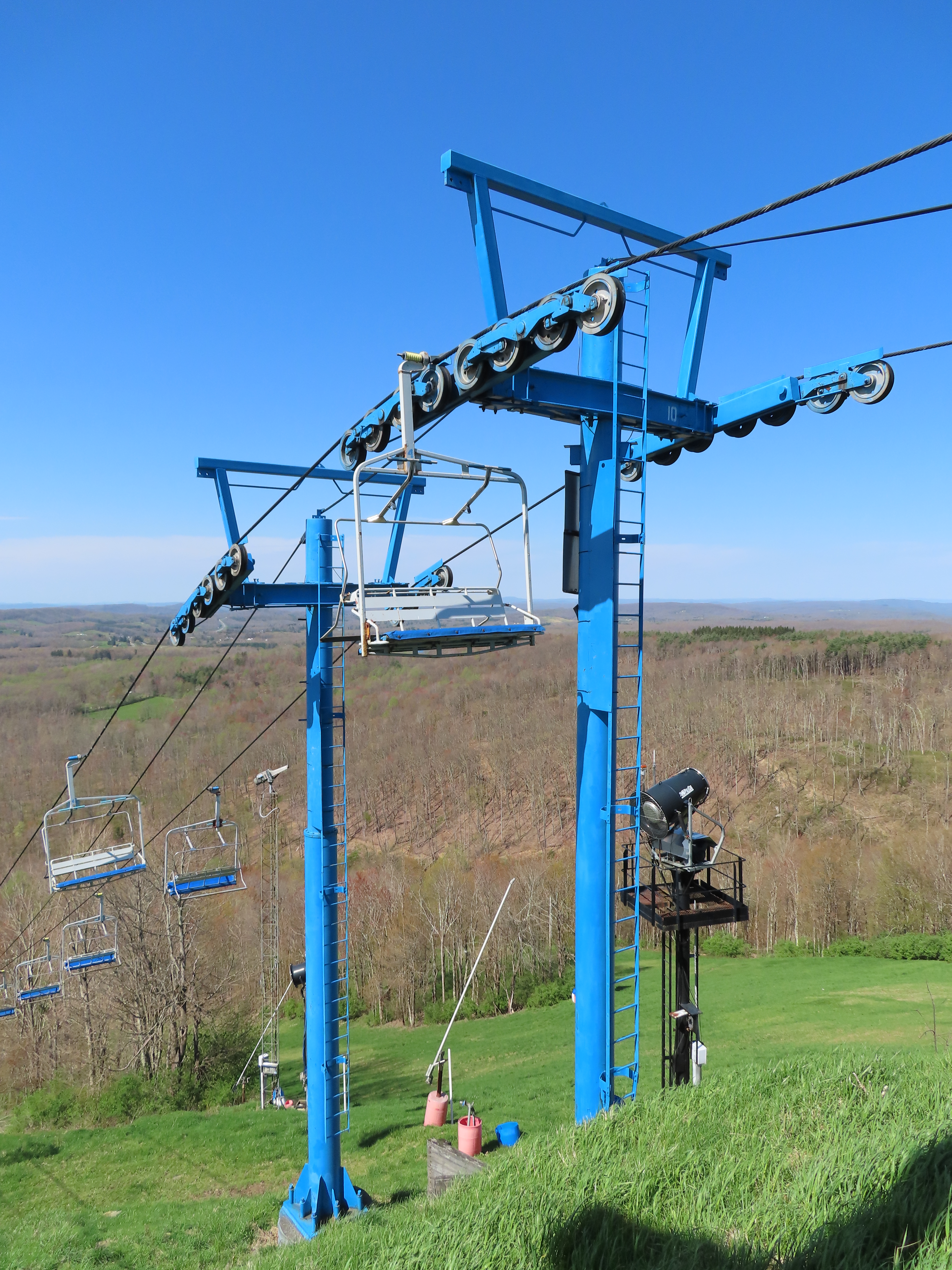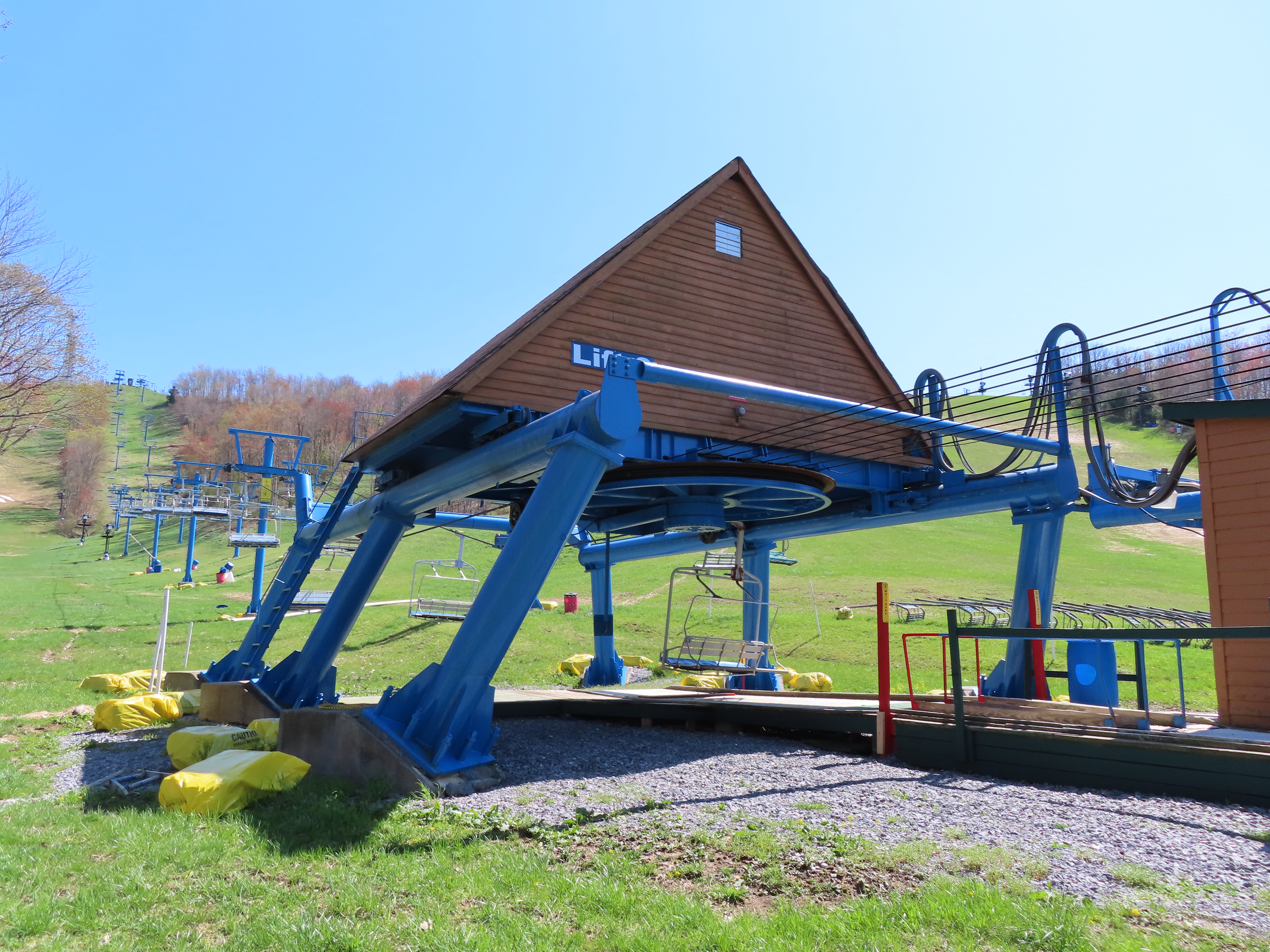 This unique VonRoll quad services the upper mountain.Side view of the bottom terminal.View up the lift line.Loading area.Breakover towers.Looking down from the summit.Top terminal bullwheel.The last two towers.The loading terminal is right next to the one for Lift 3.