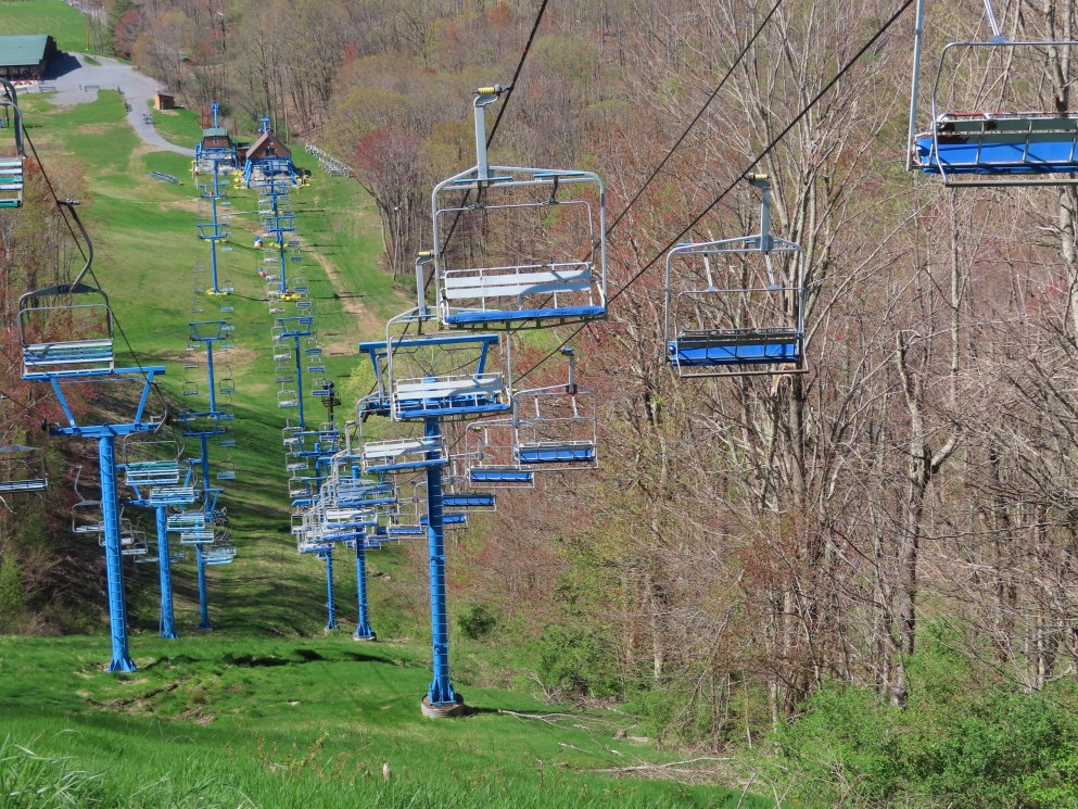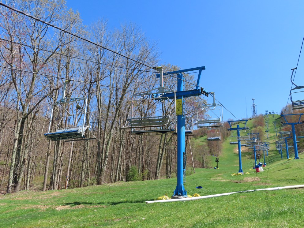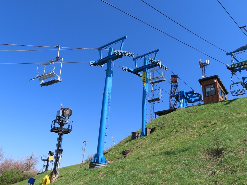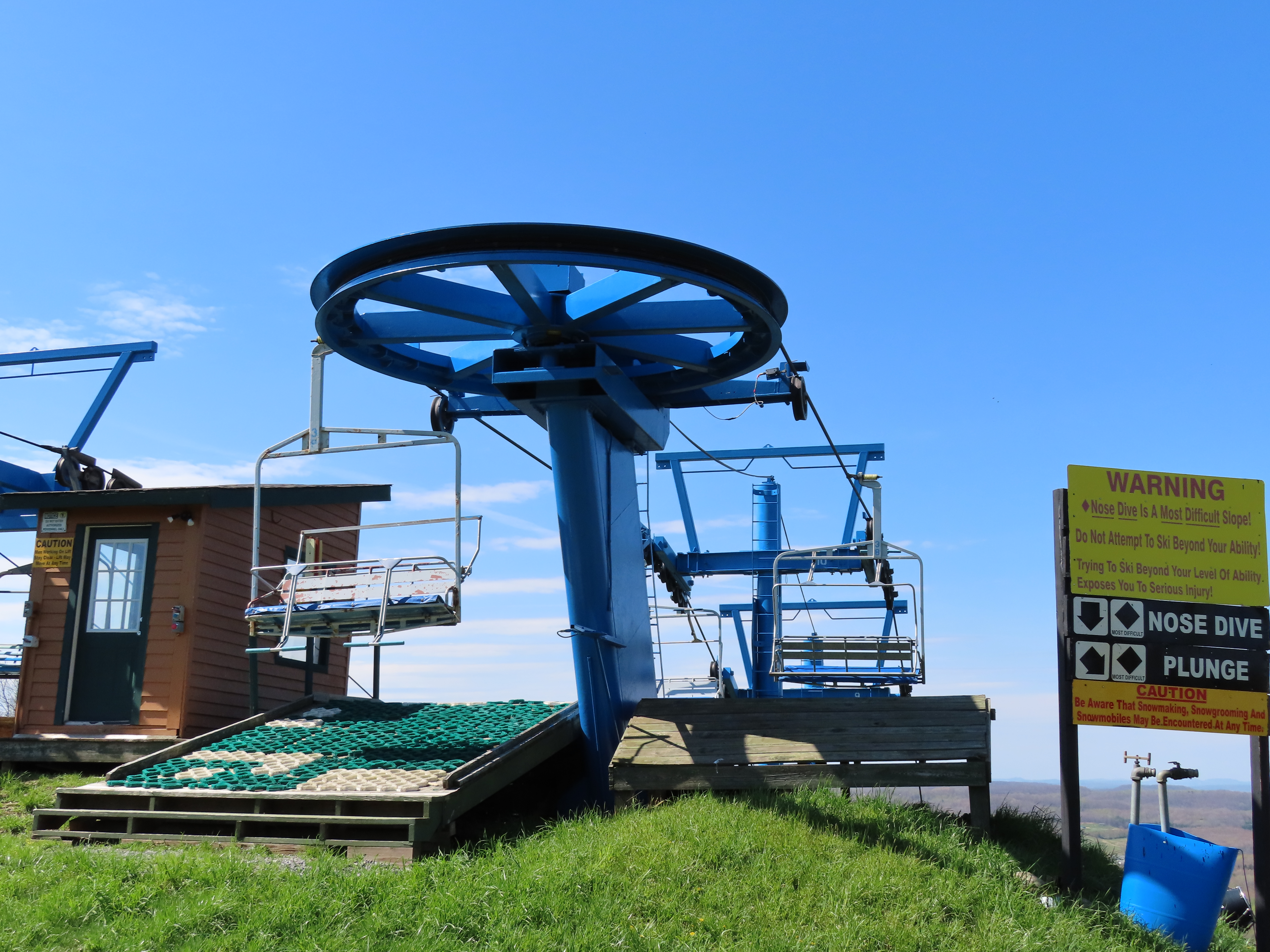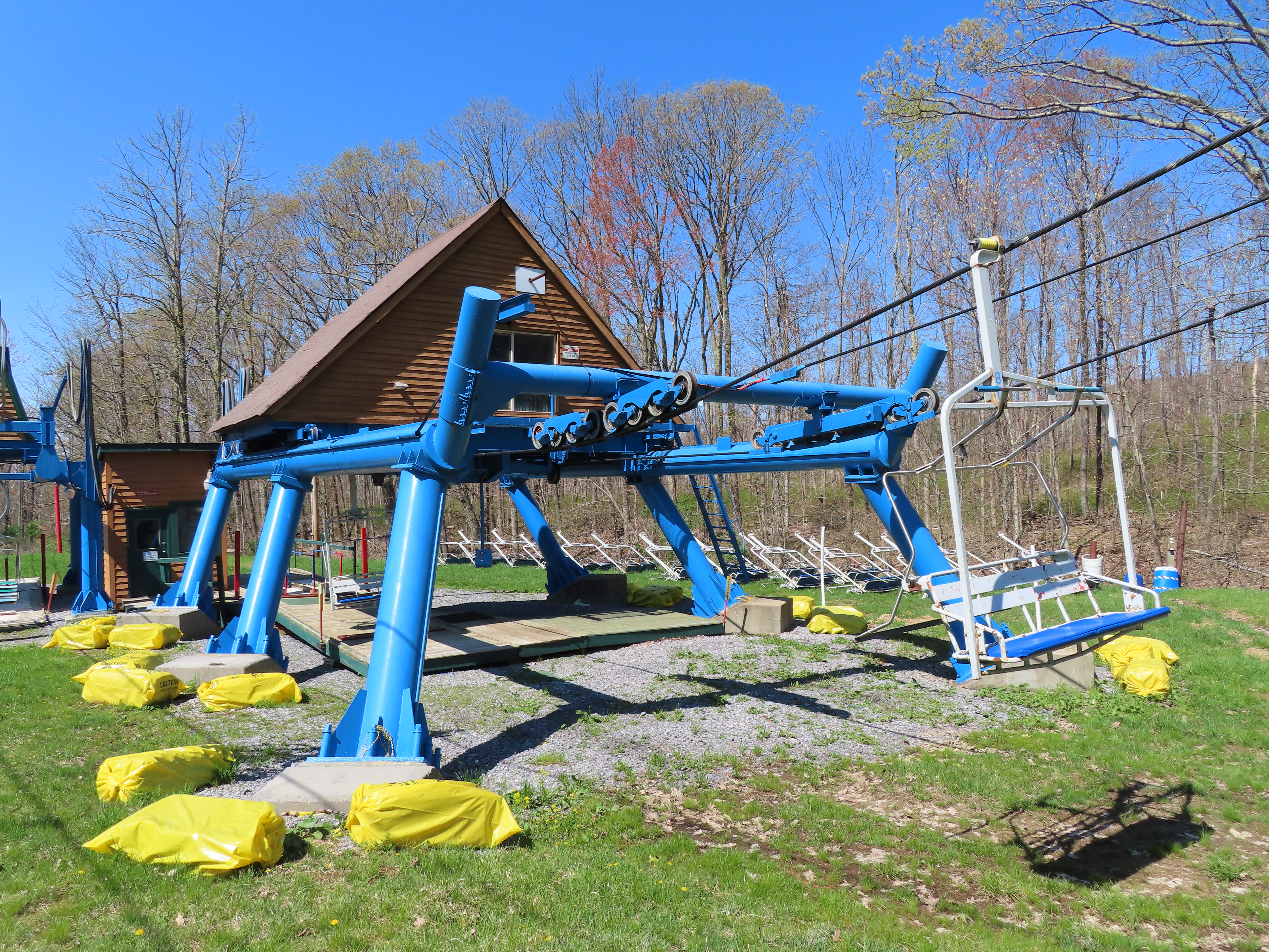 This unique VonRoll quad services the upper mountain.Side view of the bottom terminal.View up the lift line.Loading area.Breakover towers.Looking down from the summit.Top terminal bullwheel.The last two towers.The loading terminal is right next to the one for Lift 3.