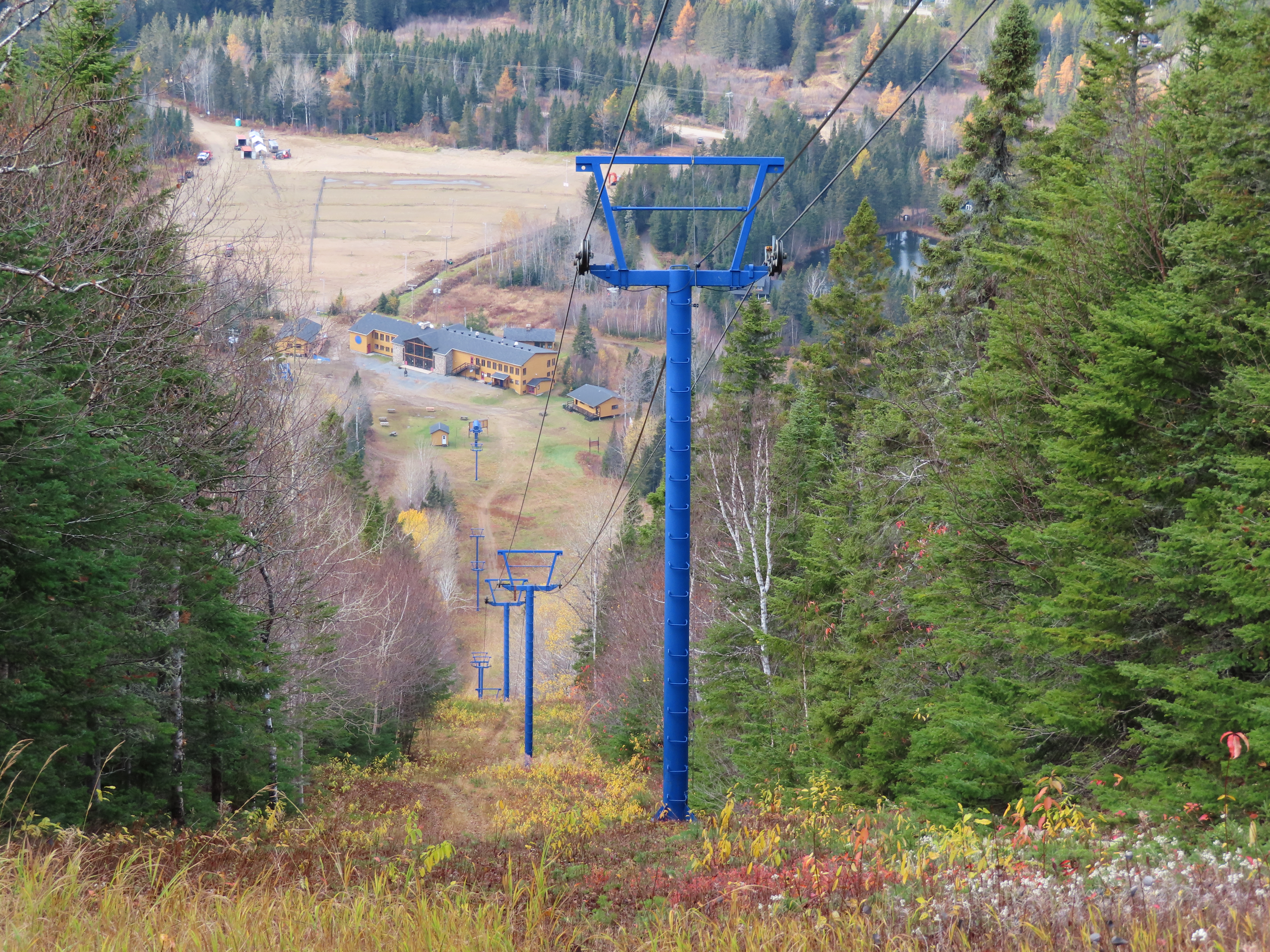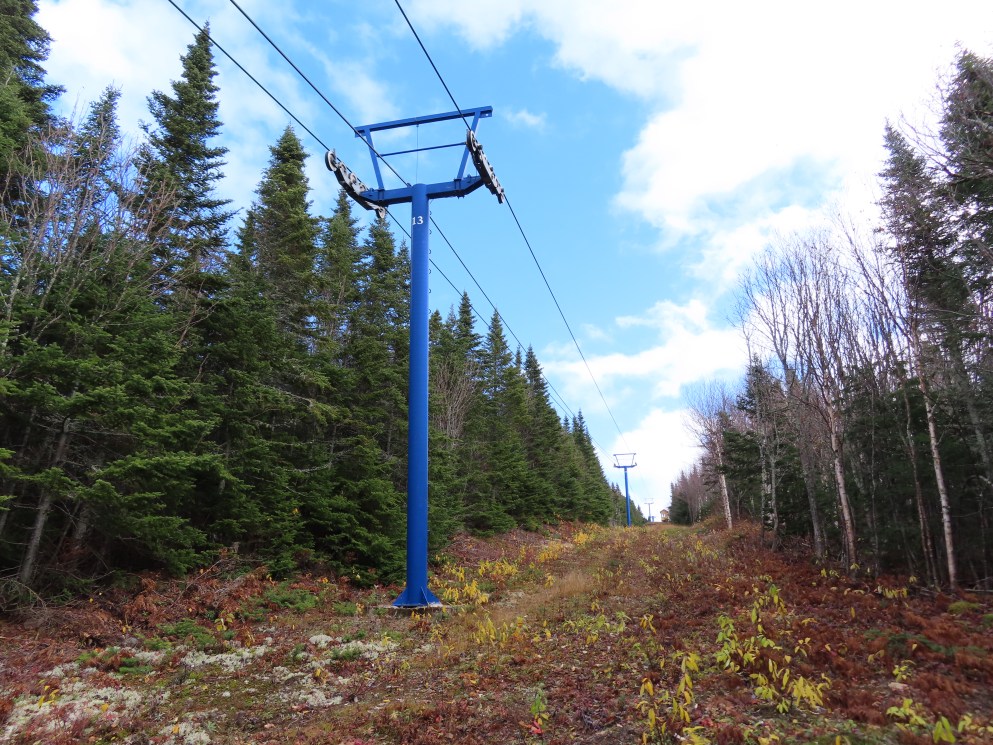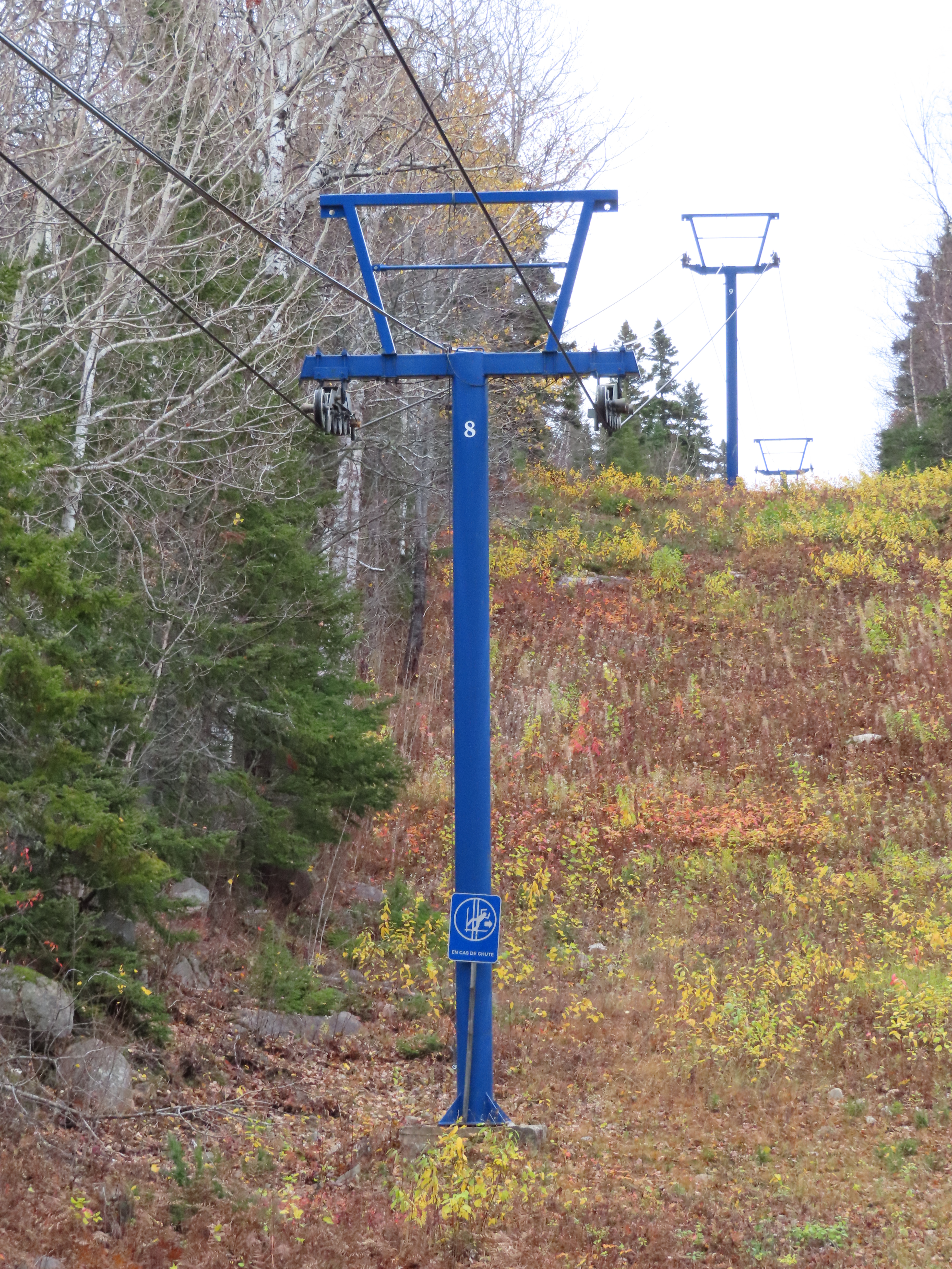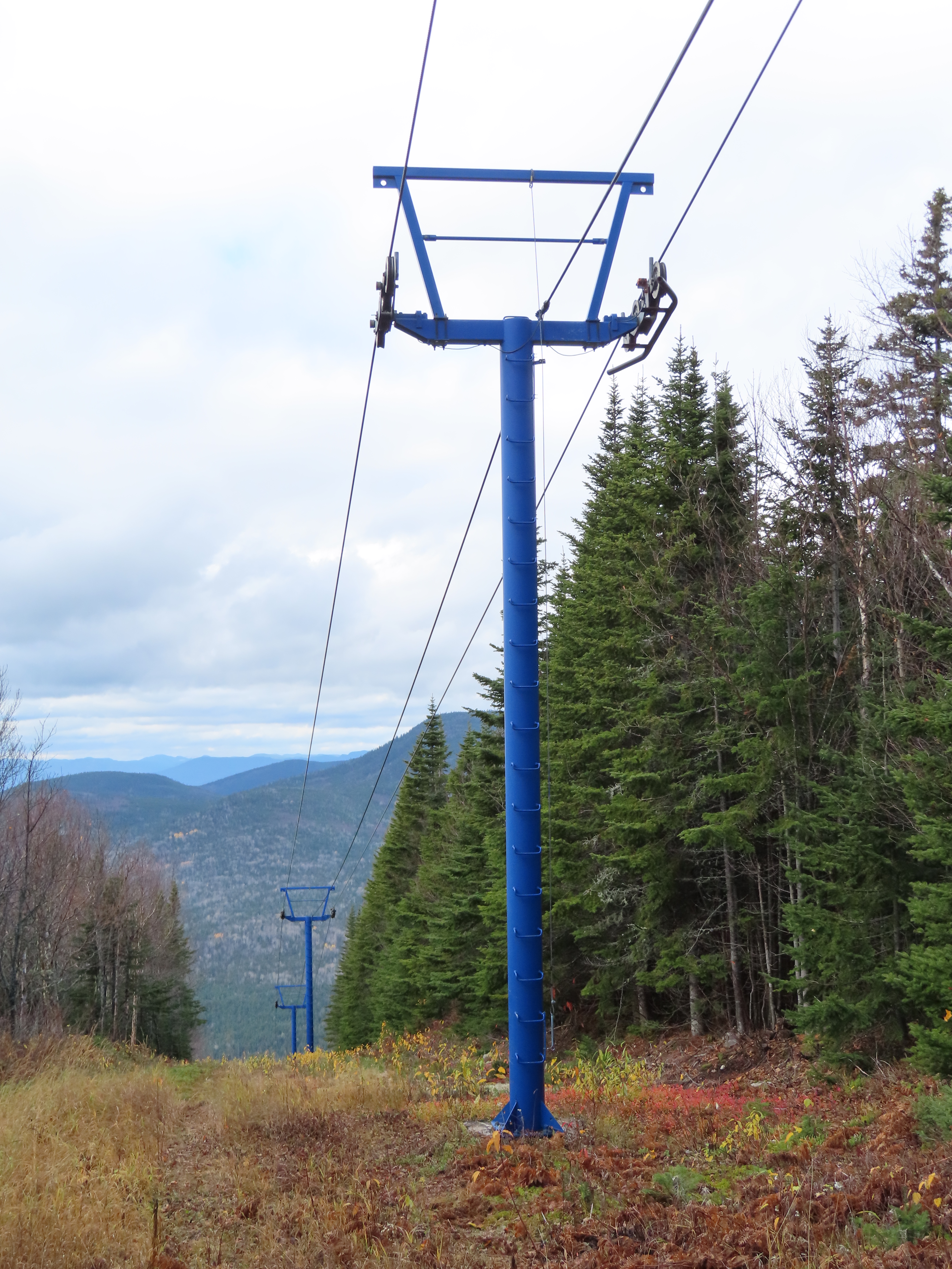 This large Samson T-Bar runs from base to summit alongside a Samson quad.The lift line.Unique bottom terminal structure.Top station with floating bullwheel.Unloading point.Tower 15.Breakover towers.Tower 13.View down the line.Middle section of the lift line.One of a few hold down towers.Towers near the base.T3.View up the middle of the line.
