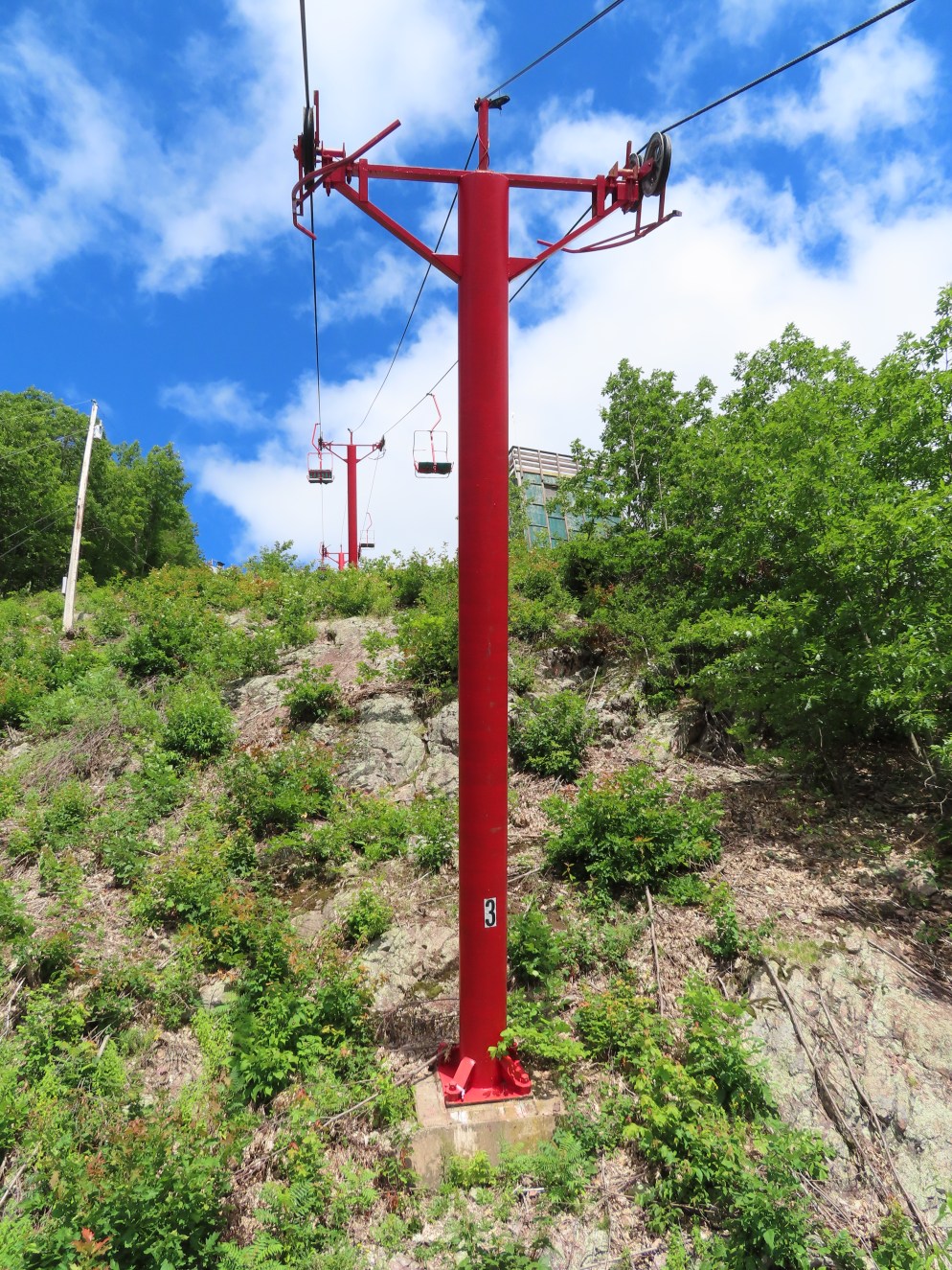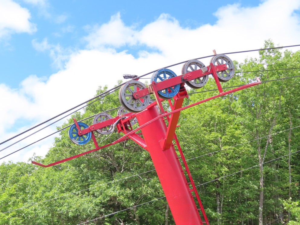 This unique lift services a ski jump and observation tower.Drive terminal.Portal tower.Counterweight.The second tower is a big hold down.Miner-Denver towers.View down the very steep lift line.Tower 5 and the ski jump.Top terminal.Top of the lift seen from above.Sheave assemblies.Tower 3.Chair with foot rest.Sheaves on tower 2.Lift overview.