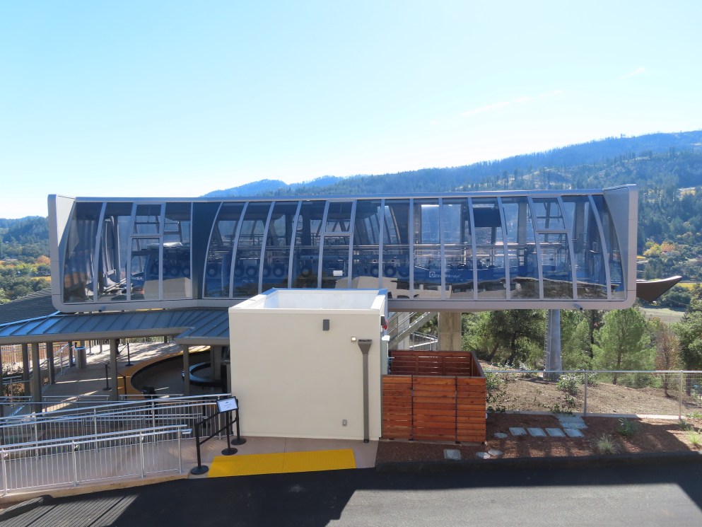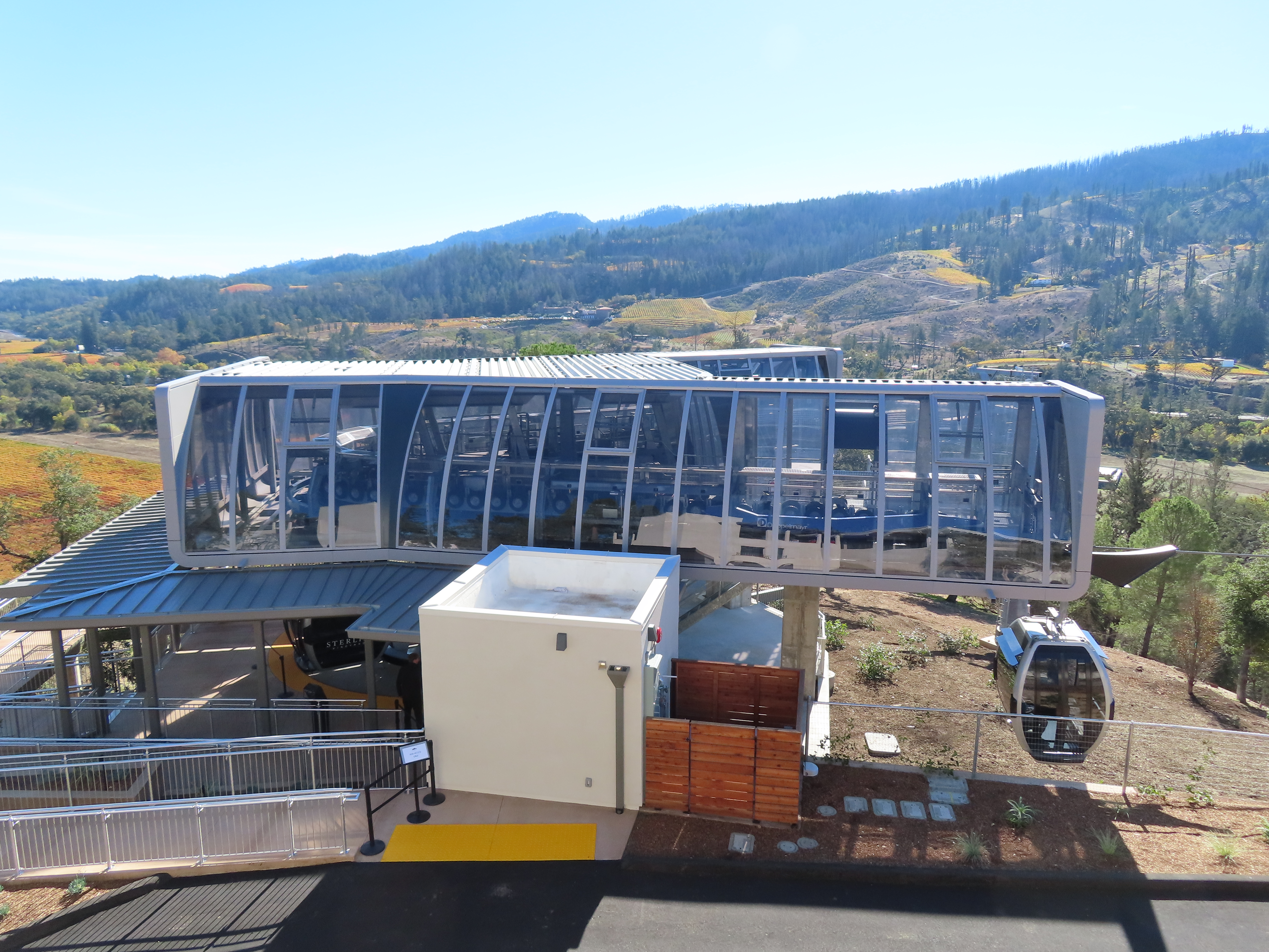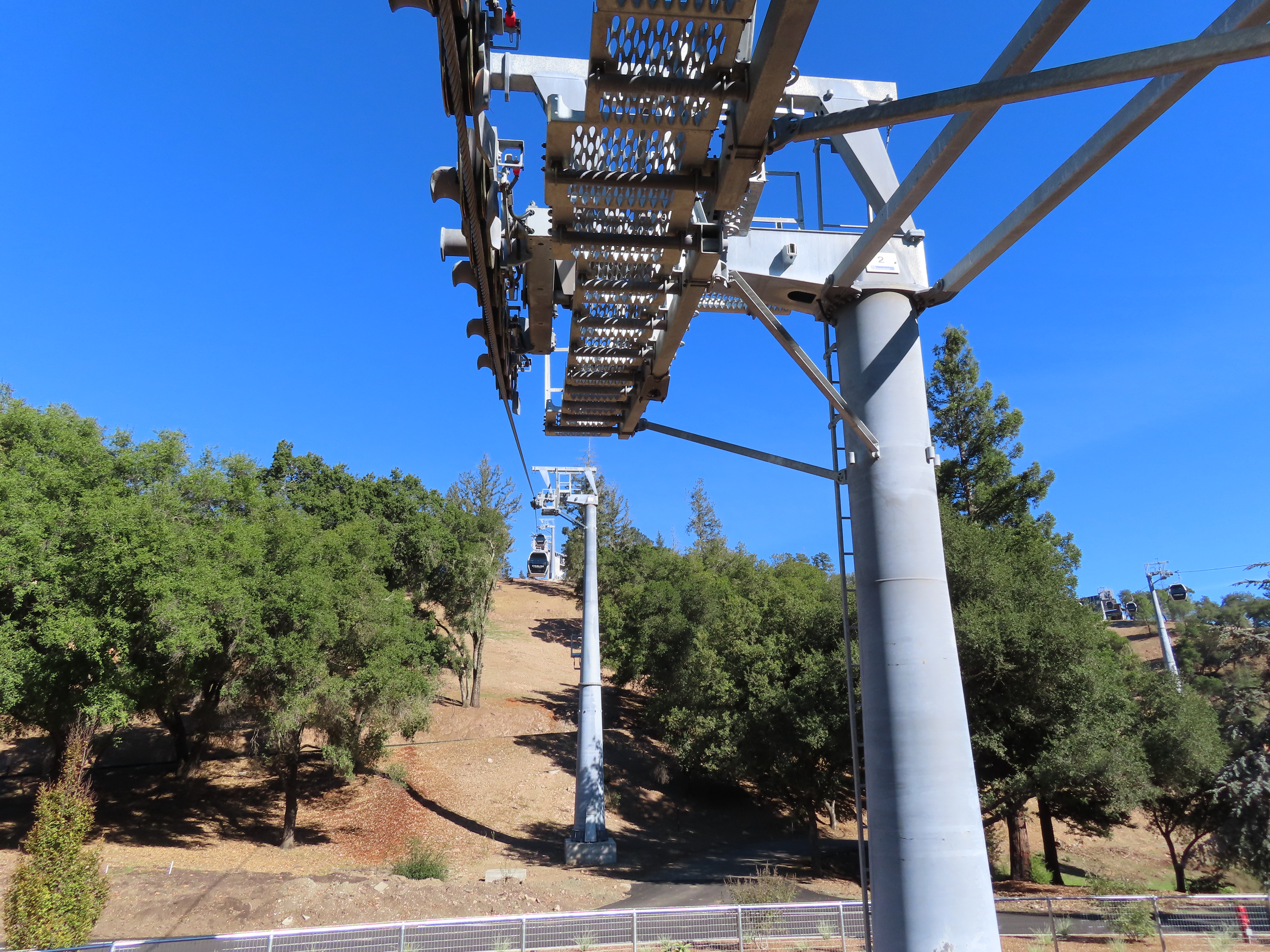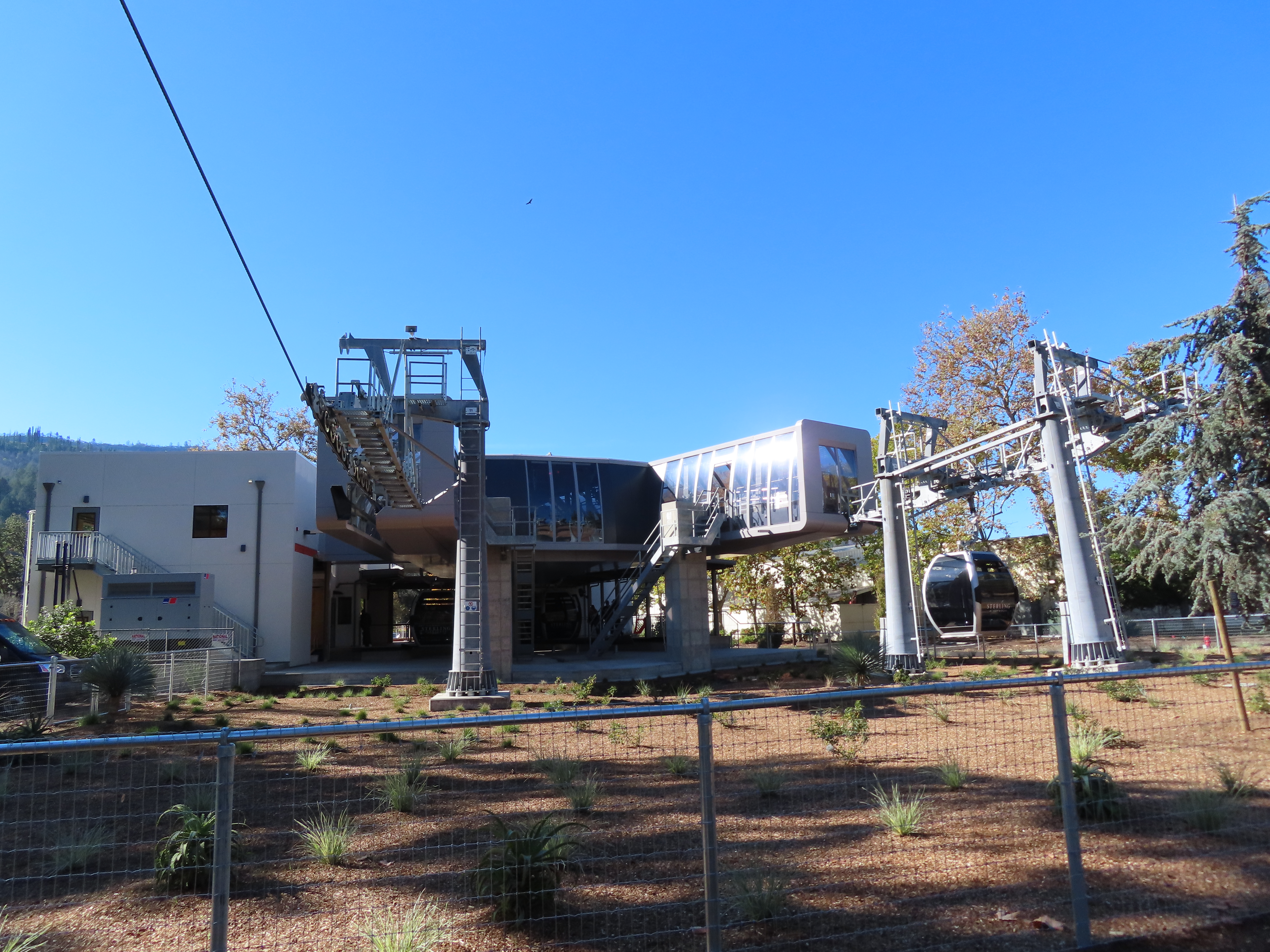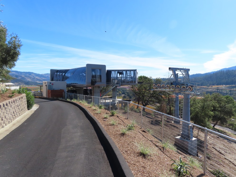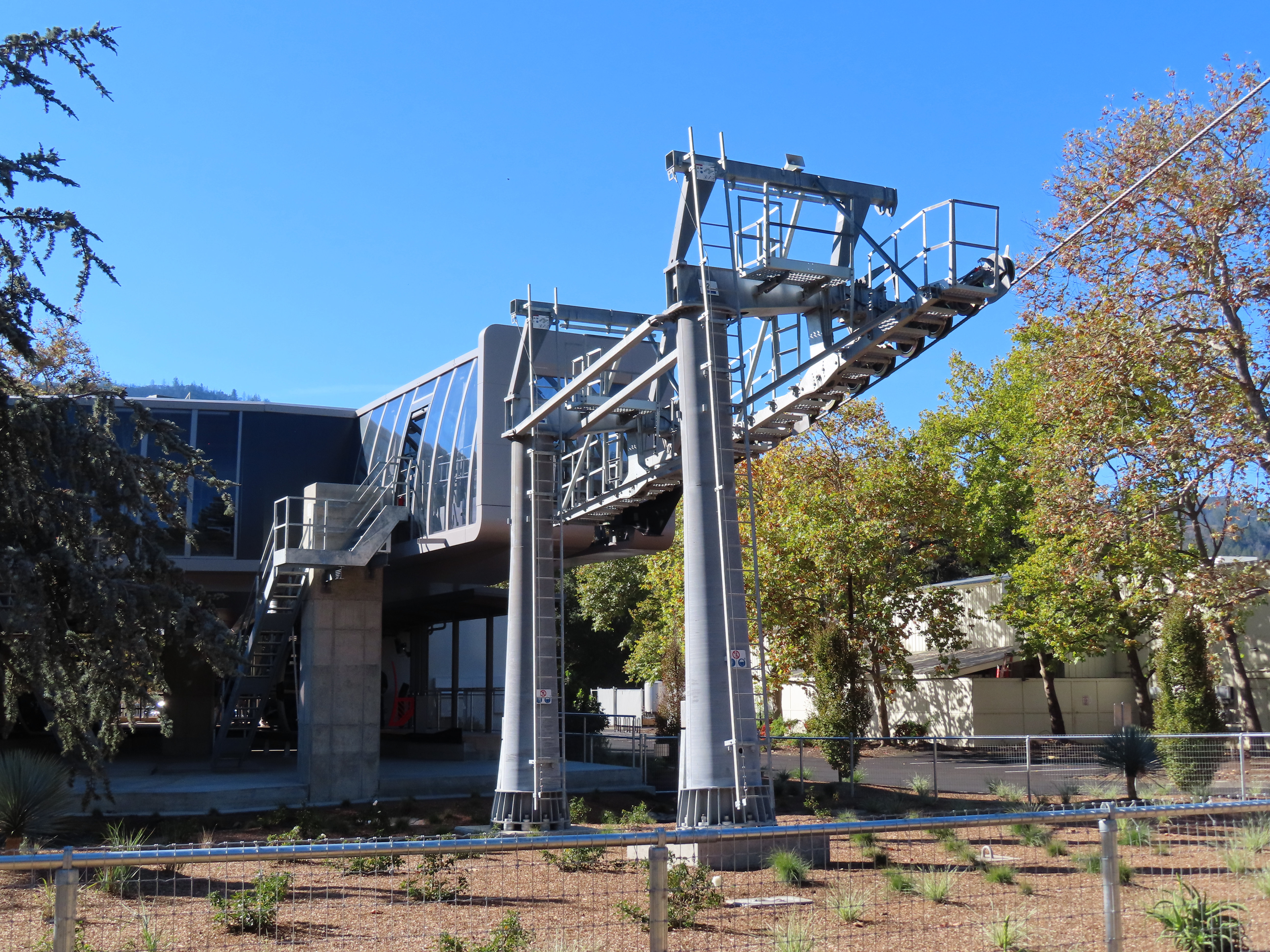 This D-Line gondola replaced an older four person gondola in a similar triangle alignment.Visitors load at the bottom station and travel up to tasting rooms and a gift shop with an intermediate station along the way.Tower 3.The first two towers at the drive station.All three stations are angled with cabins travelling one way.Tower 9, the tallest on the entire lift on the downhill portion of the line.Tower 11.Overview of the base station with small maintenance area.Tower 10.The loading area.An Omega V cabin in the bottom station.View departing the lower terminal.Bottom station seen from above.Towers 1, 2, 3 and 11 near the lower terminus.View riding up the first segment of the line.Nearing the first angle station and tower 5.View back down the lift line.Short middle section between the two non-drive stations.This station has no loading, unloading or operator.Short tower 6.View arriving at the wine tasting station.Doppelmayr Connect controls.Each station is wheelchair accessible, unlike the old gondola.Side view of a tower and Omega IV cabin.View along the ridge top.Another view of the unmanned station.Hilltop station with half towers.View of the gondola from the vineyard’s terrace.Upper station overview.Doppelmayr detachable equipment.Side view of a short D-Line station.Tower 7.Eight passenger cabin.Another view of the third station.Loading area at the summit.Doppelmayr USA operates and maintains the gondola on behalf of the vineyard.A cabin in the station.View leaving the ridge.Half station.Tower 8.Tower 9.View of the vineyard estate from the gondola.Arriving back at the base.Cabins traveling one way down the line.The lower station and towers.Another view of the drive station.Cabins traveling along two different segments.Unmanned terminal seen from the valley.