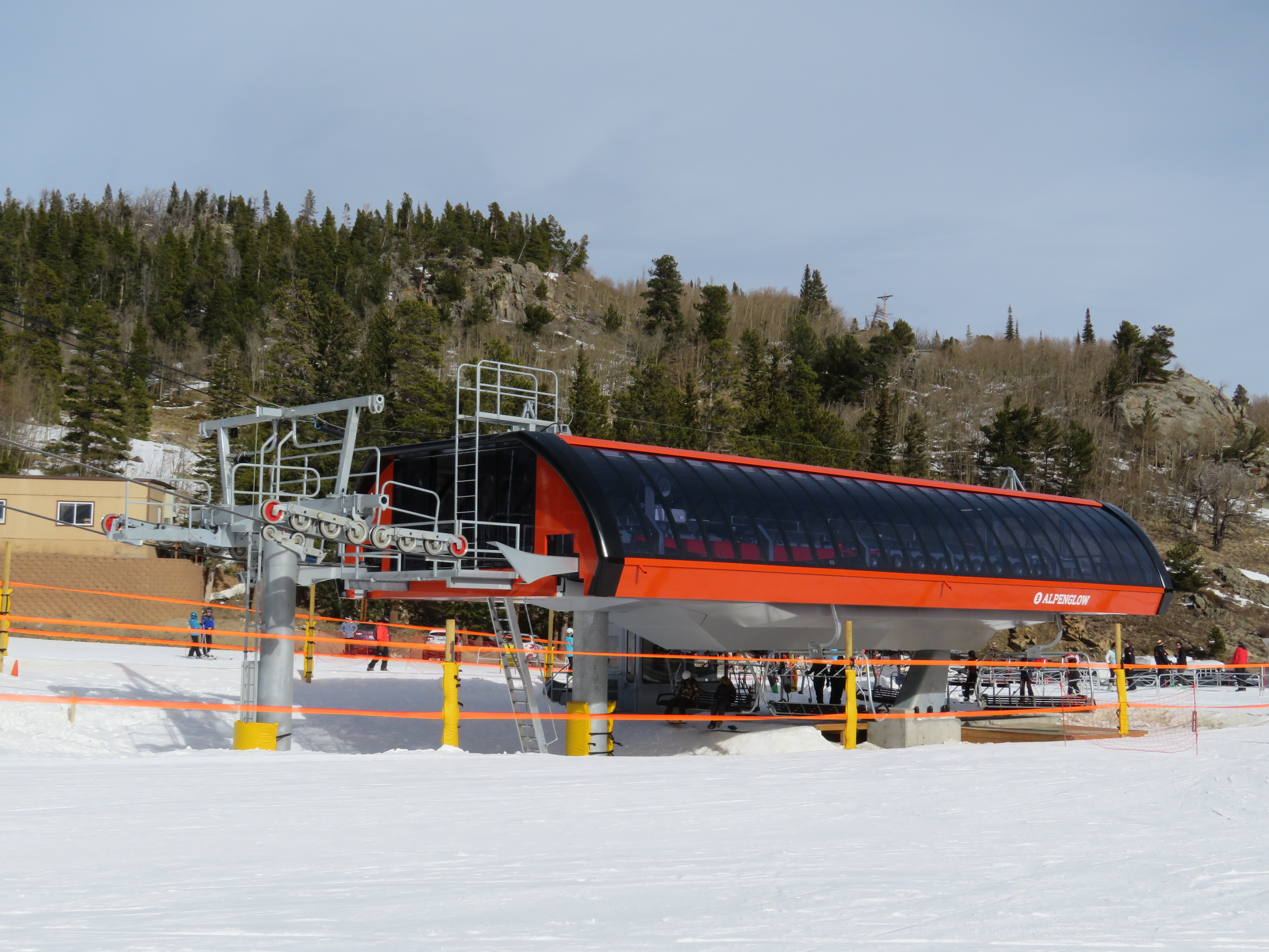 This visually striking lift replaced two older fixed-grip lifts as part of a major rebranding of Eldora following new ownership.It was originally slated to be red and called Eldo Express but plans changed with the new brand.Lift line seen from the base area. Ride time is just 4.1 minutes!Tower 1.Lift overview.Uni-G terminal and a depression tower.This lift has all the bells and whistles including a Chairkit loading carpet.Riding up the middle part of the line.View back down.Breakover towers.Nearing the top terminal.Unloading ramp and maintenance rail.Terminal underskin at the drive.View down the lift line.Lower section of the lift.Steep face of the line. Note the old lift line to the right.Towers 1-3.Optional porch on the Uni-G station.Top station end.Another view of the top terminal.Side view of the return terminal.Inside the motor room up top.Electric motor in dark blue with the braking systems, gearbox and diesel engines in the background.CAT standby and evacuation drives.