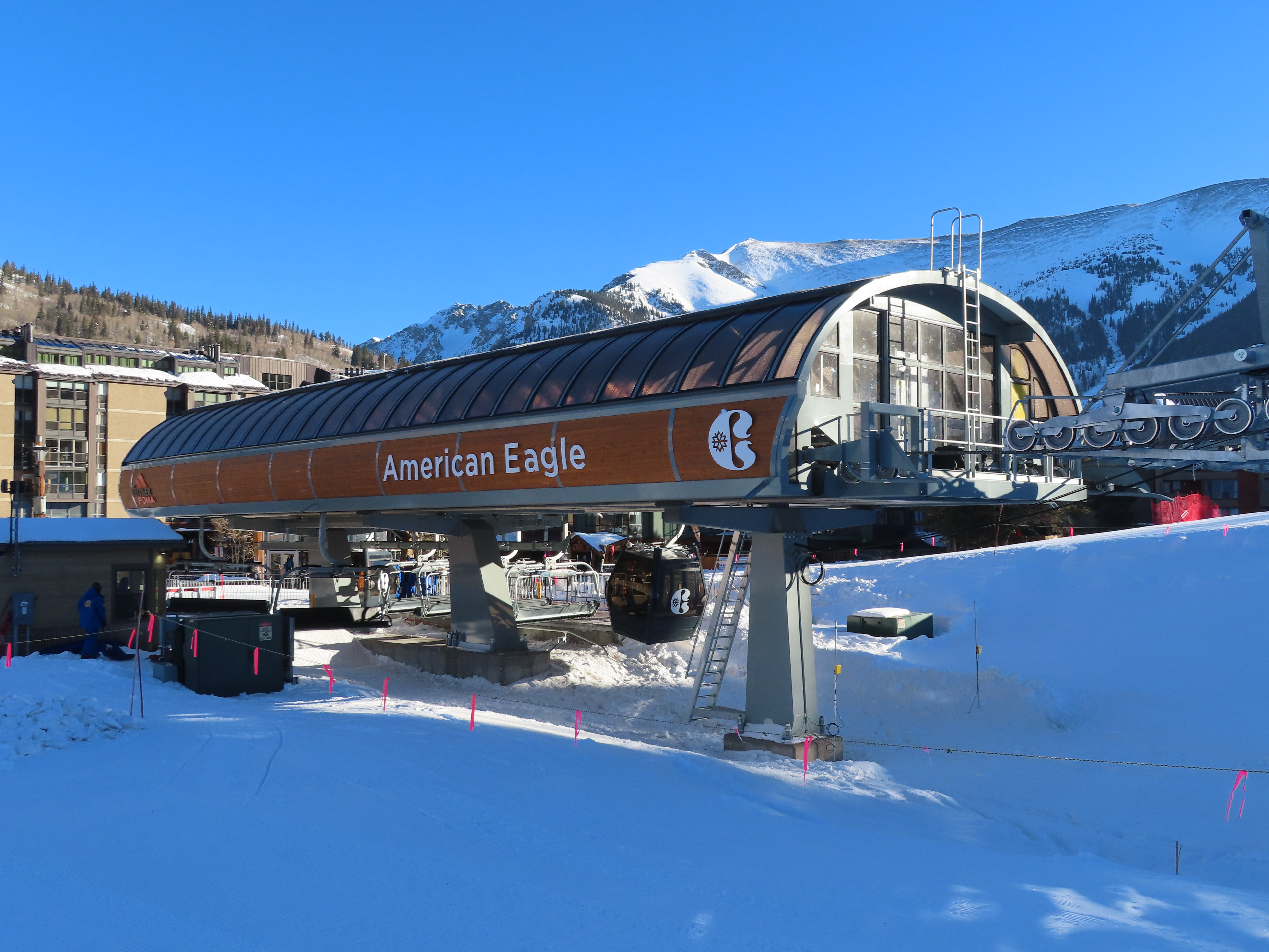 Leitner-Poma won the bidding to replace both lifts out of Copper’s Center Village in 2018.American Eagle is a combination six place chairlift and eight place gondola.Long LPA terminal with three masts.Lift overview.Operator house at the return.Gondola loading zone.View back down the lift line.Arriving at the drive terminal.There is a small cabin/chair maintenance building.Gondolas unload on the downhill side of the top terminal.This was the very first in North America with a direct drive. Three others opened within a few weeks.Side view of the top terminal.Upper terminal seen from below.Towers 19 and 20 with Storm King visible in the background.View up the lift line.Lower part of the lift.Another view up the long lift line.The bottom terminal in the village.Gondola maze area.Towers 1 and 2.A Sigma Diamond cabin.A cabin nears the lower station.Riding up the line.Upper station overview.Huge generator for backup electricity.Wooden under skin.Tower 19 and both carrier styles.View down the line.Middle section of the lift.Lower lift line view.Looking uphill at tower 10.There are special rollers on the inside of the cabins to keep them level in the chair load/unload zones.Combo assemblies on tower 8.Another view up the lift.Tower 6.There are four chairs for every one cabin.Lower terminal seen from above.Because the gondola section runs slower than the rest of the terminal, chairs appear to stack up.Ski racks on a cabin.View from the drive terminal.The upper station seen from above.Another view of the drive station.Tower 12.Side view of the return with its sister lift in the background.The lift line seen from I-70.