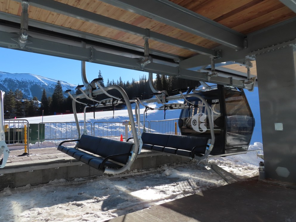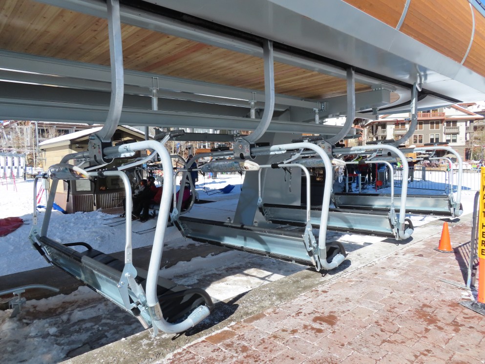 The hangar arms on the chairs are much longer than on other LPA lifts, and I’m pretty sure this has to do with the fact that the chair load and unload areas have to be designed such that gondola cabins aren’t making contact with the ramps. It’s noticeable when doing a direct side-by-side between the American Eagle’s chairs and the chairs on any of the other LPA six packs on the I-70 corridors, even the chairs on the American Flyer….