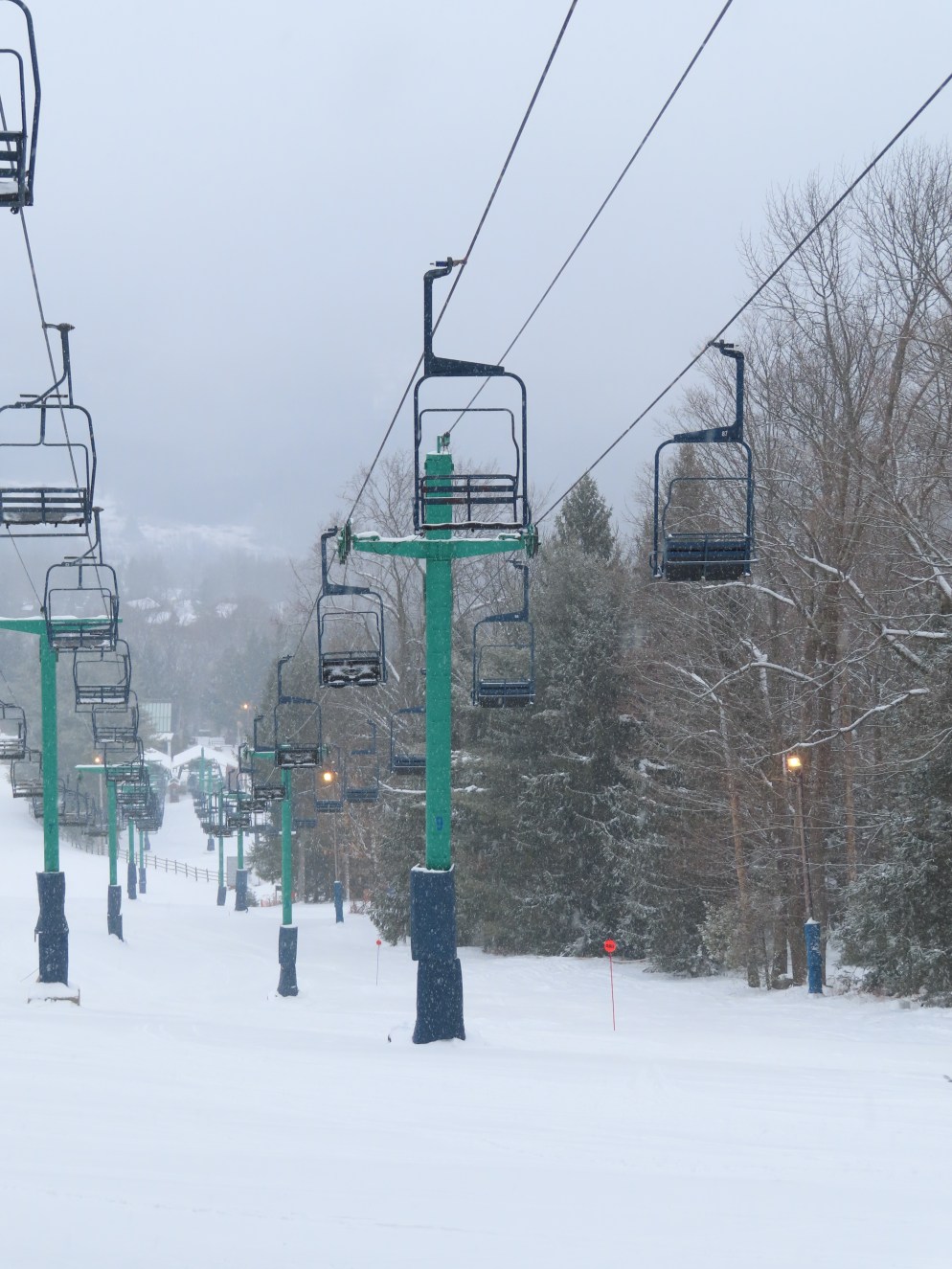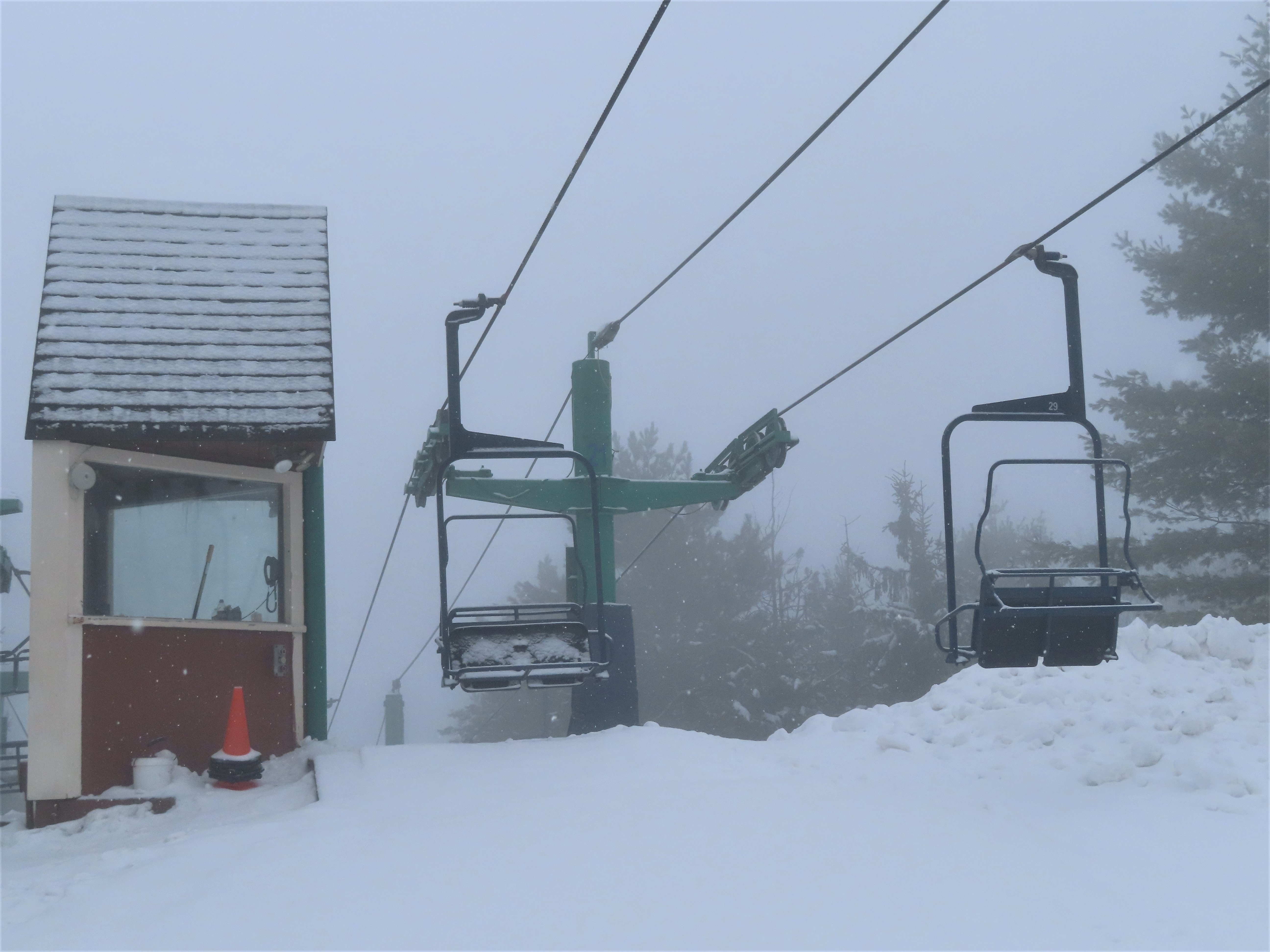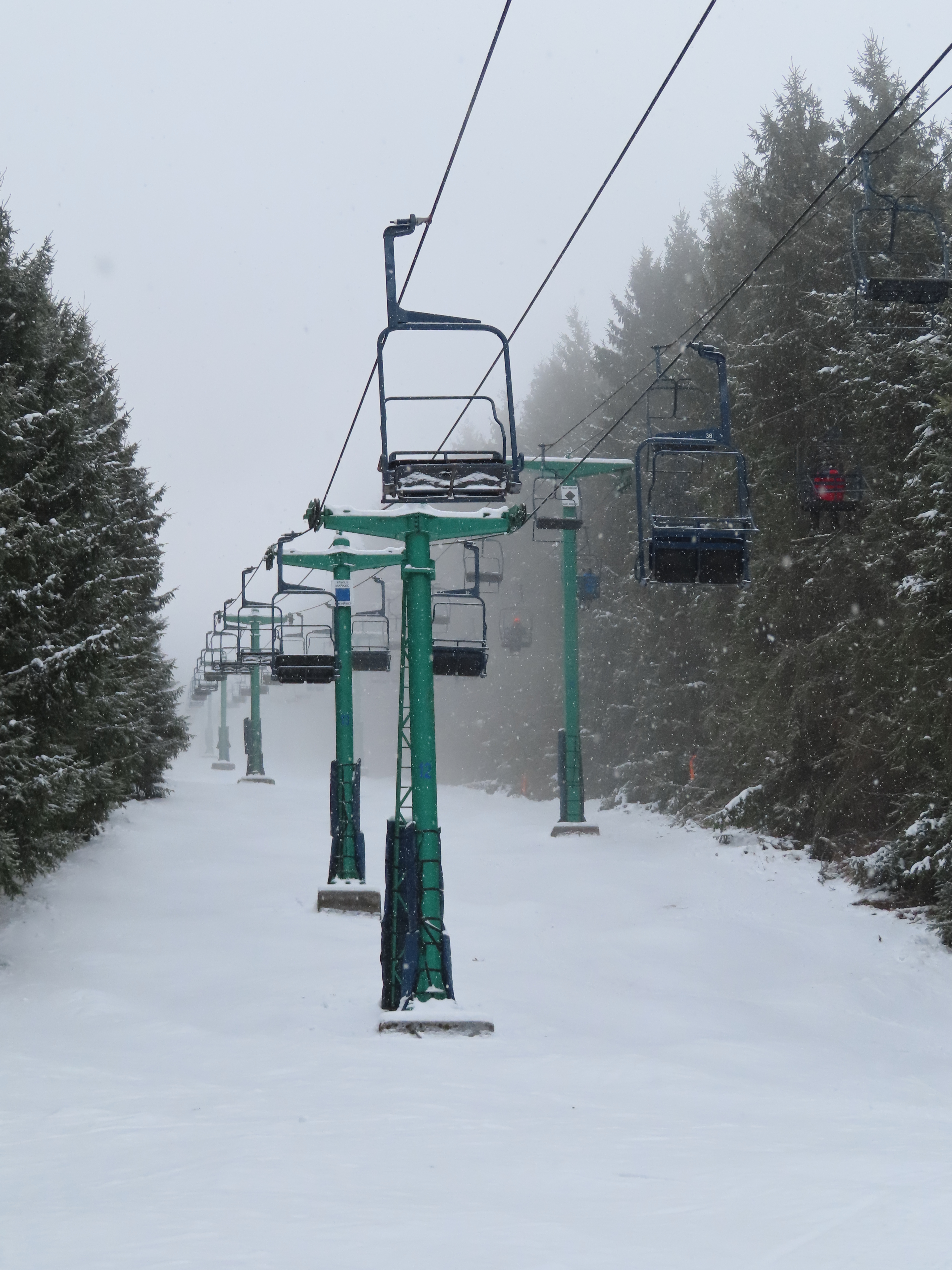 Hall’s main two models were the wood slat chair used primarily in the 60s and the maintenance-free plastic seat chairs with the metal backrests (Which this lift has). The two rarest models would be these cathedral chairs and Hall center poles, the only lifts I know of to have the latter are Blue at Bousquet, MA and the former High Campbell at Crystal, WA.