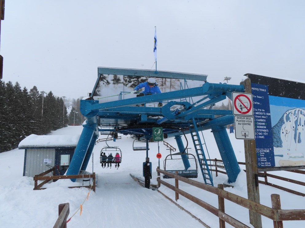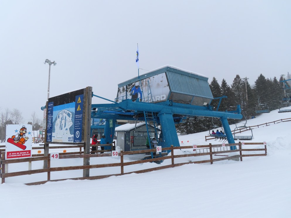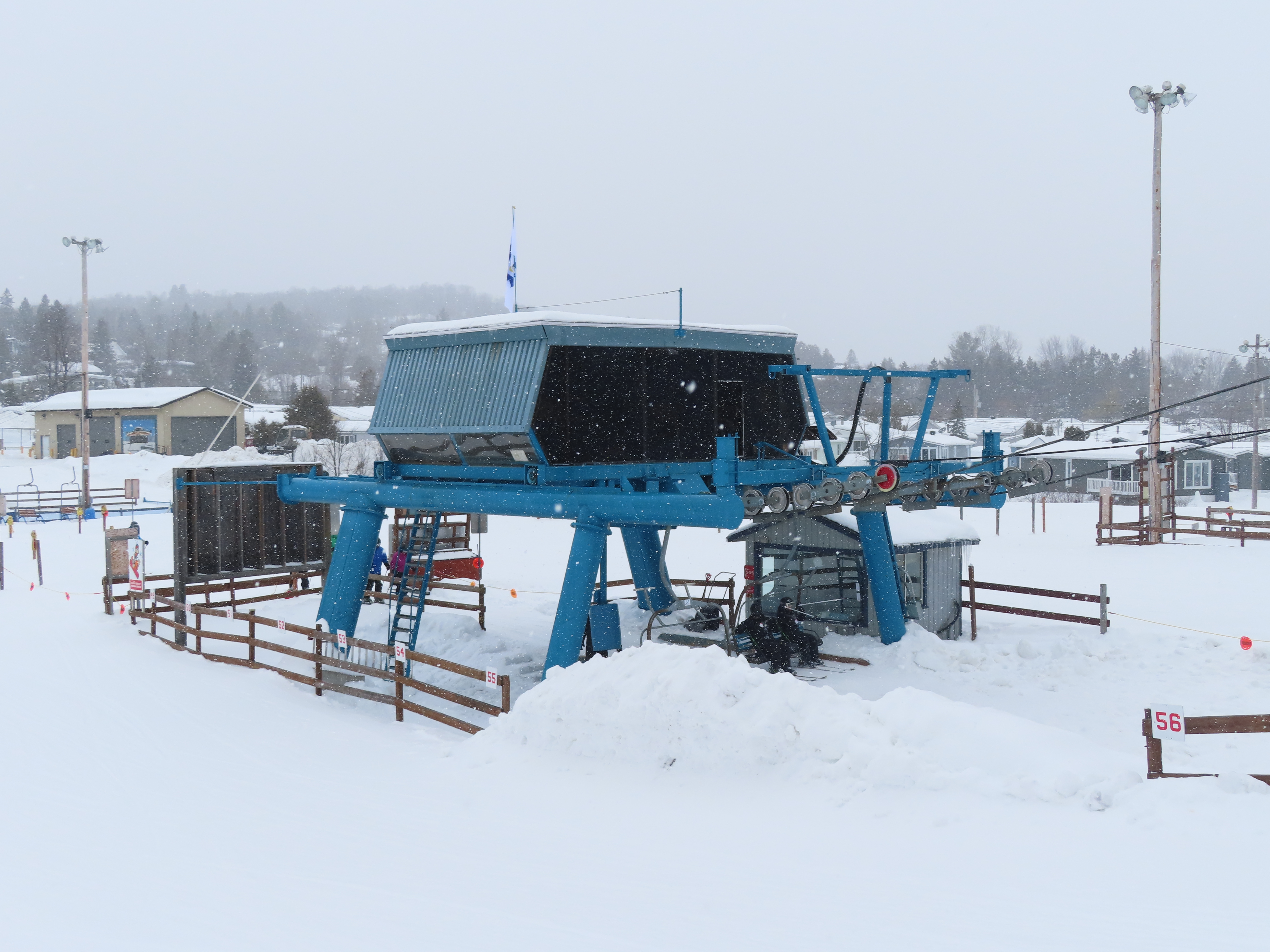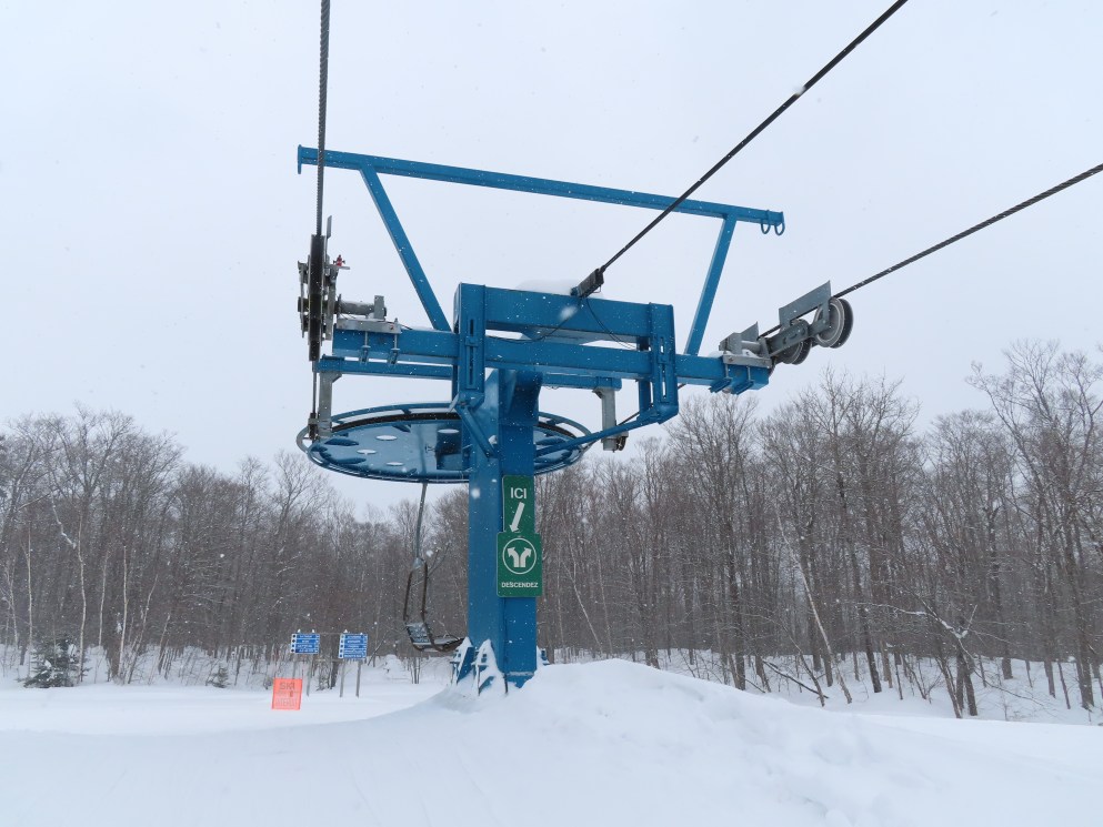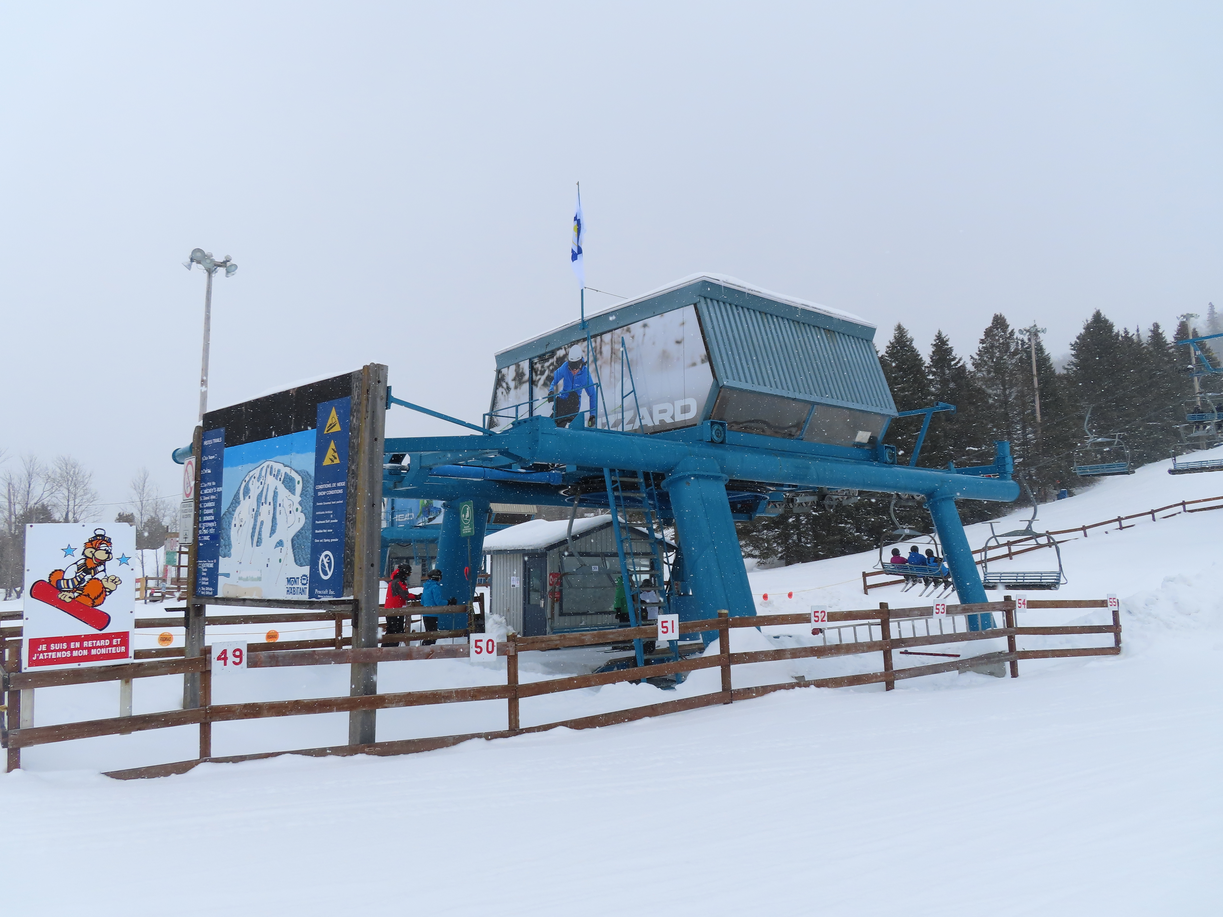 This Doppelmayr quad runs parallel to another very similar lift at Mont Habitant.Top return terminal.Unloading ramp.Side view of the top terminal.Upper part of the lift line.Middle lift line.Lower lift line.Looking up the line.Drive terminal.Another view of the motor room and loading areas.