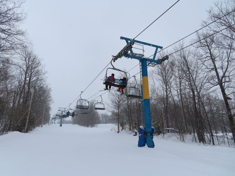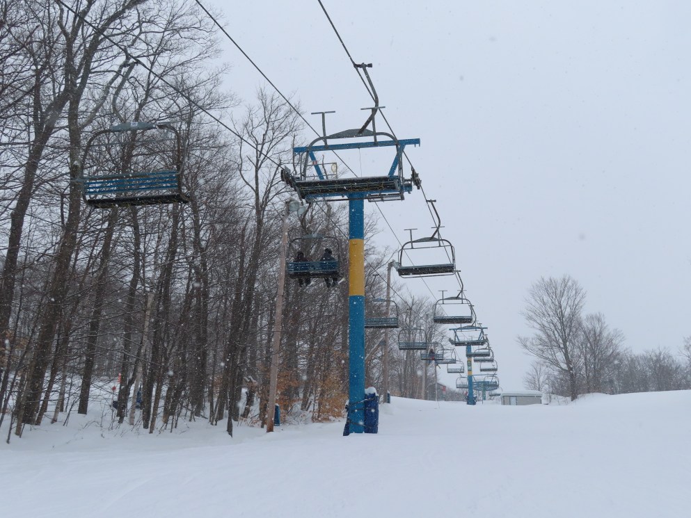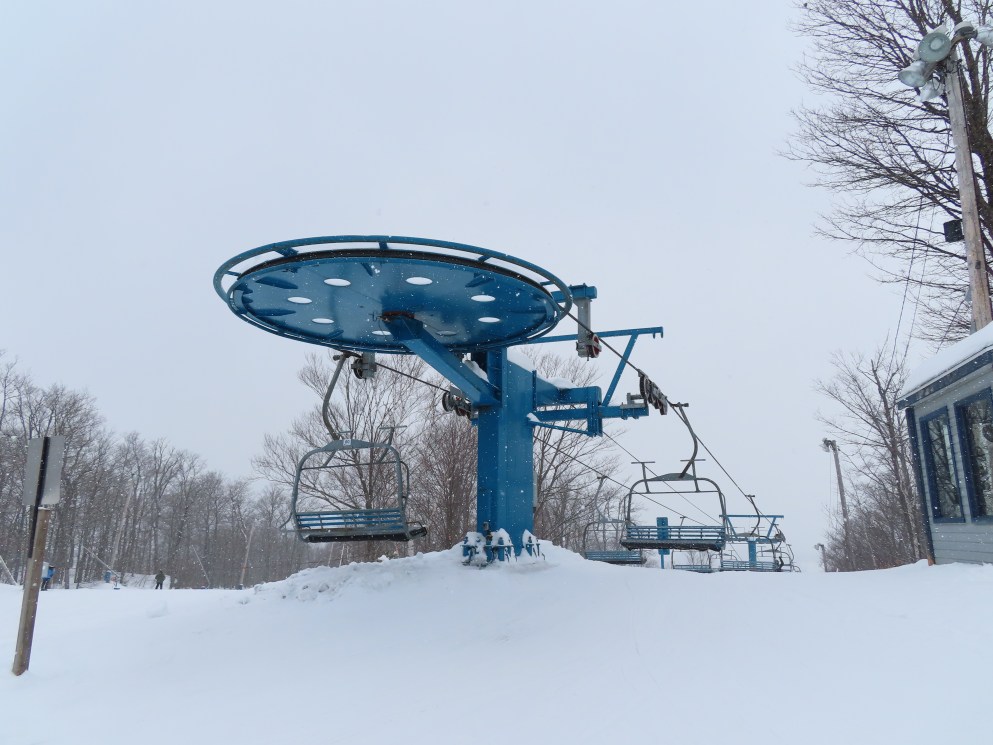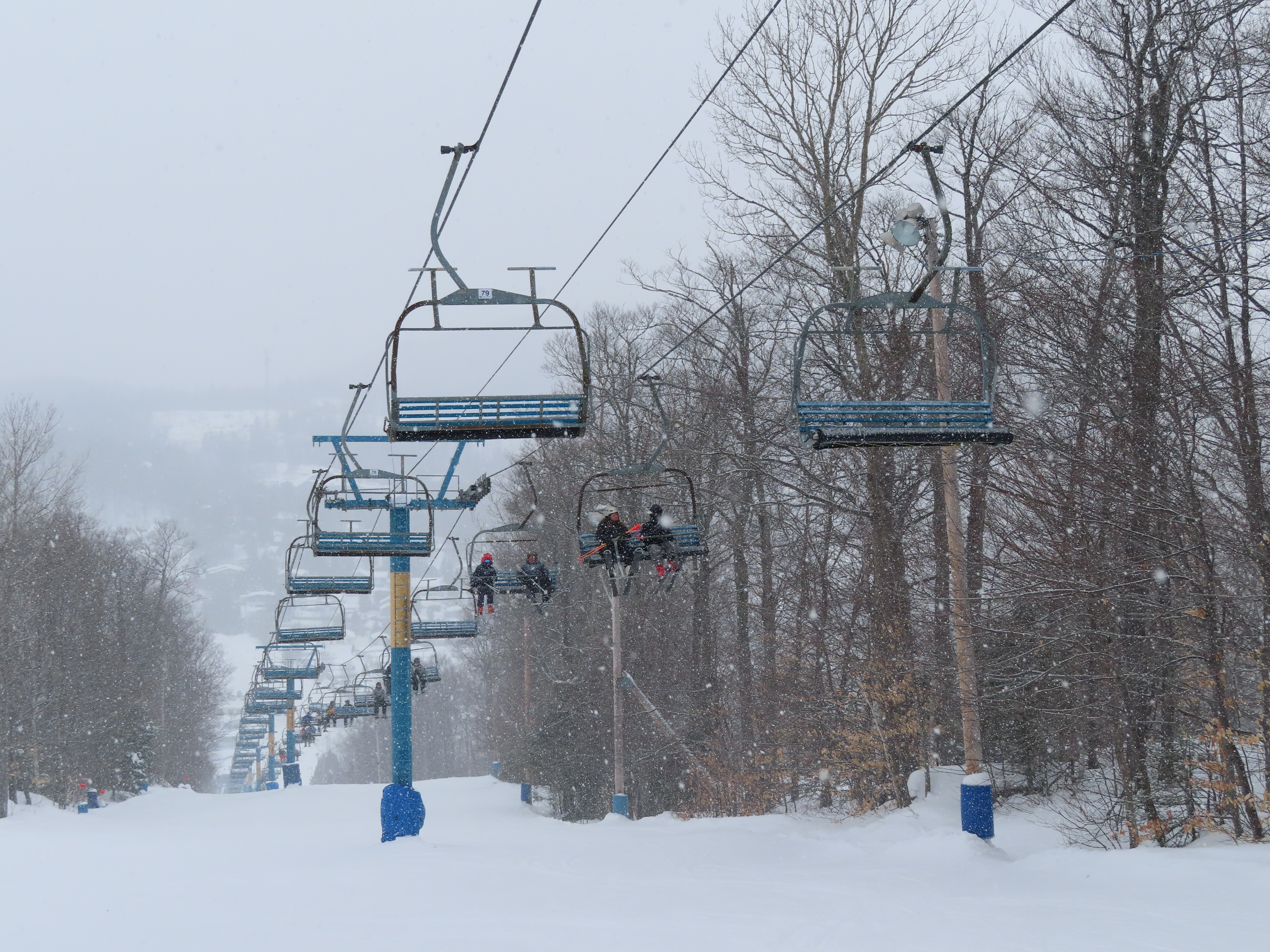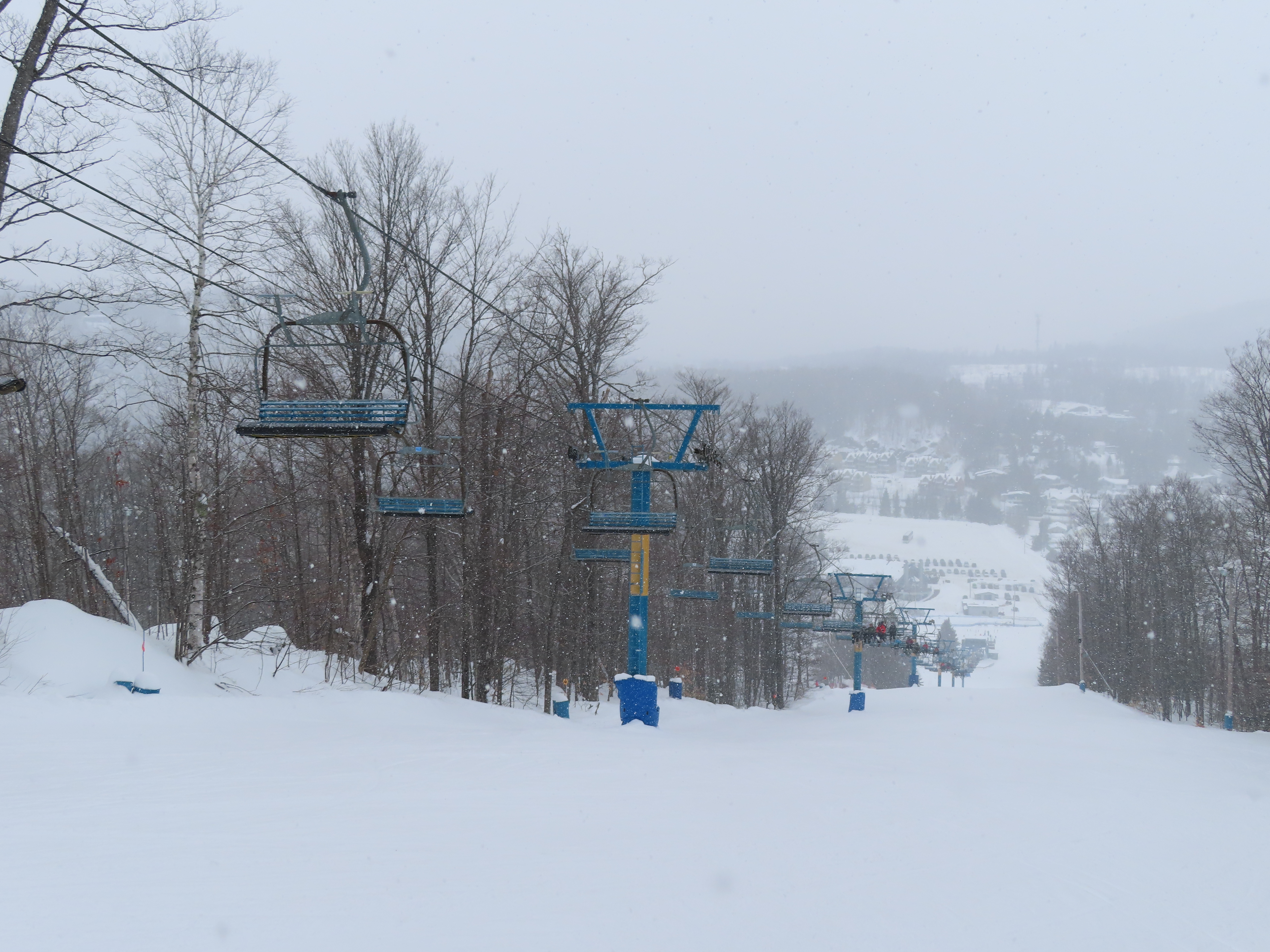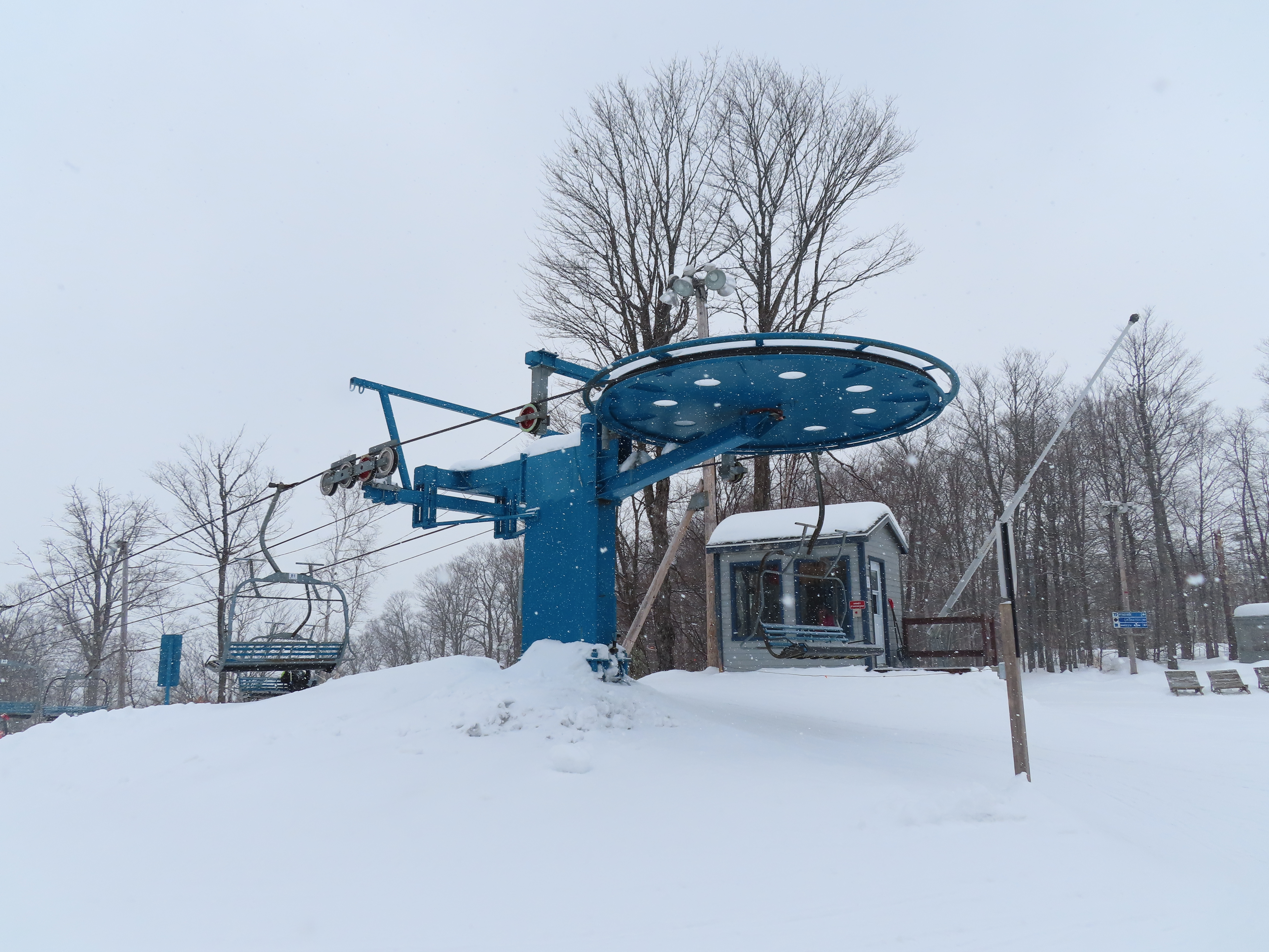 This Doppelmayr quad runs parallel to another very similar lift at Mont Habitant.Top return terminal.Unloading ramp.Side view of the top terminal.Upper part of the lift line.Middle lift line.Lower lift line.Looking up the line.Drive terminal.Another view of the motor room and loading areas.