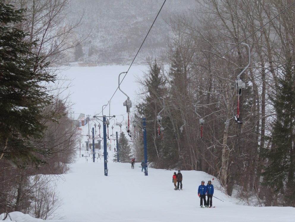 This classic Poma T-Bar services the skier’s right side of this ski area.Drive terminal at the base next to sister lift A.Lift line overview.View up the line at tower 3.Tower 2.The floating bullwheel.Counterweight at the summit.Tower 4 of 4.Looking down the line.