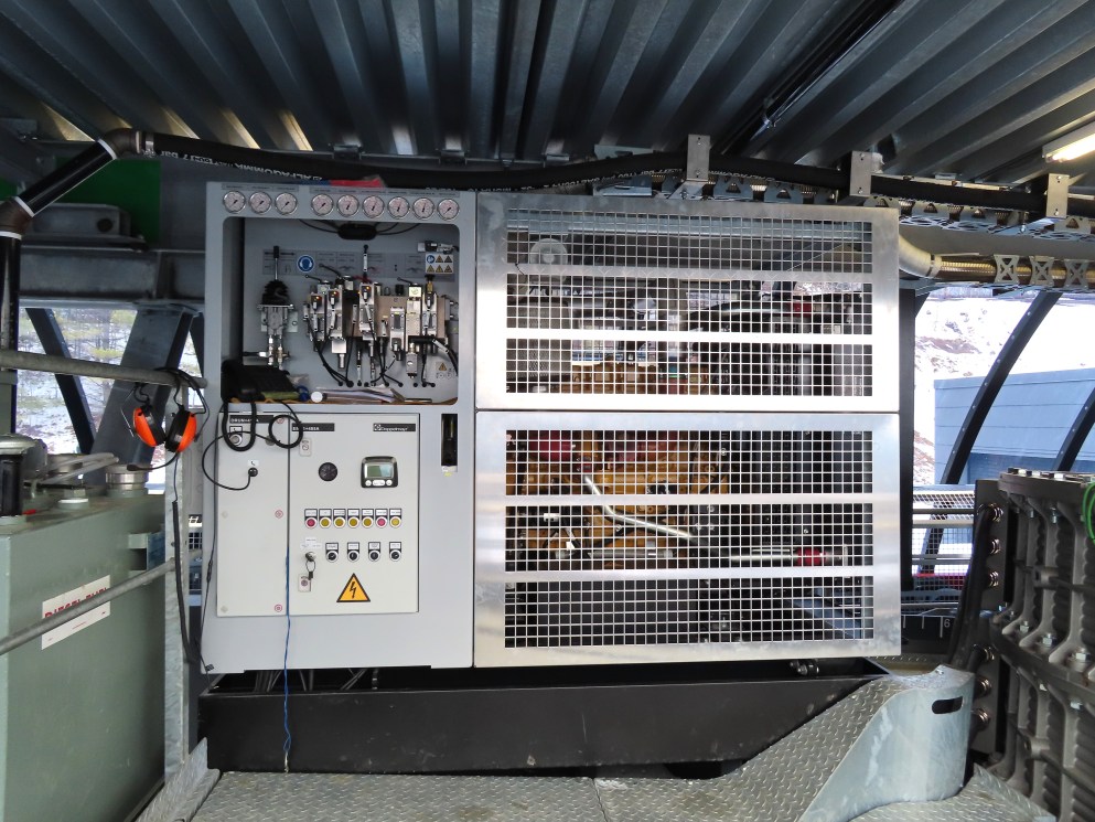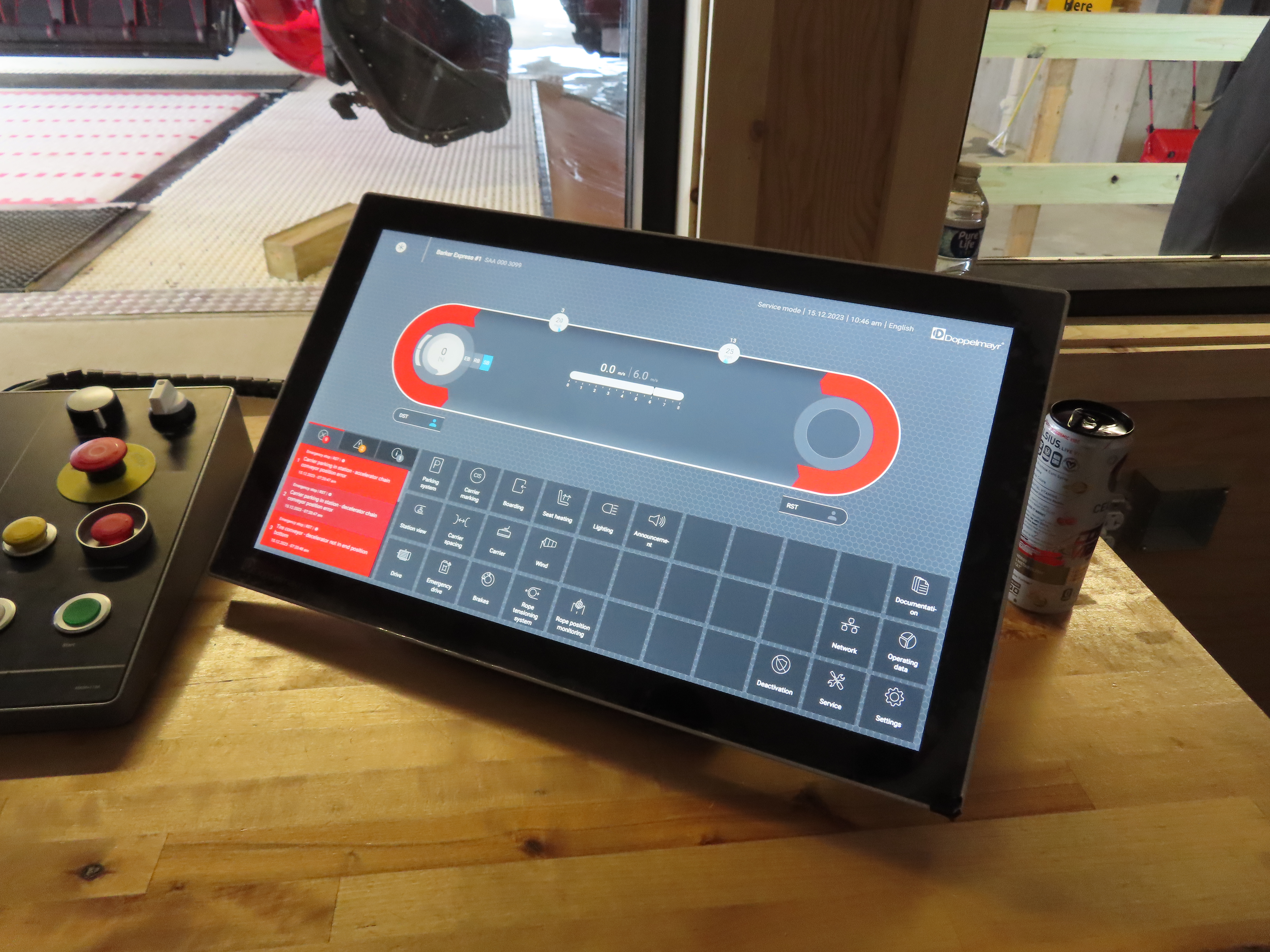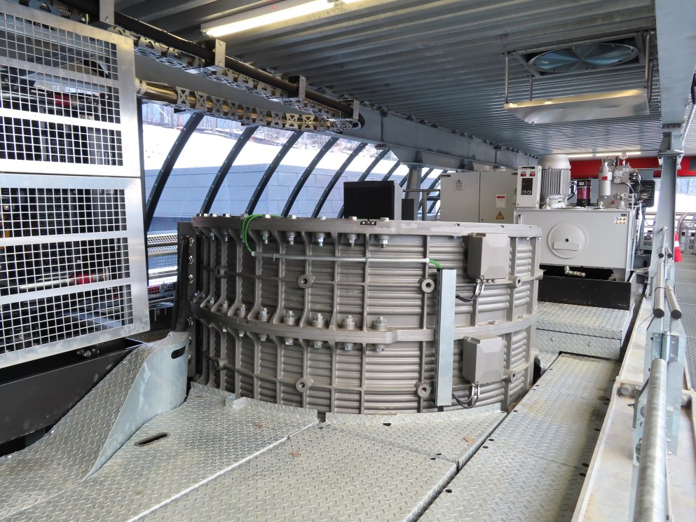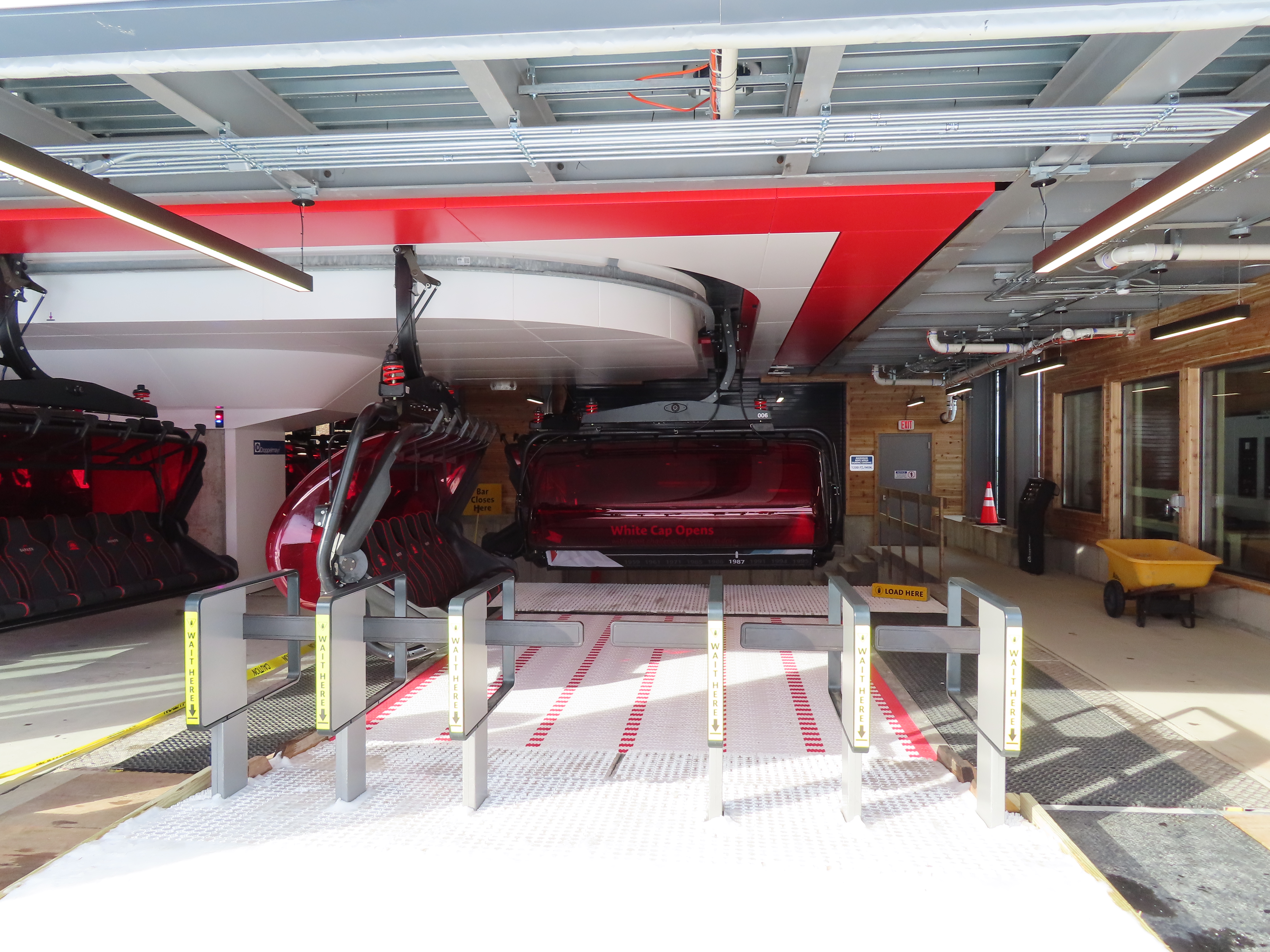 Barker 6 is the third lift to service the main face of Barker Mountain following a high speed quad and double chair before that.This lift is the first six pack in North America with auto closing and locking restraint bars.Each station features parking for around 30 carriers to avoid the need for a separate parking facility.Inside the D20 bottom station.Two ring direct drive motor.Backup diesel engine.Tensioning system in the bottom terminal.D3000 grips.View up the lift line devoid of carriers.Another view of parked carriers.Doppelmayr Connect touch screen.Outside operator controls.Another view of a grip with red springs.90 degree loading with conveyor and gates.The bottom station and tower 1.Tower 2.The bottom station has a small maintenance bay.Maze and loading area.The lower station building.Tower 1.View from the summit.Breakover towers.Side view of the top terminal building with additional chair parking.Unloading area.Upper station overview.Six place D-Line chairs with heated seats.View riding up the line.Looking back down.A support tower.Unloading ramp inside the top building.Tower 14 and the upper station.Lower lift line.An empty chair passing a tower.Lift overview.Riding out of the base area.Tower with combination assemblies.Another look down the line.Nearing the summit.Arriving at the top terminal.Steep middle section of the line.Barker base area with two other lifts.Lift line.