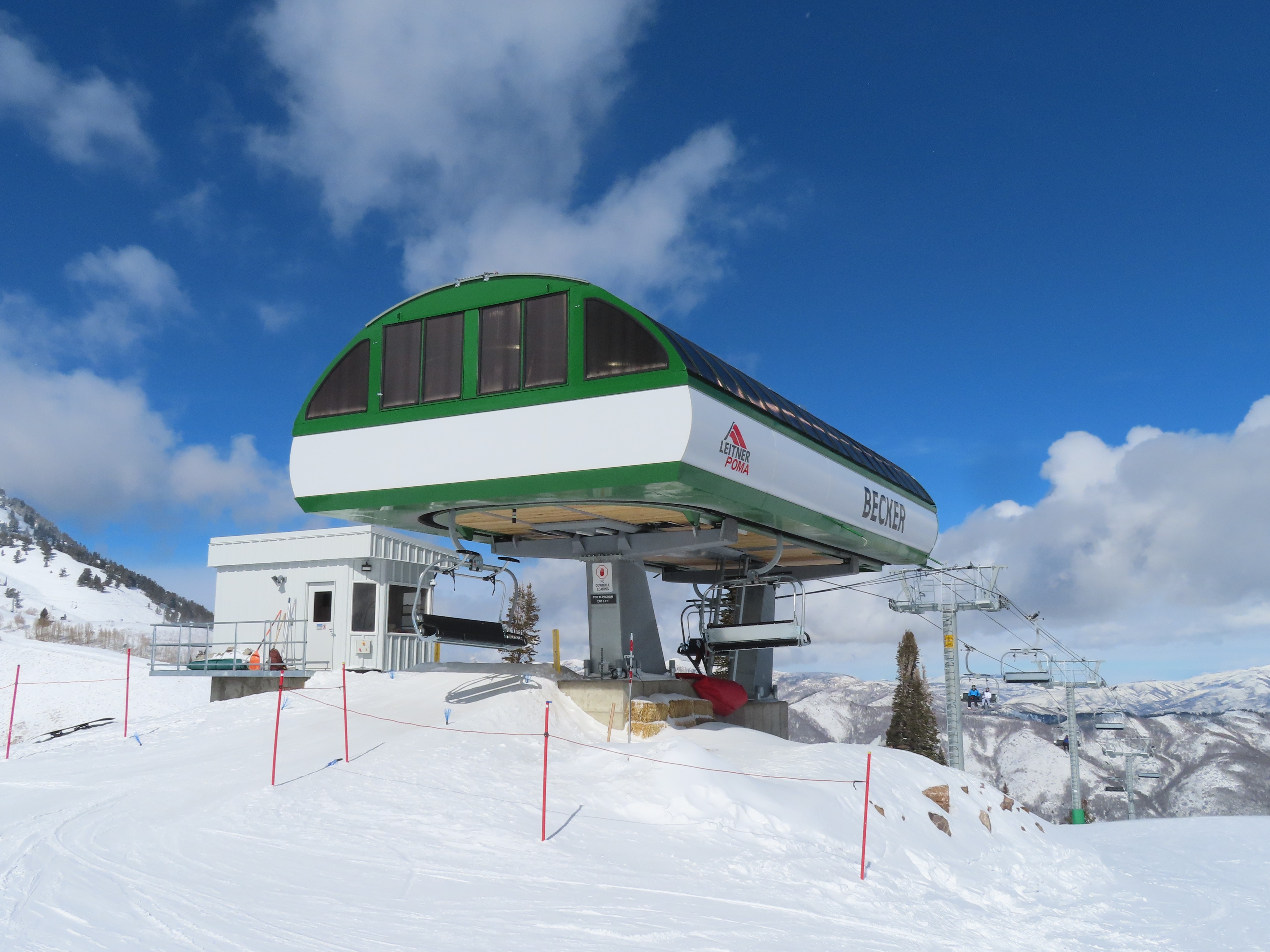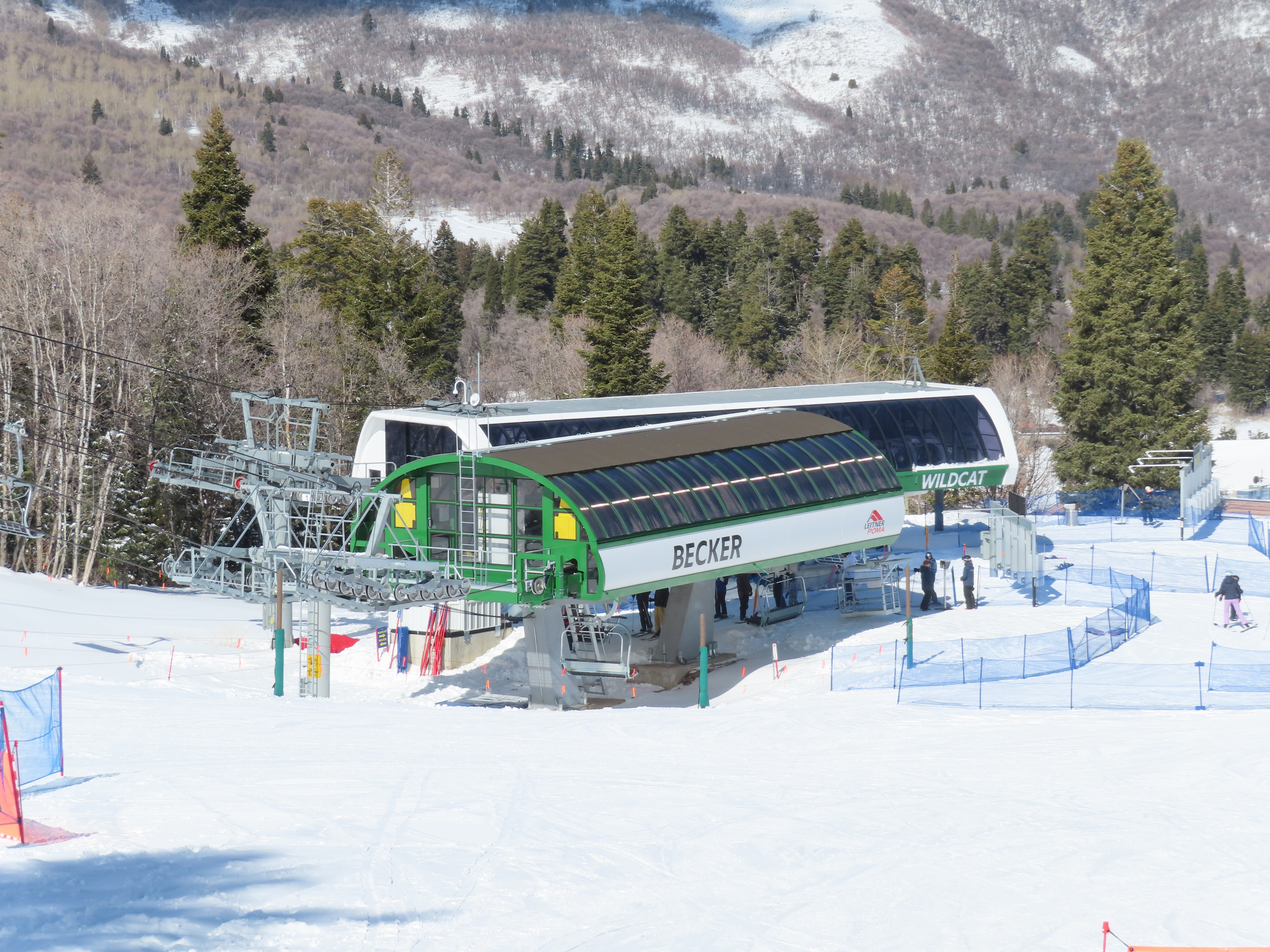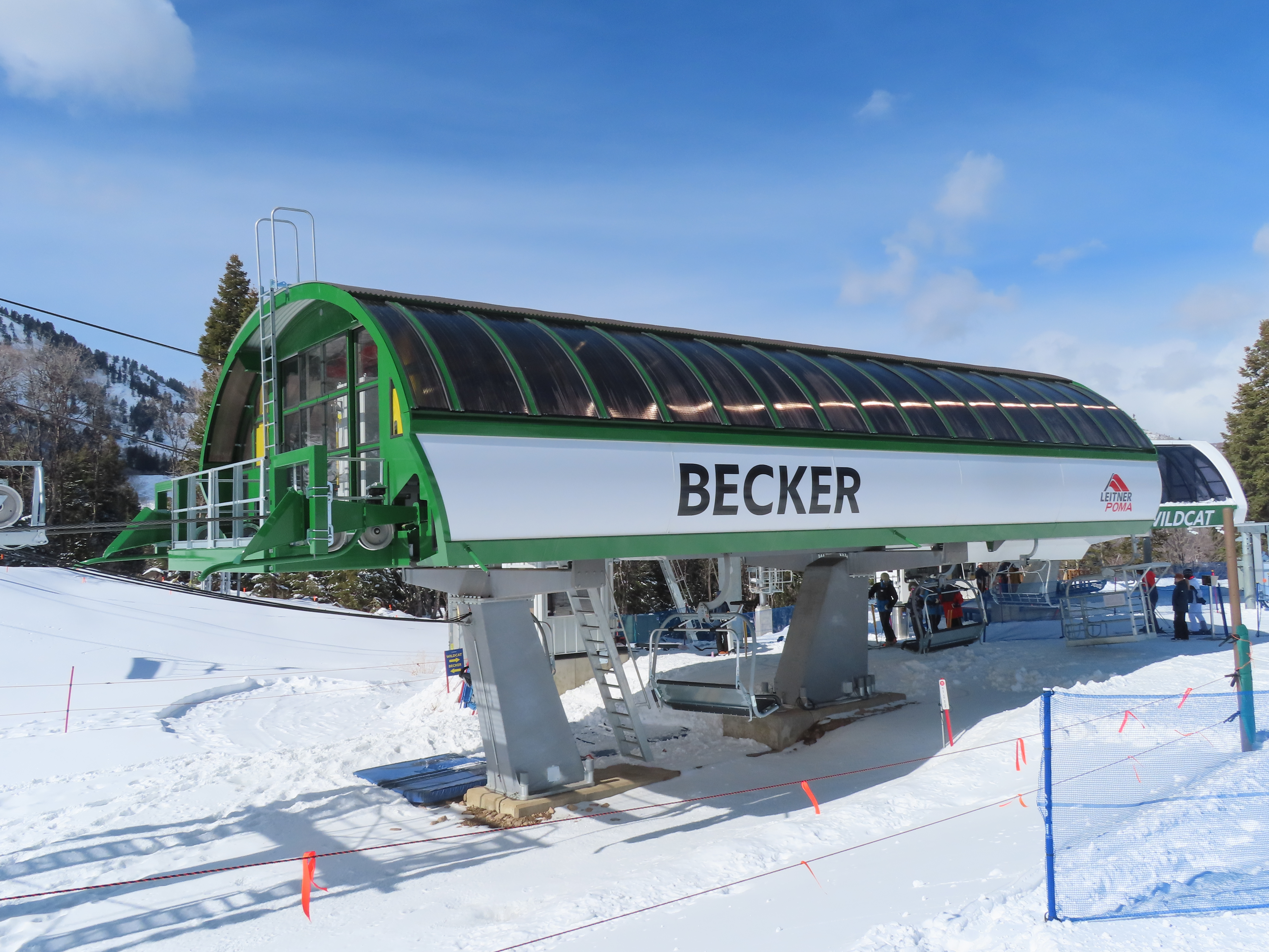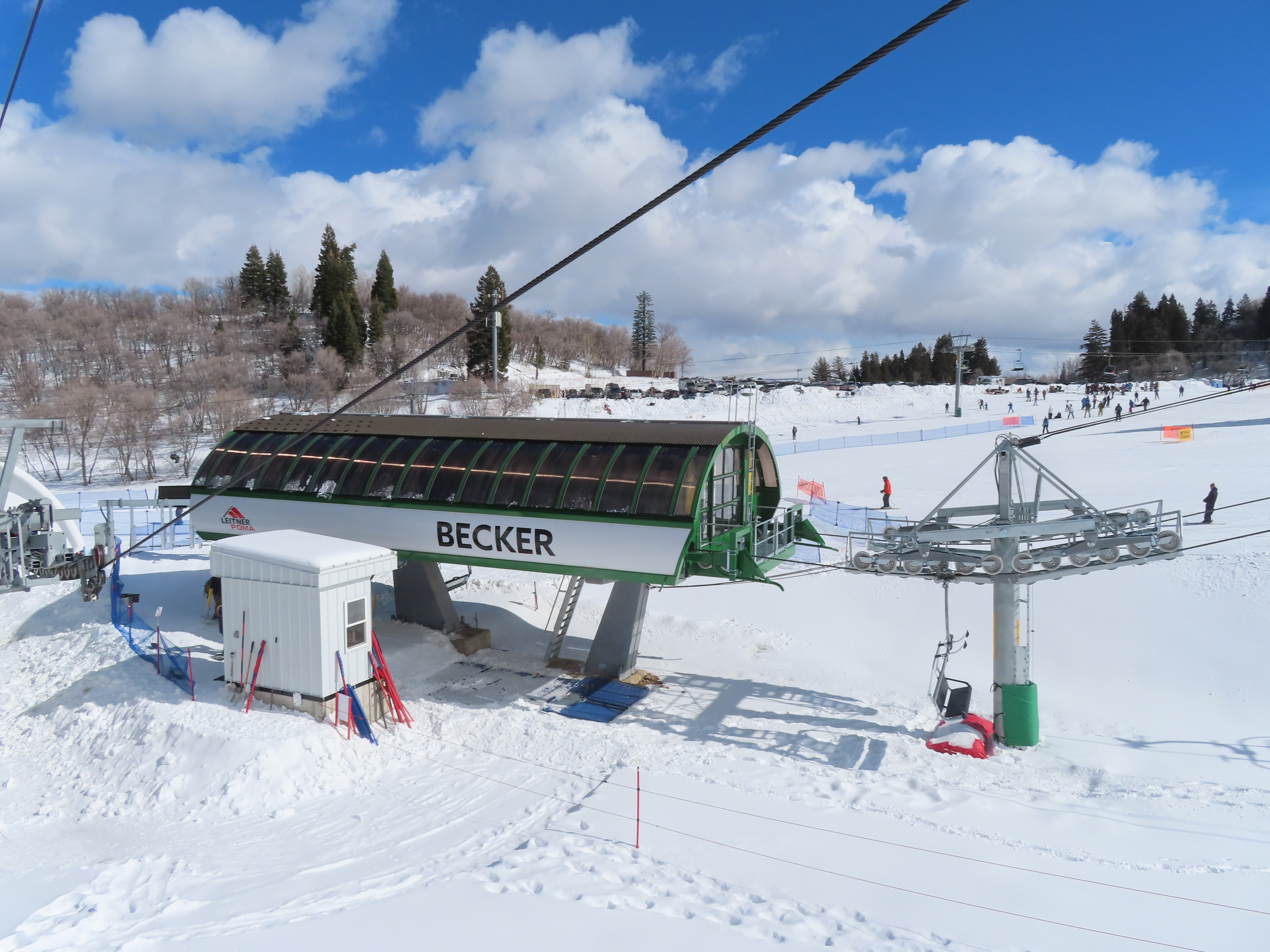 The new Becker starts next to Wildcat and follows a different alignment from the old Becker.Lift line rising out of the base area.Side view of the return terminal.Both lifts share a common maze area.View back down at tower 7.The long lift line could be described as a roller coaster with many undulations.Crossing over one of several gullies.Looking back at tower 16.Upper lift line.Tower 20.Upper station overview.Unloading area with a view.LPA drive station.View from the summit.The final two towers.View down at T21.Towers among deciduous trees.View down the middle part of the line.Tall tower 15.Another view down the line.Doppelmayr and Leitner-Poma stations squeezed together.New lower terminal location near Wildcat and Little Cat.Austrian-made chair.Tower 10.Arriving at the drive.Maze area.Side view of the bottom terminal from Becker.Side view of the top terminal seen from Wildcat.Upper station in a similar location to the old Becker top.Side view of a tower with combo assemblies.Close up of Becker return.Lower part of the line and one of several hold down towers.