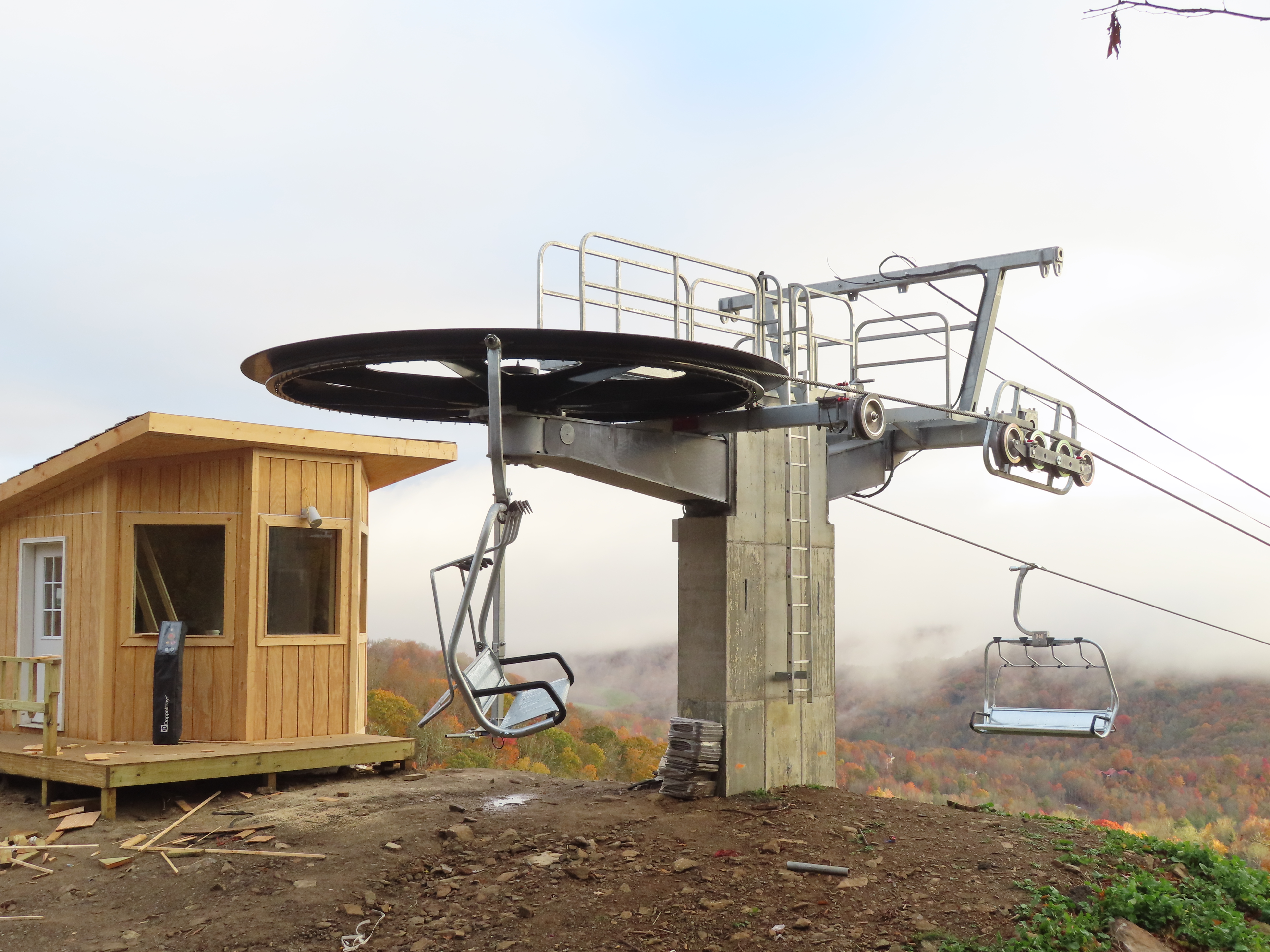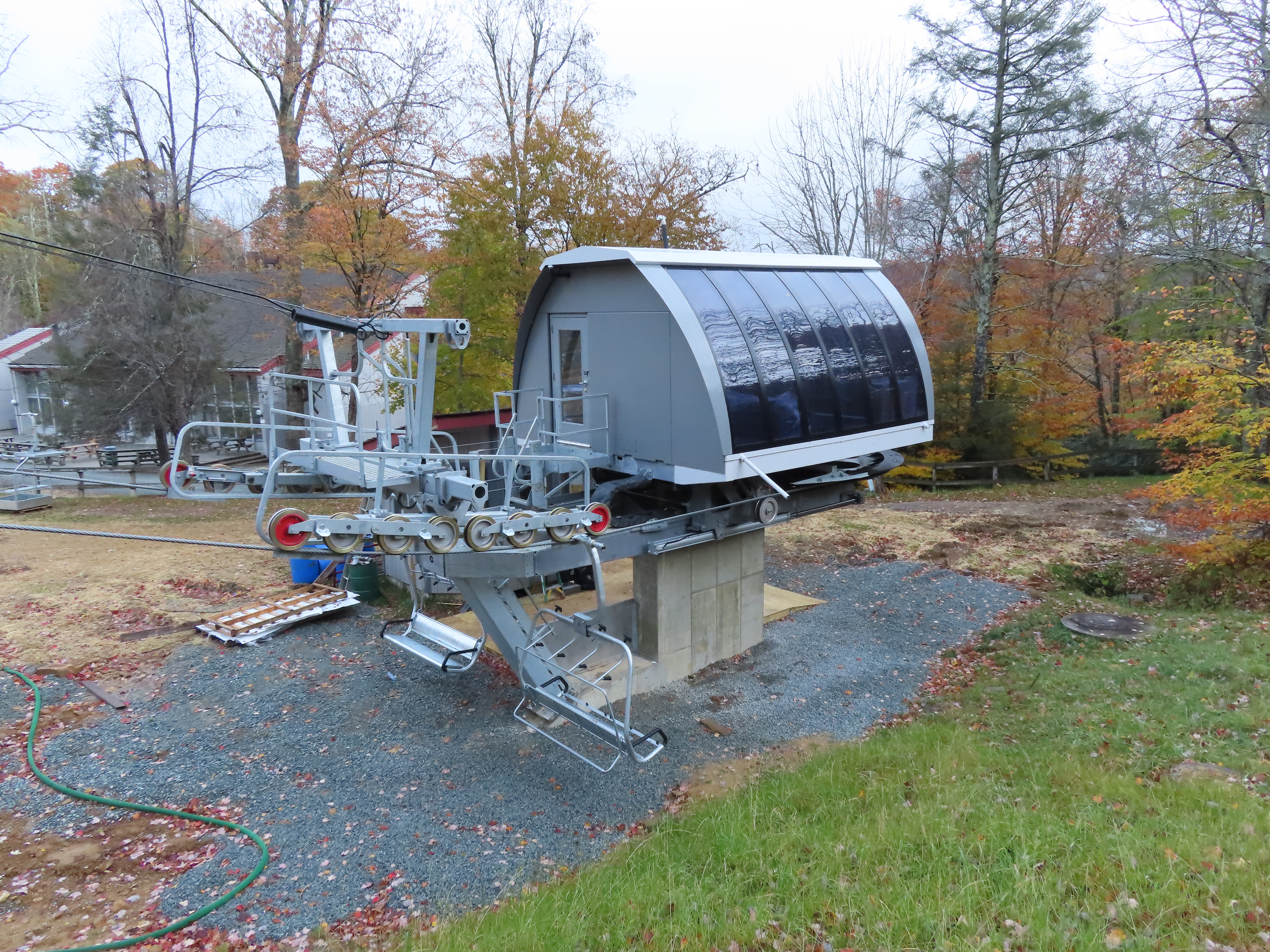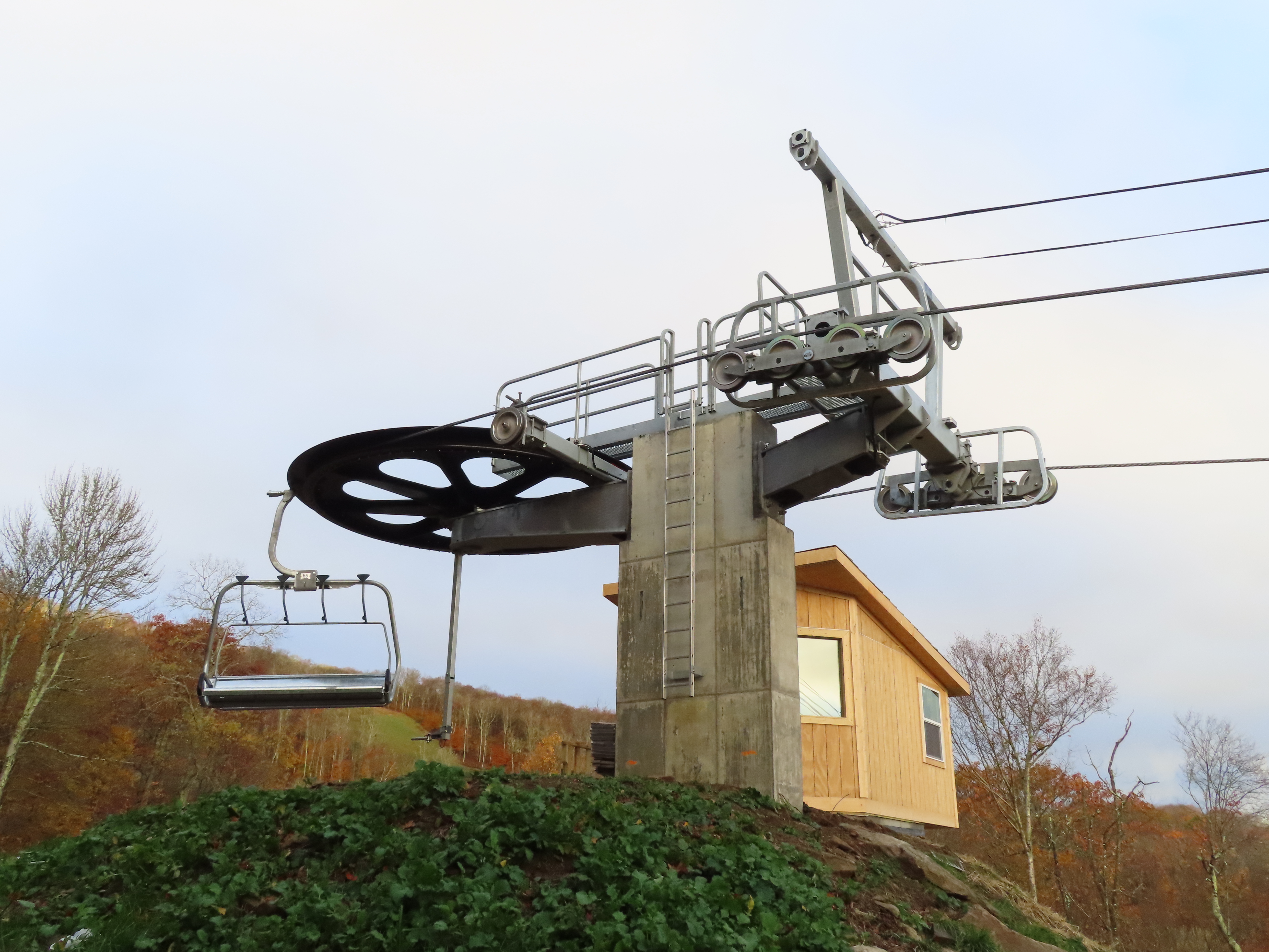 This Alpenstar quad services a beginner area known by the same name of Big Birch.Tower 3.Doppelmayr tower.The lift crosses over a road and some houses.View up at tower 5.Tower 6.The middle part of the lift line is almost flat.The steepest part of the line.Tower 8.View down the line.Top bullwheel.View from the summit.Doppelmayr Connect outside controls.Upper station overview.Lower part of the lift line.Loading area with lift shack reused from the prior triple chair.View up from the base area.Sheave assemblies integrated into the bottom station.Motor room.Doppelmayr EJ chair.