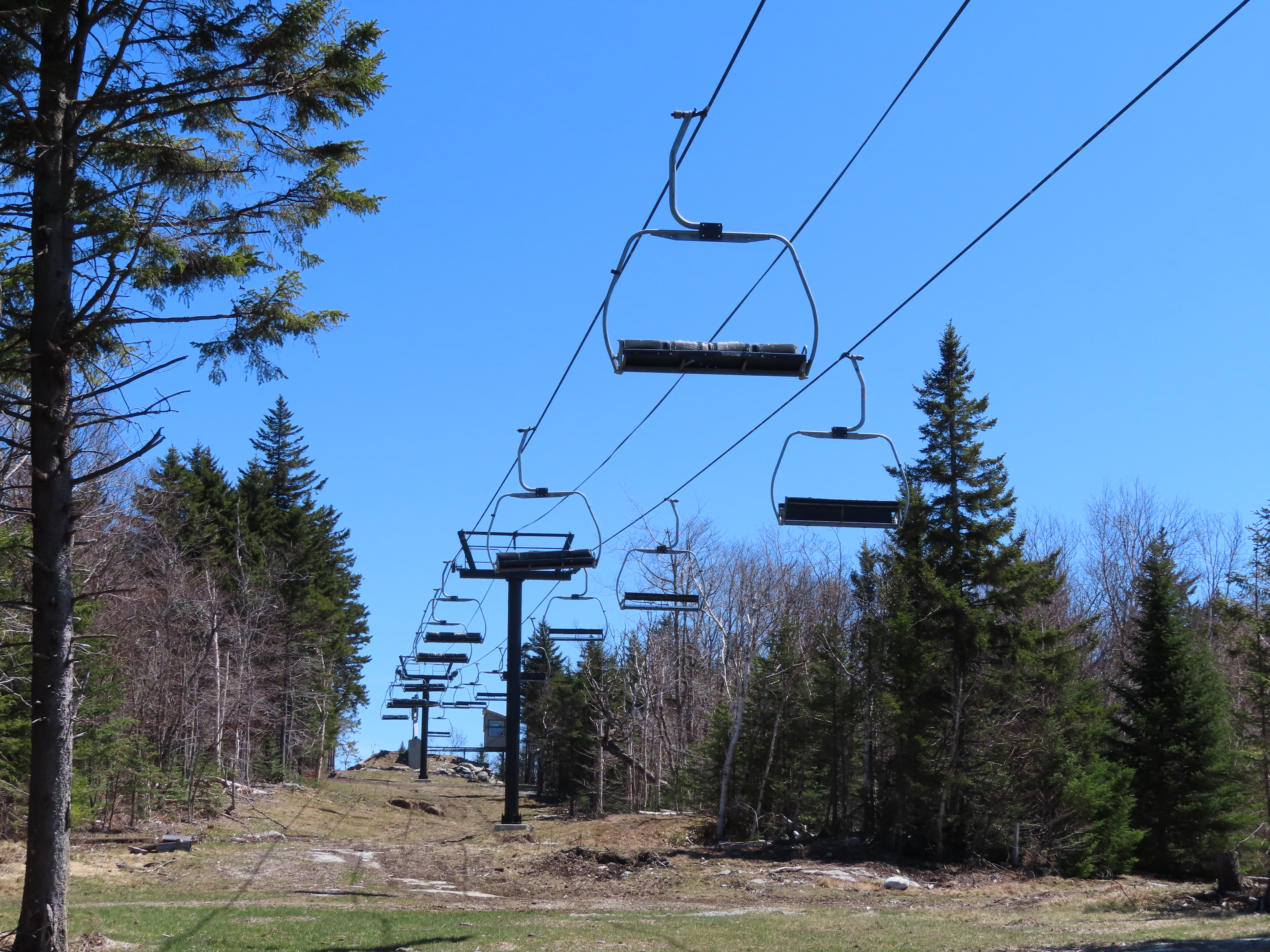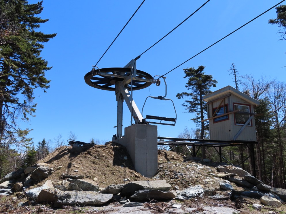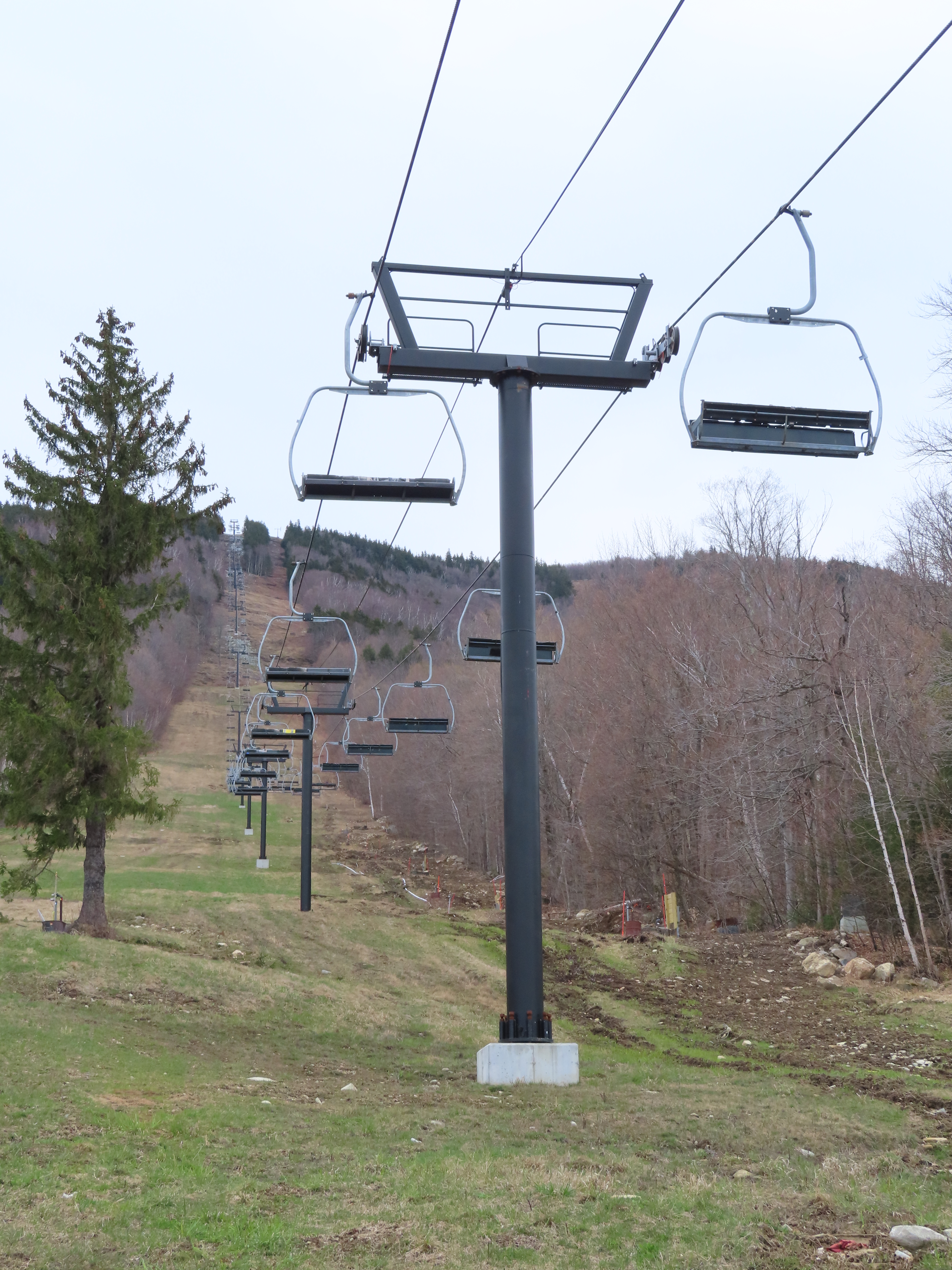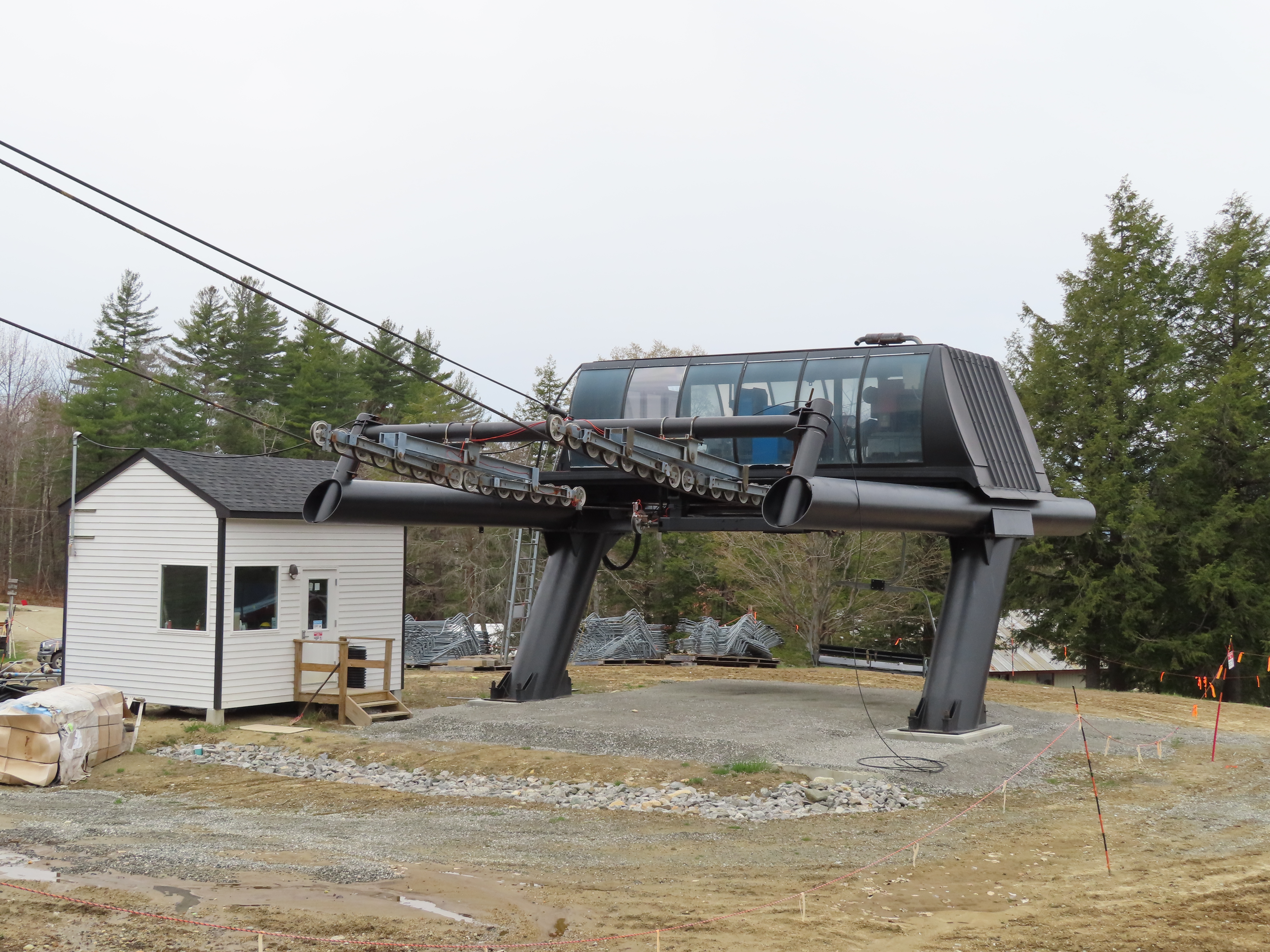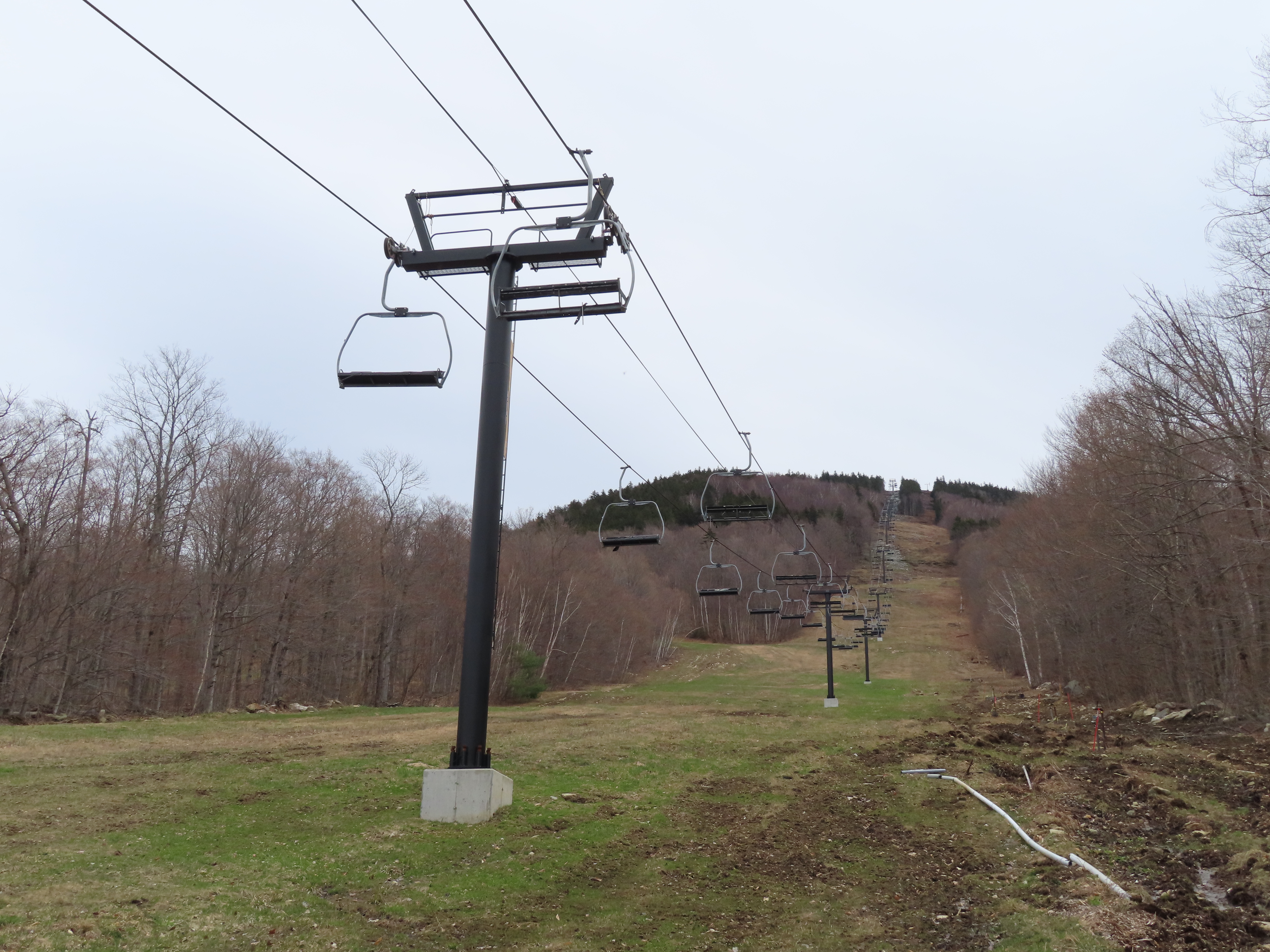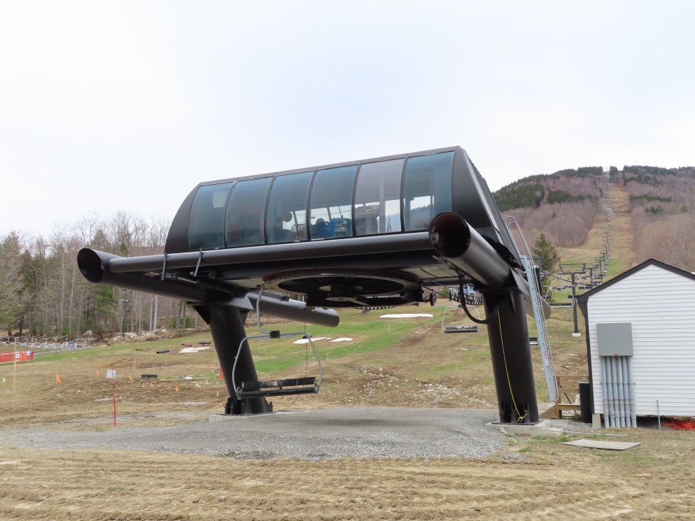 I’m not sure exactly, but the line here is definitely different. Snow Bowl’s liftline was mellower and was pretty consistent if I remember correctly. This lift starts with a runout on Hocus Pocus, gets progressively steeper along Black Line, gets much steeper than it had gotten at Stratton on Pitch Black and then mellows out to near-flat at the top. They wanted to iron out electrical issues, construct the top ramp and add safety bars in December and January for a mid-season opening (Whether or not this was possible in the first place is up for debate), but they discovered these issues around President’s Weekend and delayed the opening to next season.