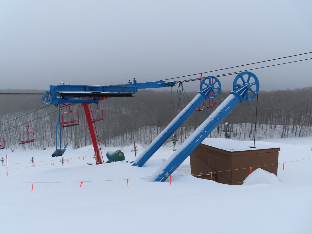 This is the oldest lift remaining at Nub’s Nob as of 2020.The top terminal has a classic Poma floating bullwheel.Tensioning system.The Poma chairs have been modified by Riblet.Lower lift line.Towers 1 through 3.Drive unit.Lift overview.