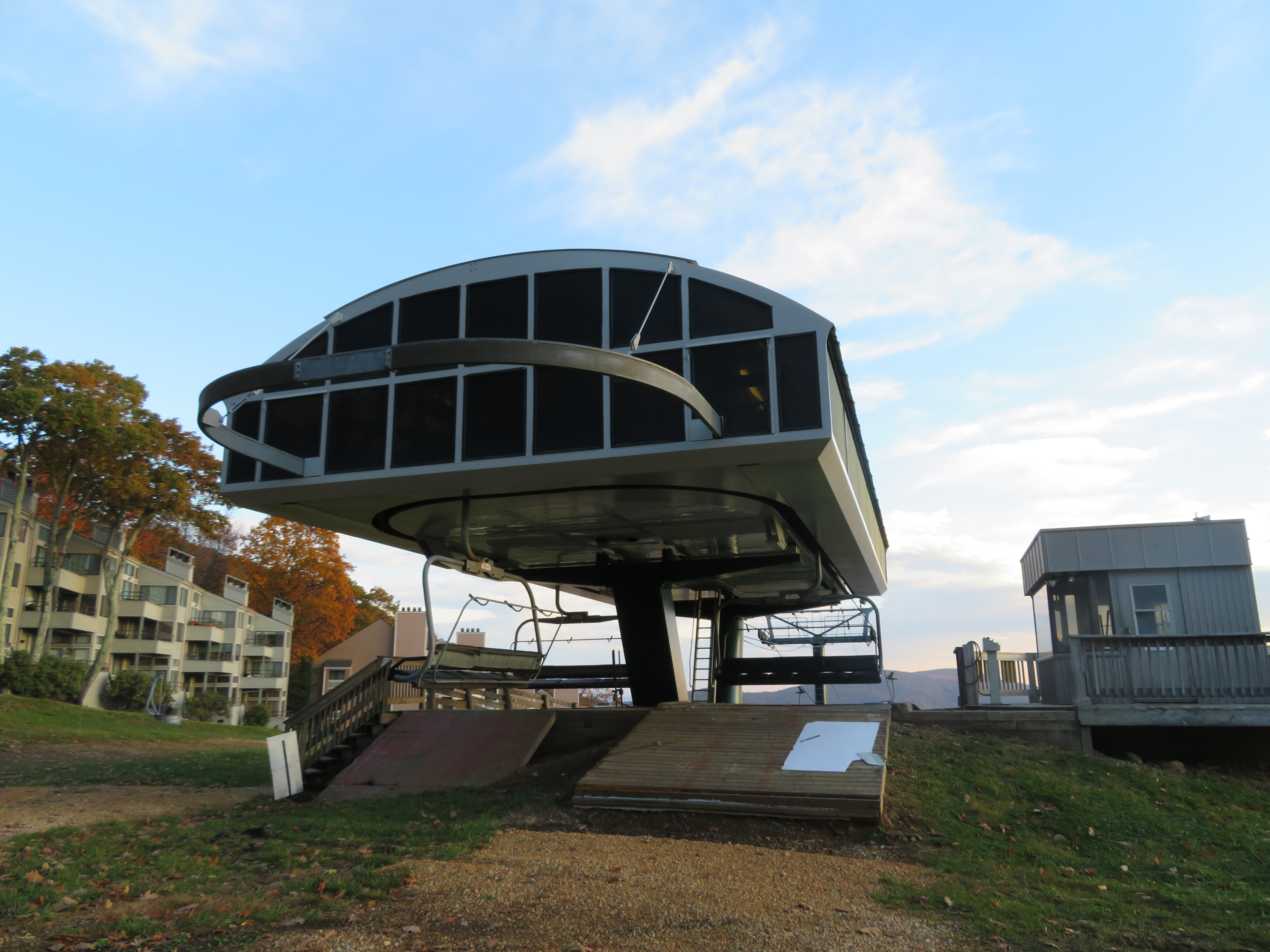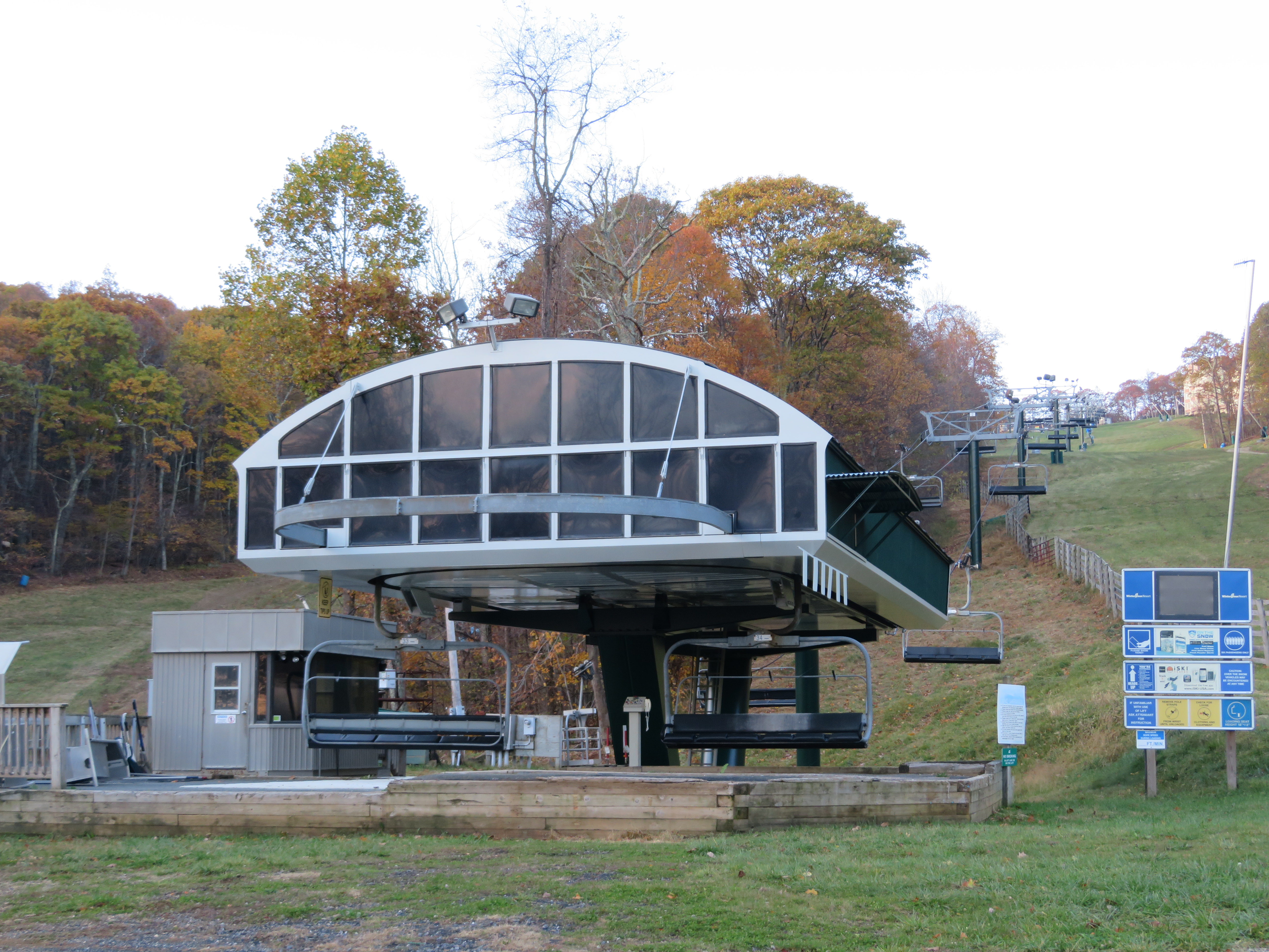 This Poma Omega six-pack is one of two at Wintergreen that service most of the mountain.Unloading ramp and operator house.The lift has only 9 towers.Top terminal with drive and tensioning.Upper section of the lift line.Lower part of the line.Bottom terminal seen from above.Side view of the loading station.Lift overview.