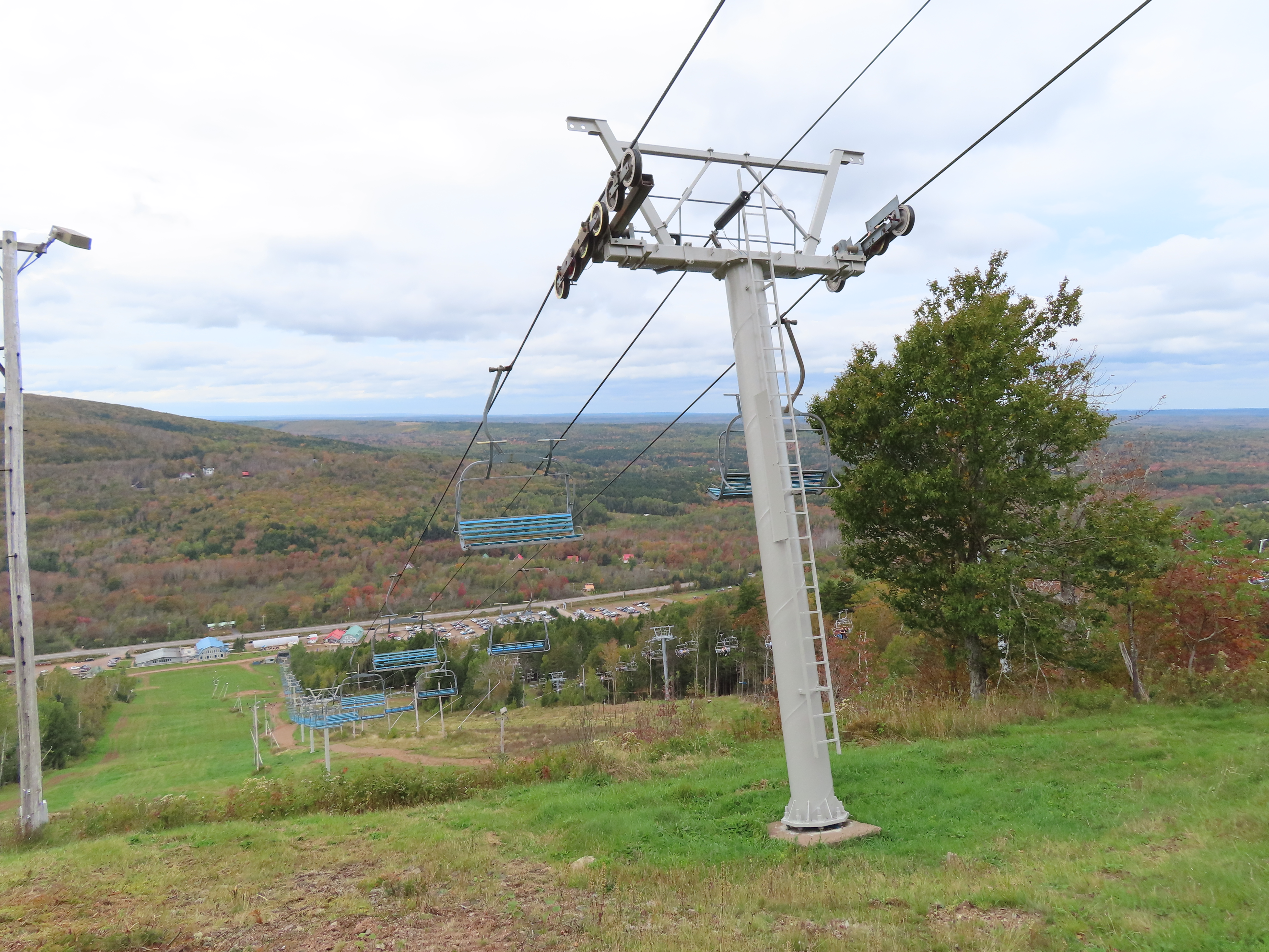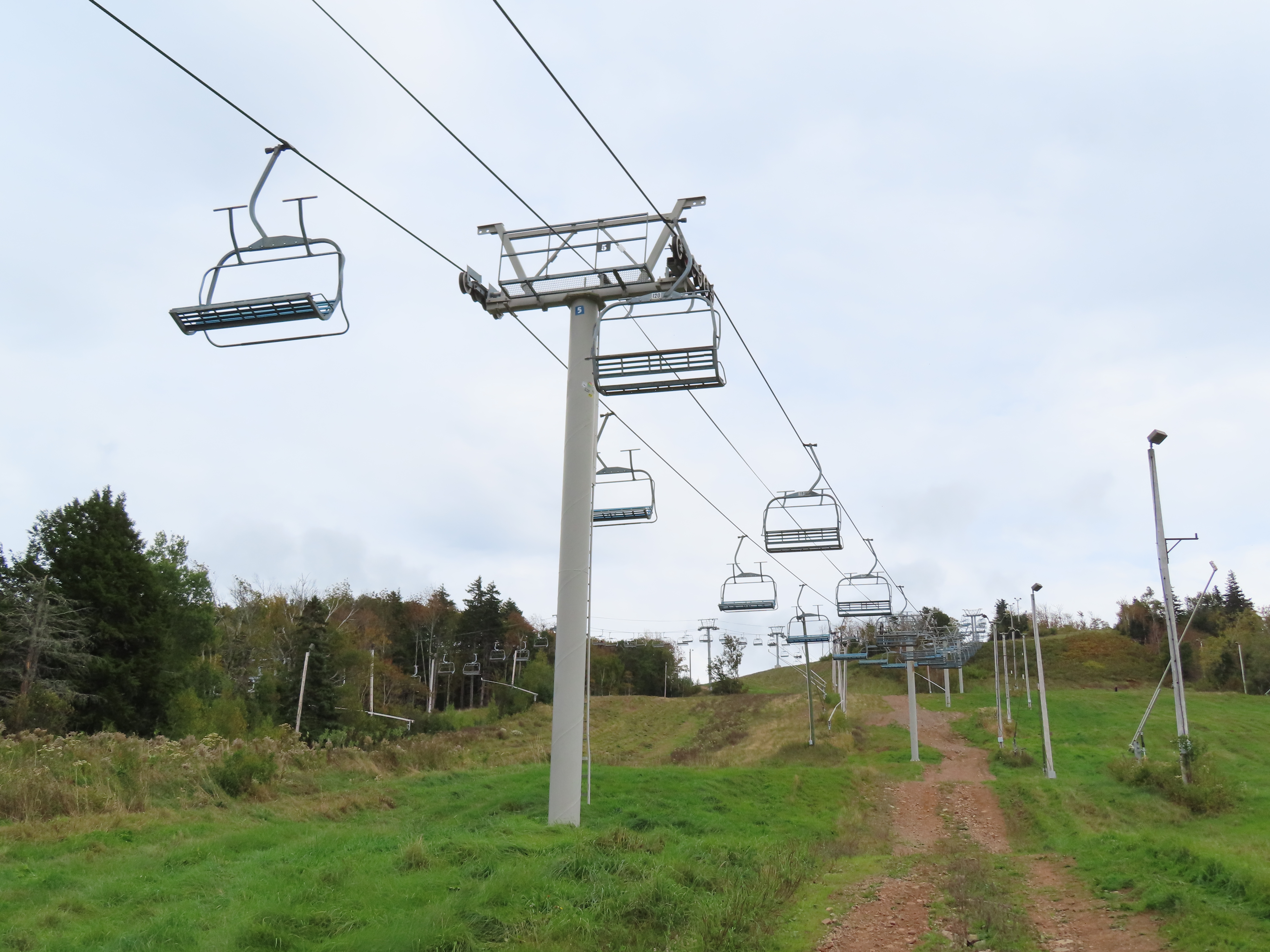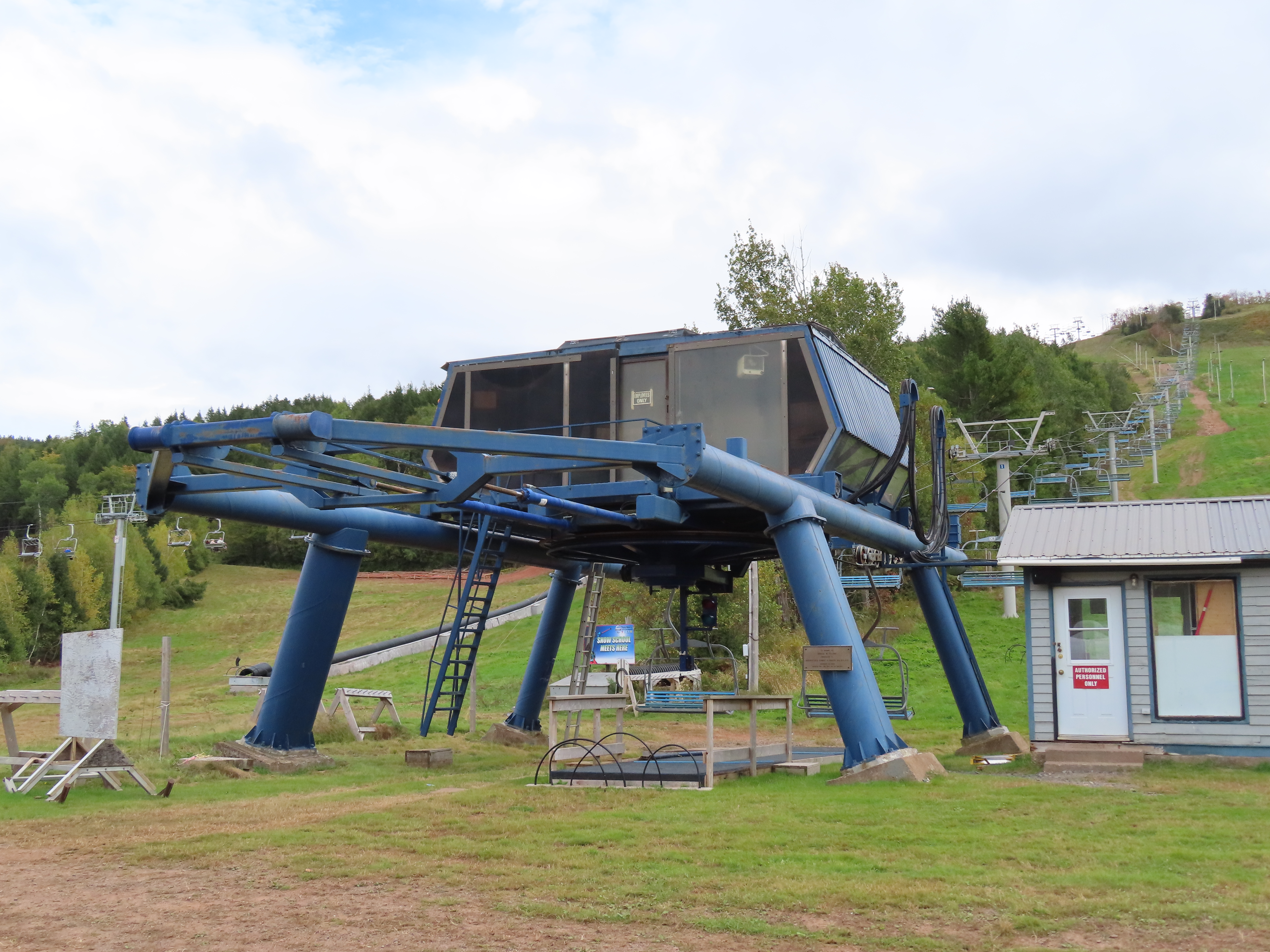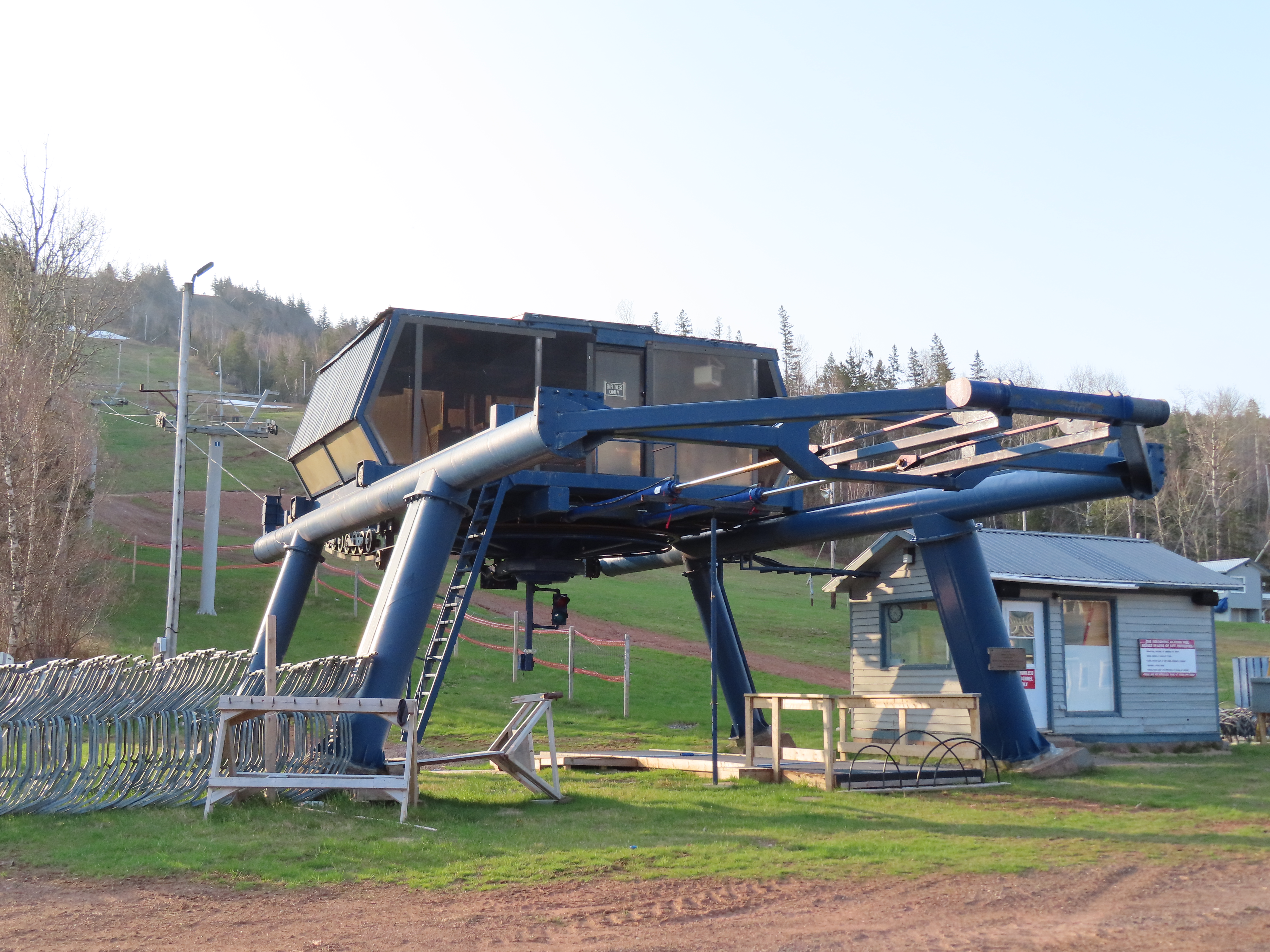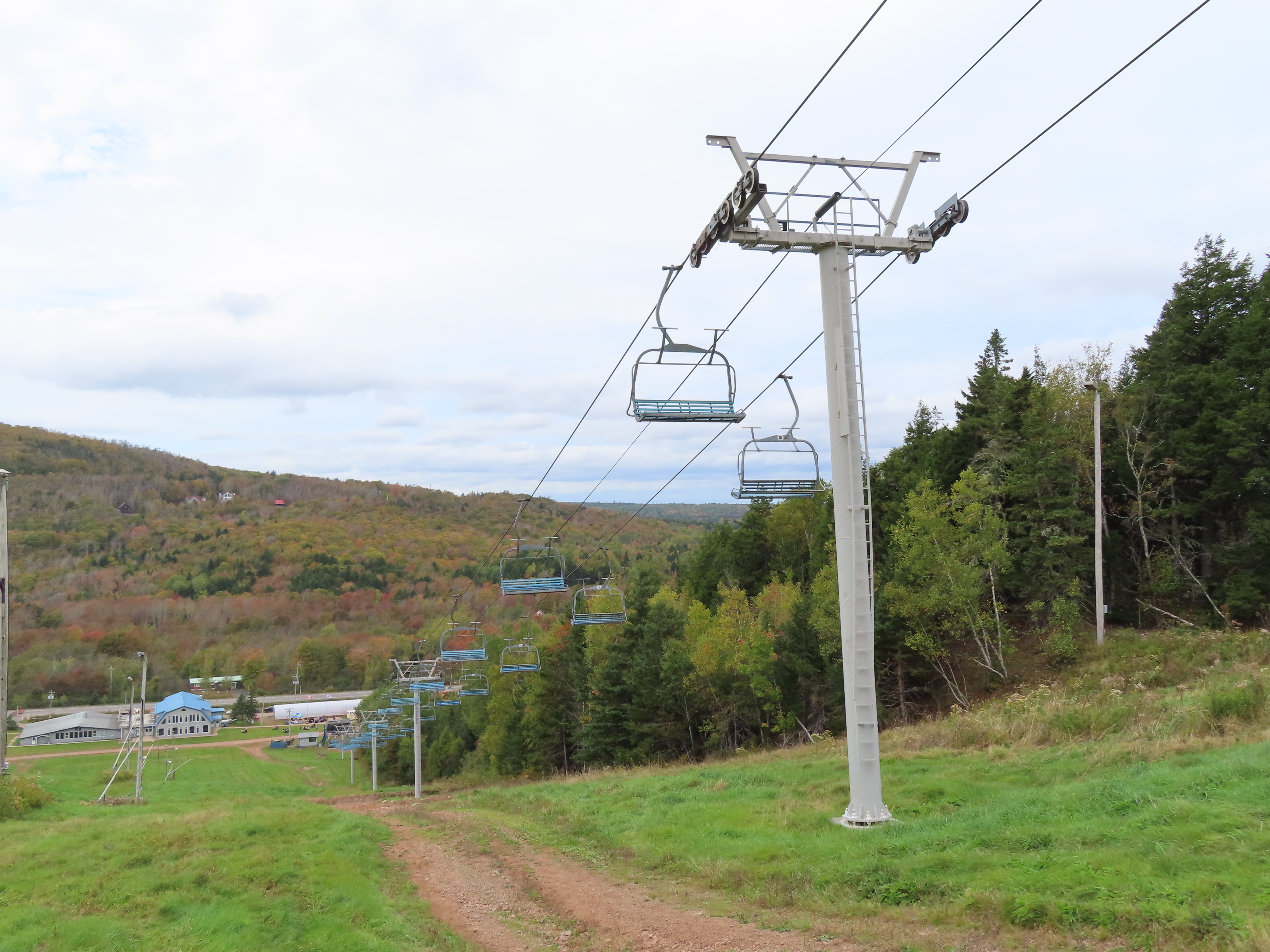 View up the middle part of the line.1980s style Doppelmayr tower.Upper part of the line.Side view of the top terminal.Upper station. Another Doppelmayr quad of similar vintage used to end here but was sold off due to financial difficulties in the early 2000s.View down near the summit.Lower part of the lift line.Side view of the bottom station.Loading area.View up from the base area.Another view of the drive-tension station.View near the summit with chairs on the line.Middle lift line.Lift overview.Lower line.View up at tower 5.