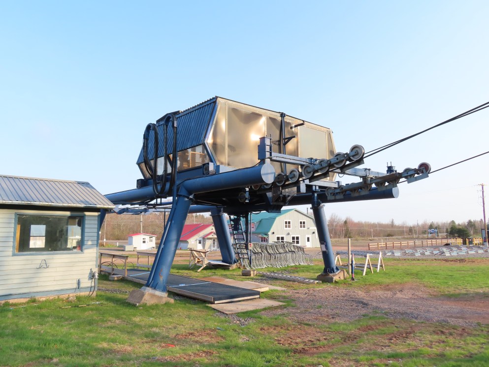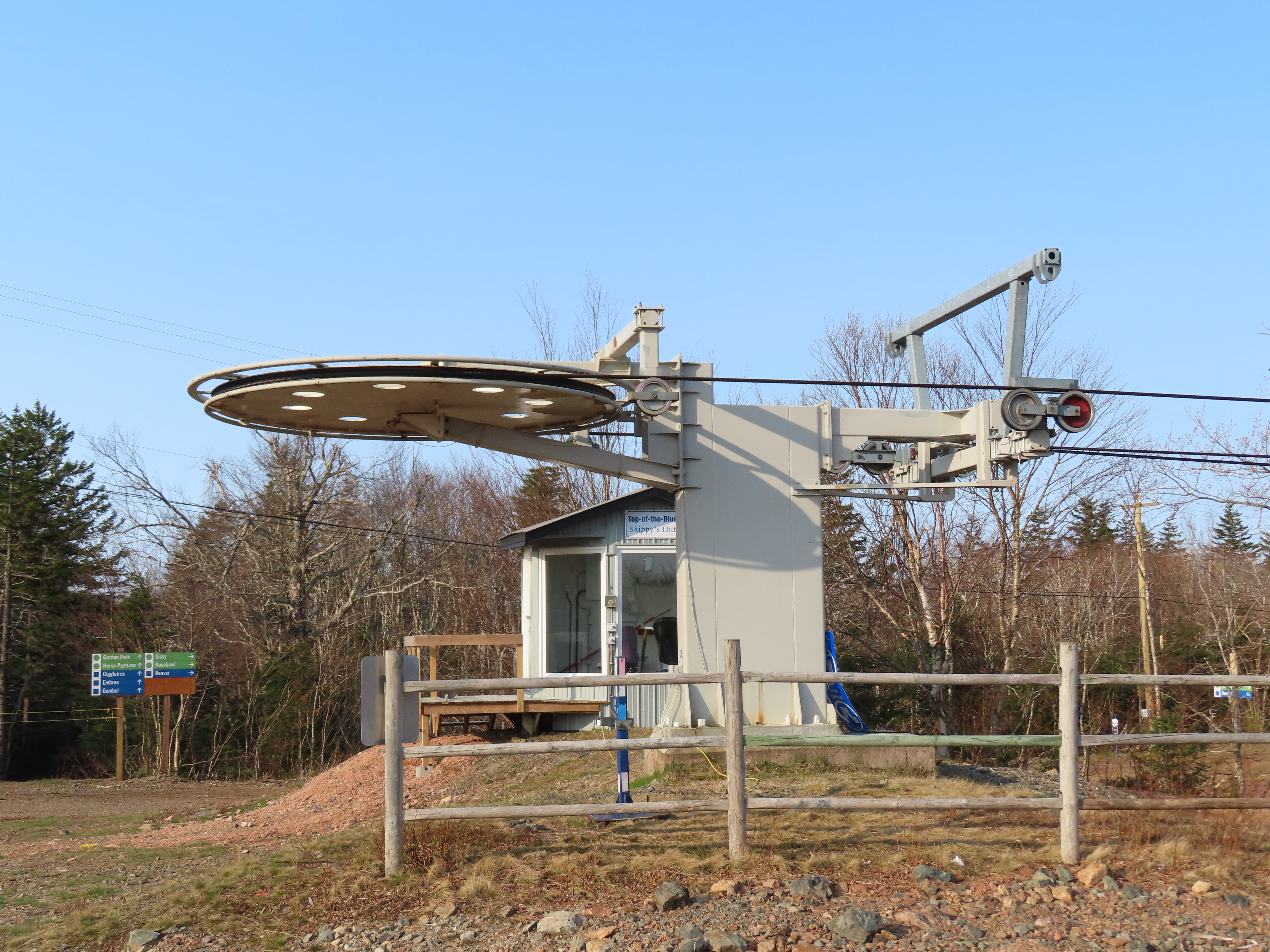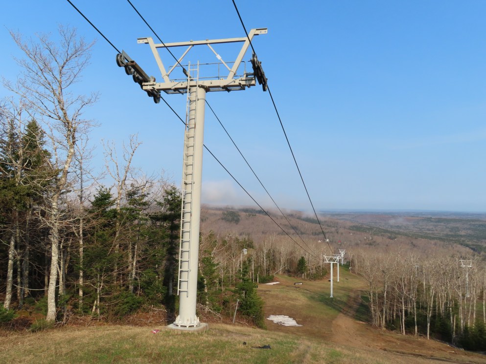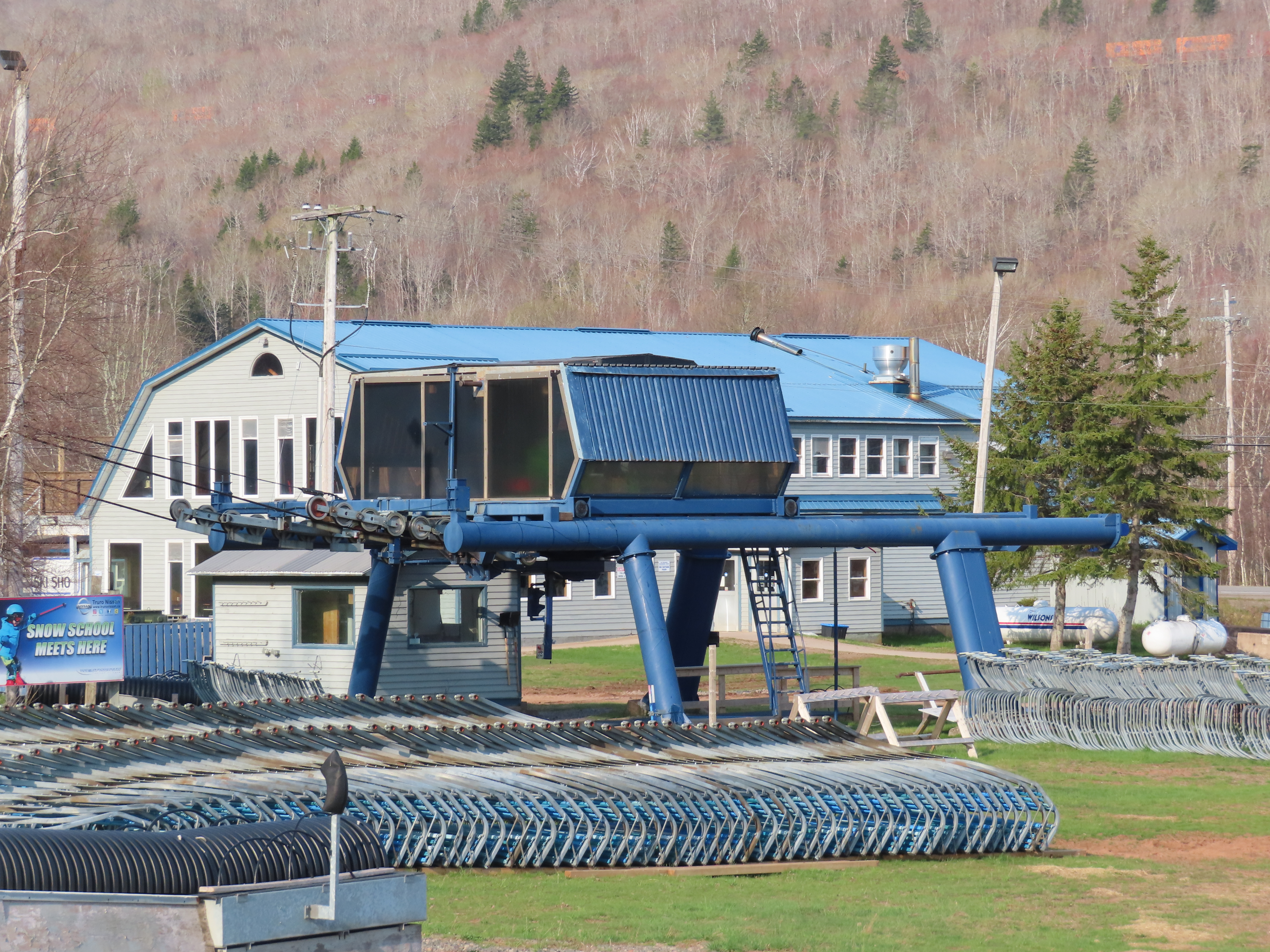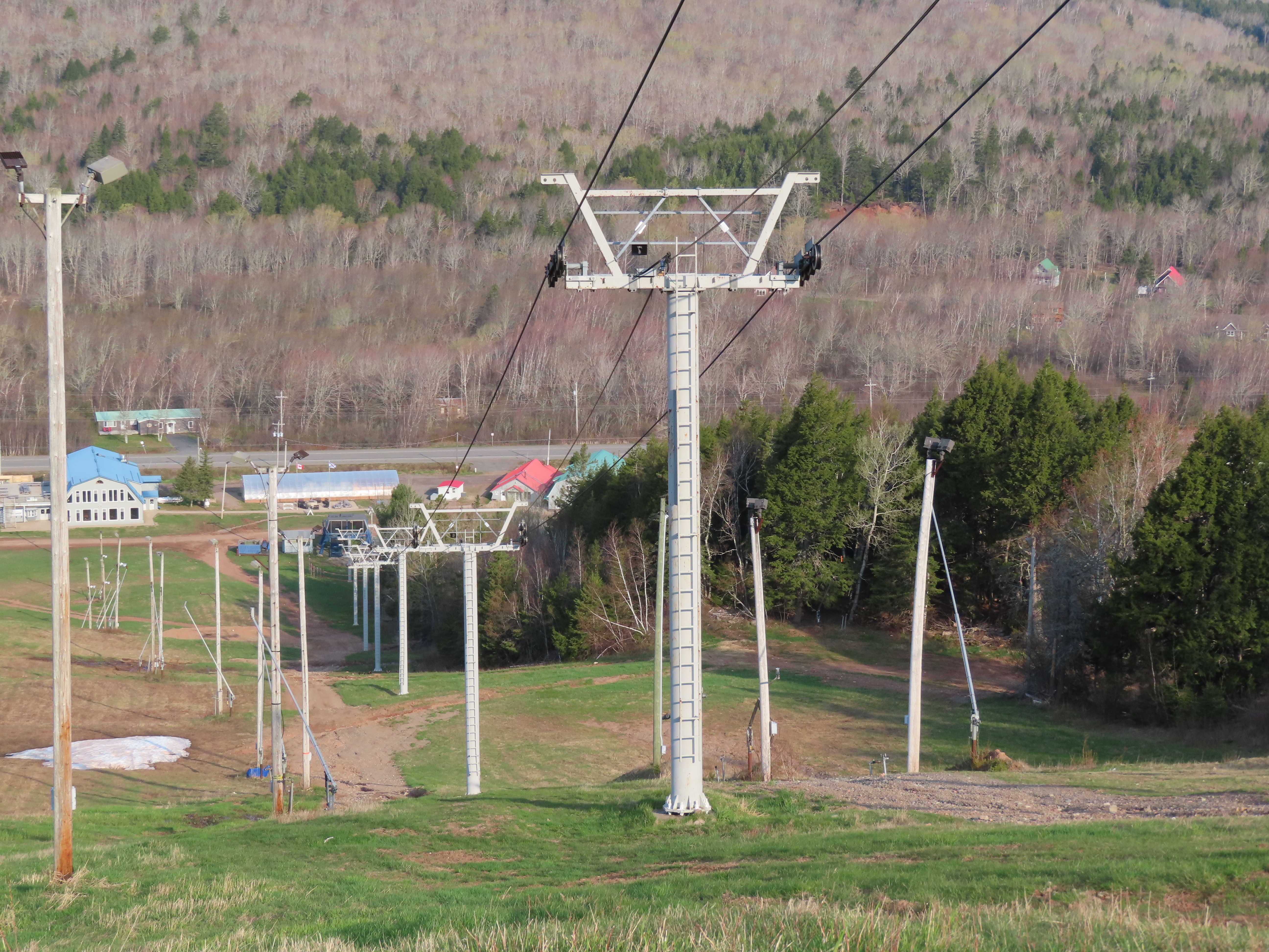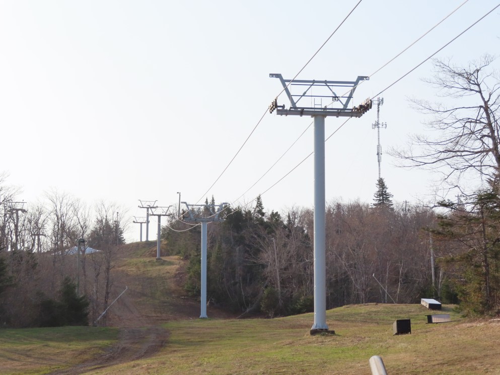 View up the middle part of the line.1980s style Doppelmayr tower.Upper part of the line.Side view of the top terminal.Upper station. Another Doppelmayr quad of similar vintage used to end here but was sold off due to financial difficulties in the early 2000s.View down near the summit.Lower part of the lift line.Side view of the bottom station.Loading area.View up from the base area.Another view of the drive-tension station.View near the summit with chairs on the line.Middle lift line.Lift overview.Lower line.View up at tower 5.