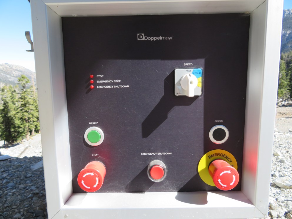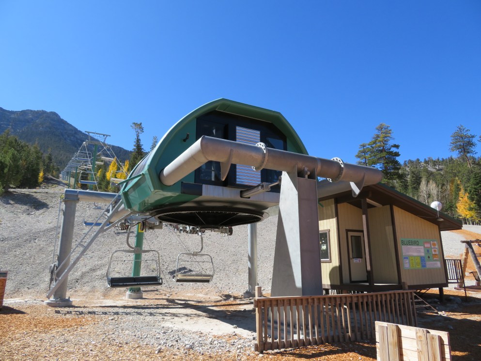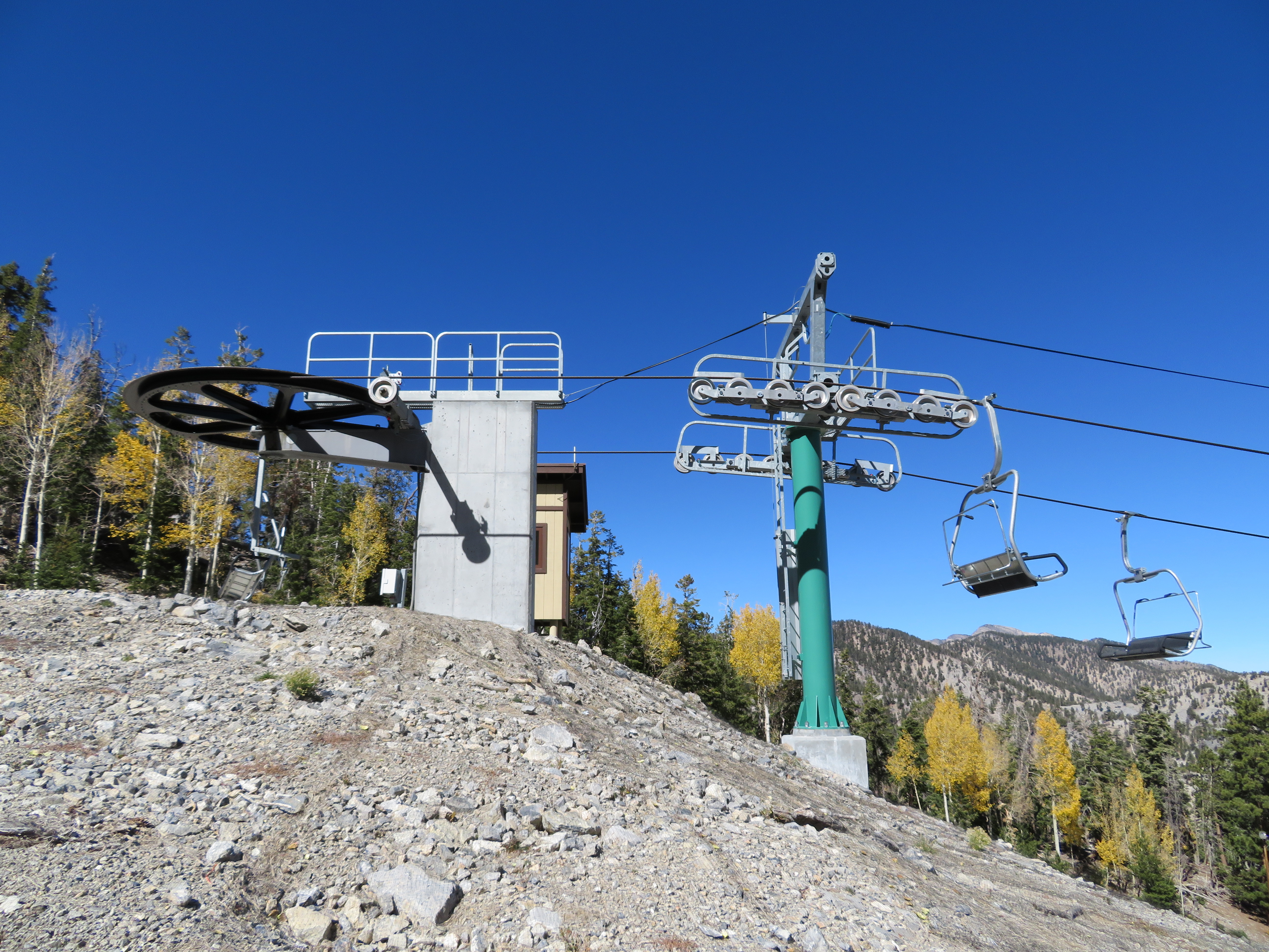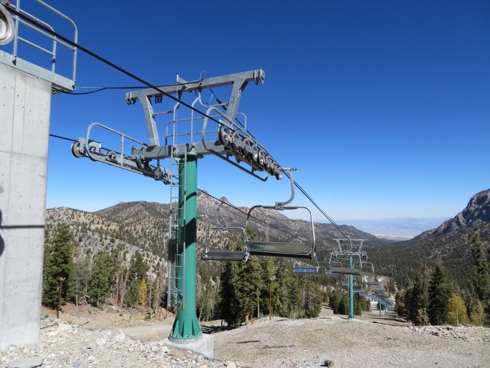 This is the longest lift at Lee Canyon and services intermediate terrain.It replaced a Hall double in 2014.View up the upper lift line.Lift line overview.Tower 12.Last tower and the top bullwheel.Detachable-style controls.View down from tower 13.Tristar bottom station.Tower 1.Loading area and motor room with hydraulic tensioning.Lift line in the fall.