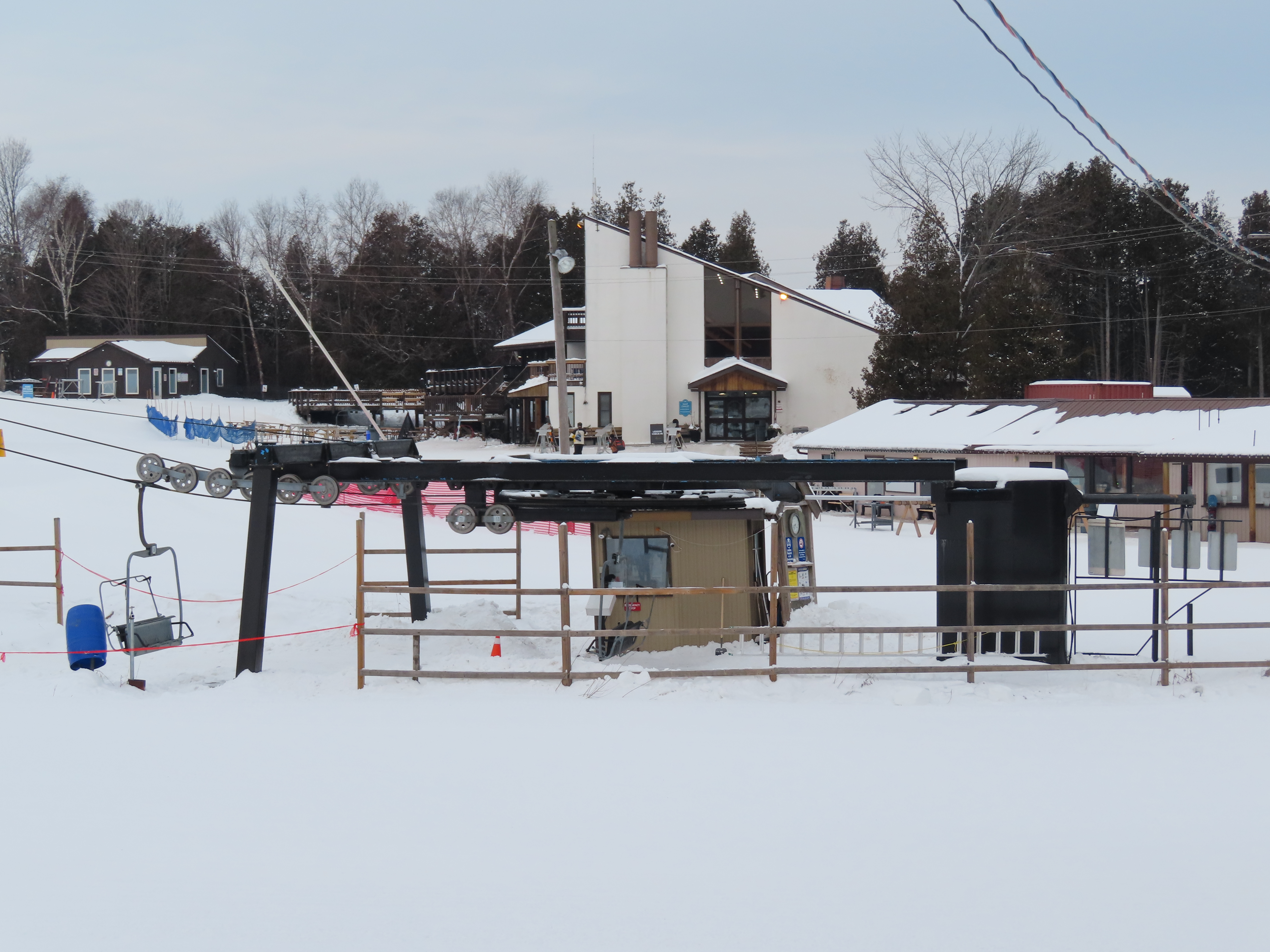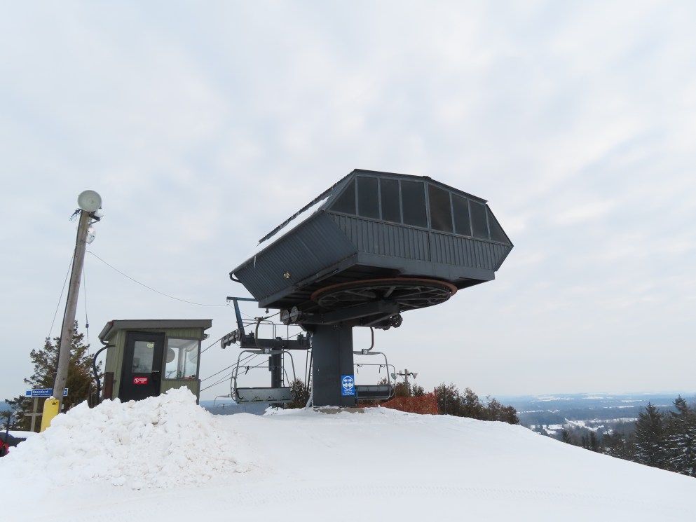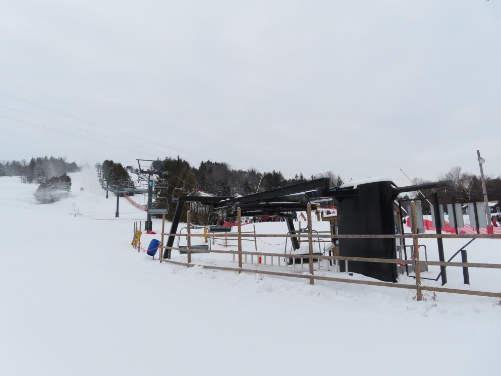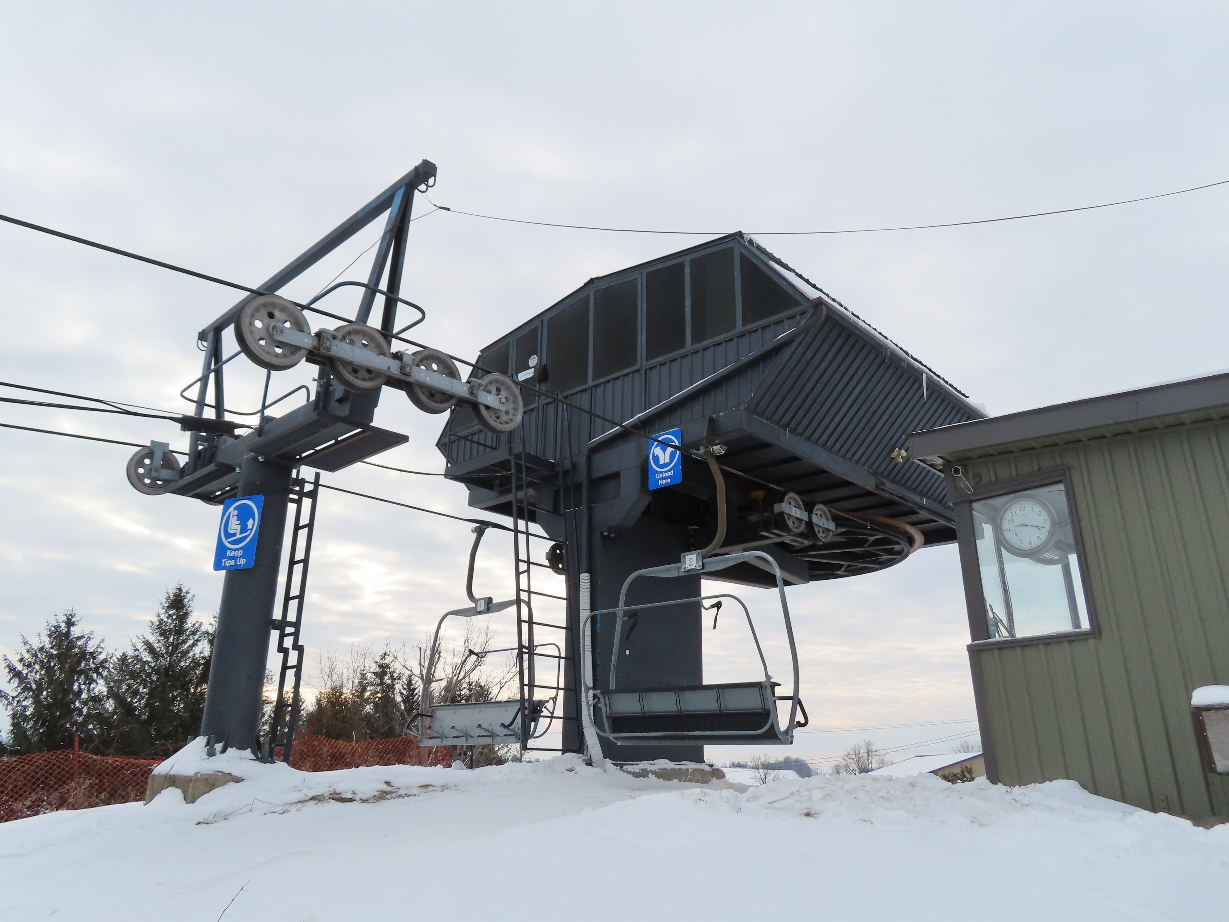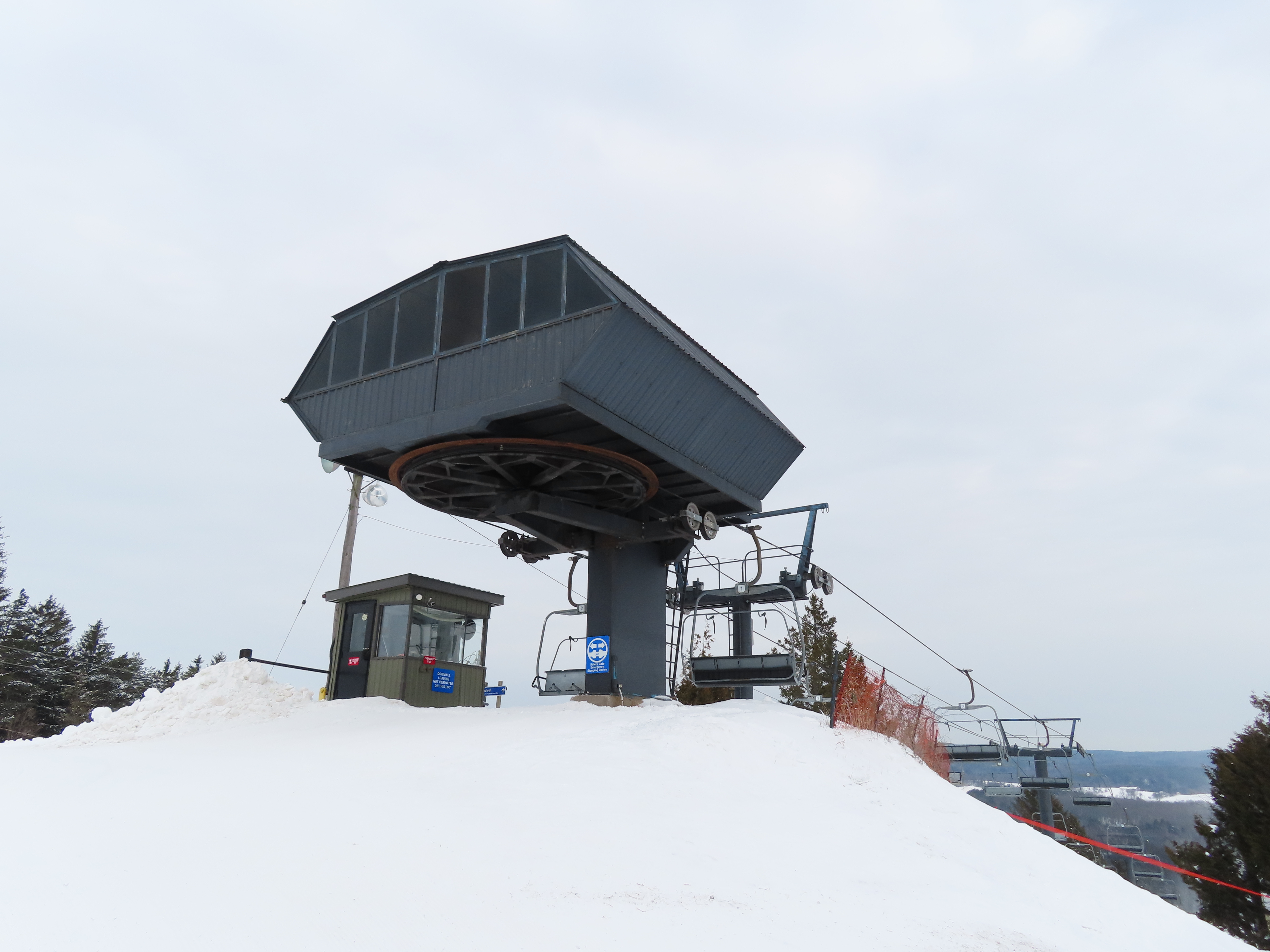 This lift is one of two Blue Mountain quads built at Brimacombe, formerly the Oshawa Ski Club.Loading area.Fixed top drive terminal.Upper station overview.Chairs on this lift are Poma.View up the lift line.Tower 1 in the base area.Downhill end of the top terminal.Lift overview.