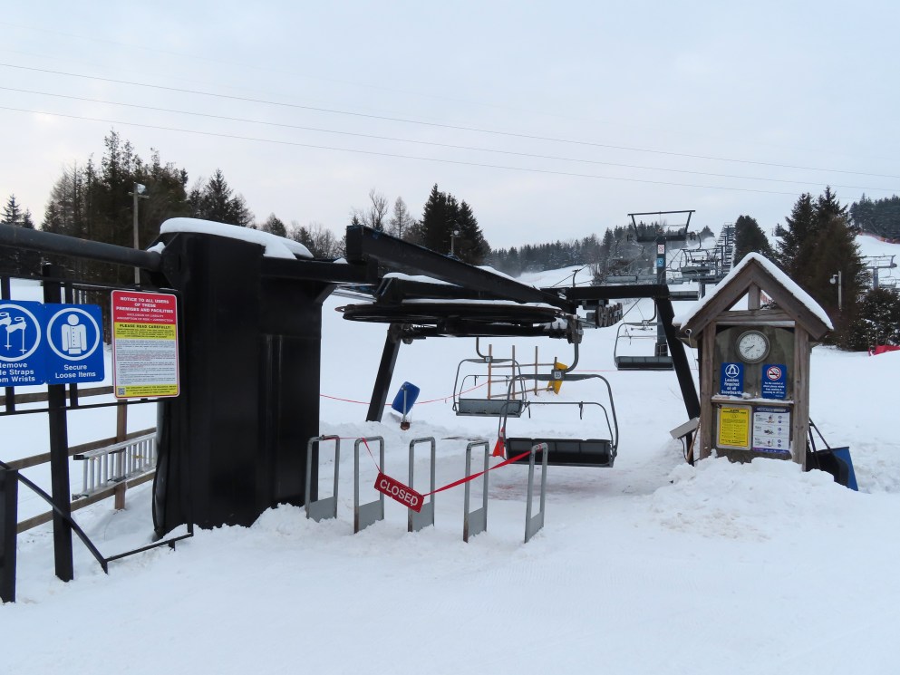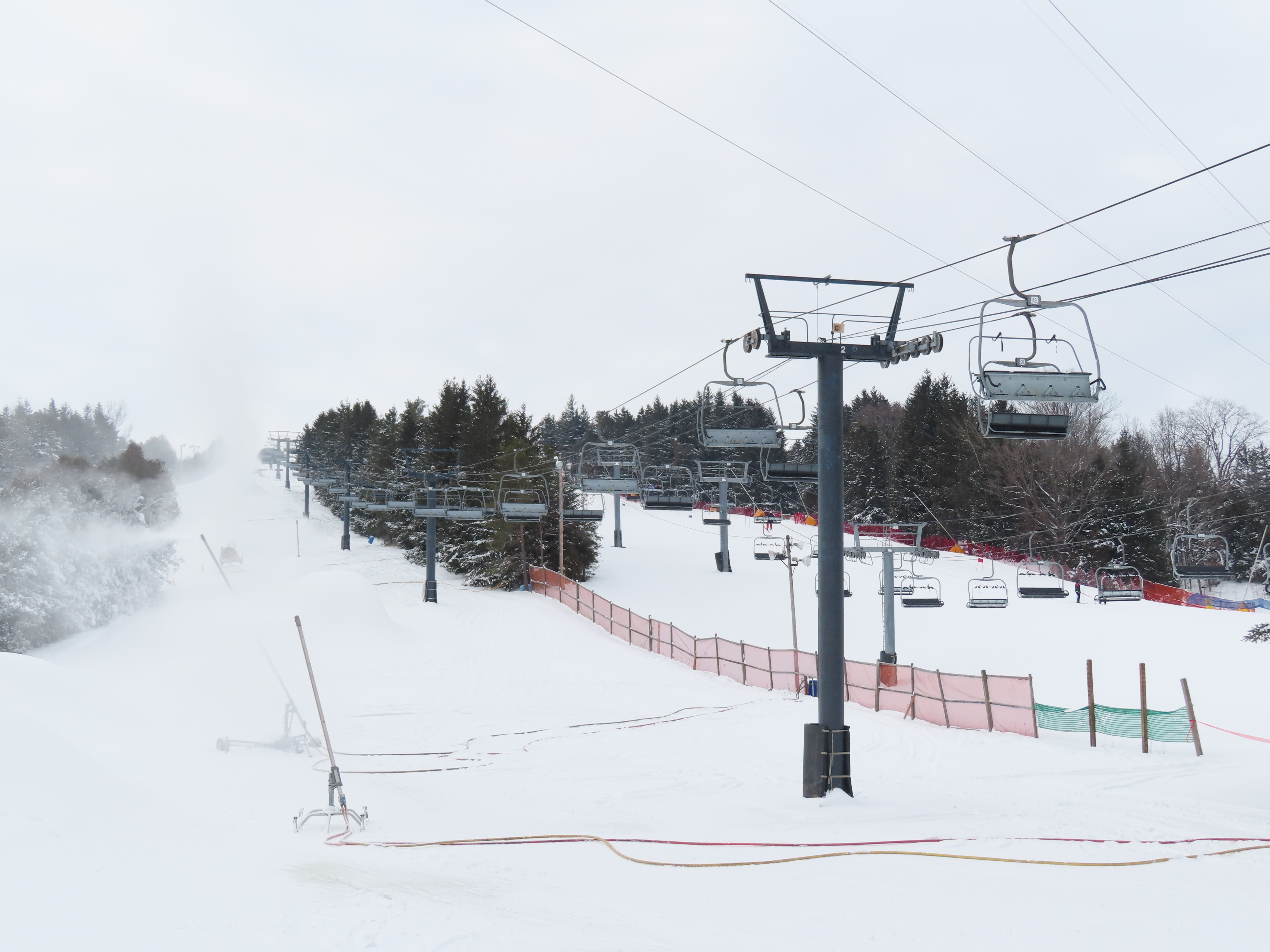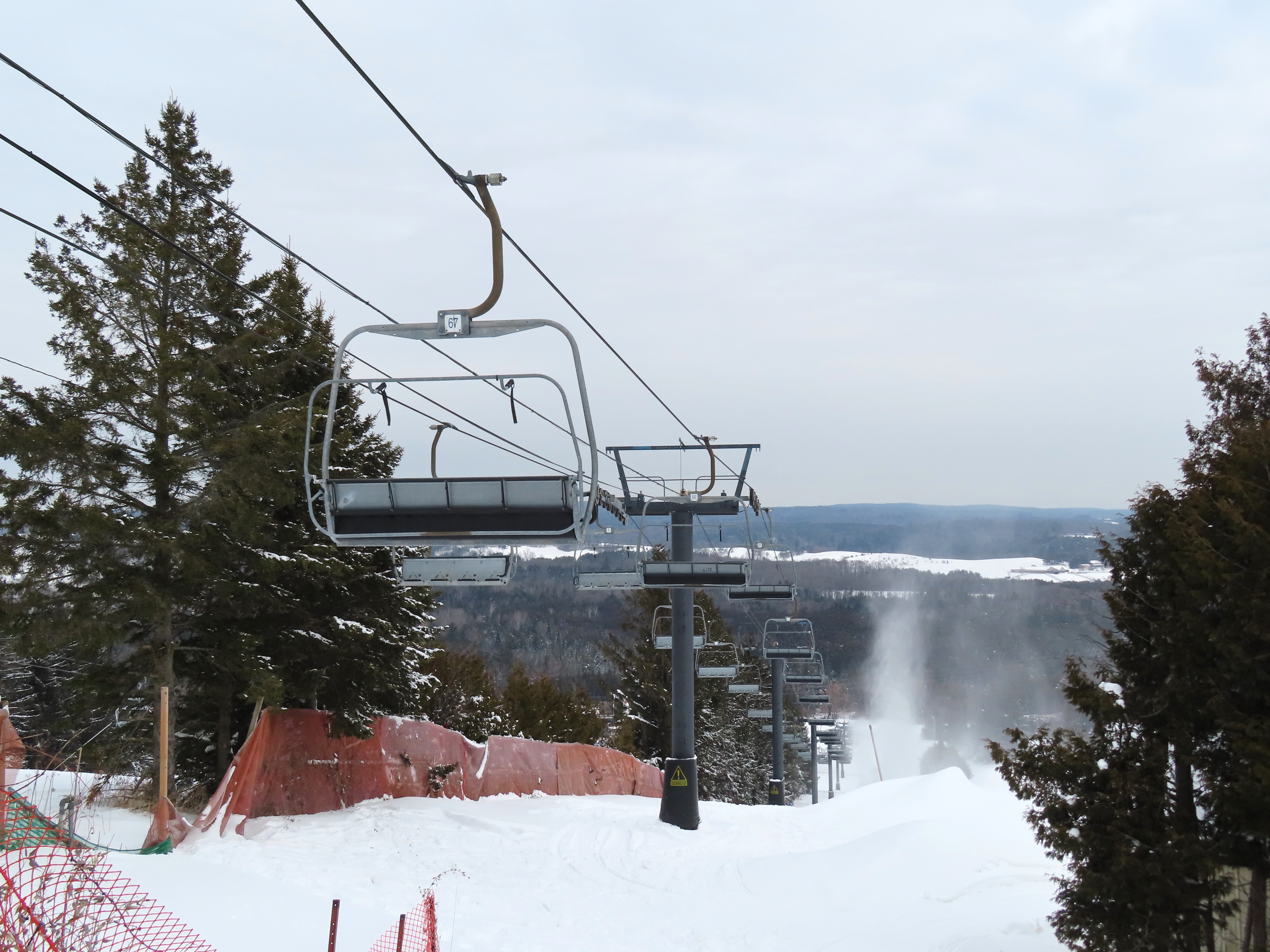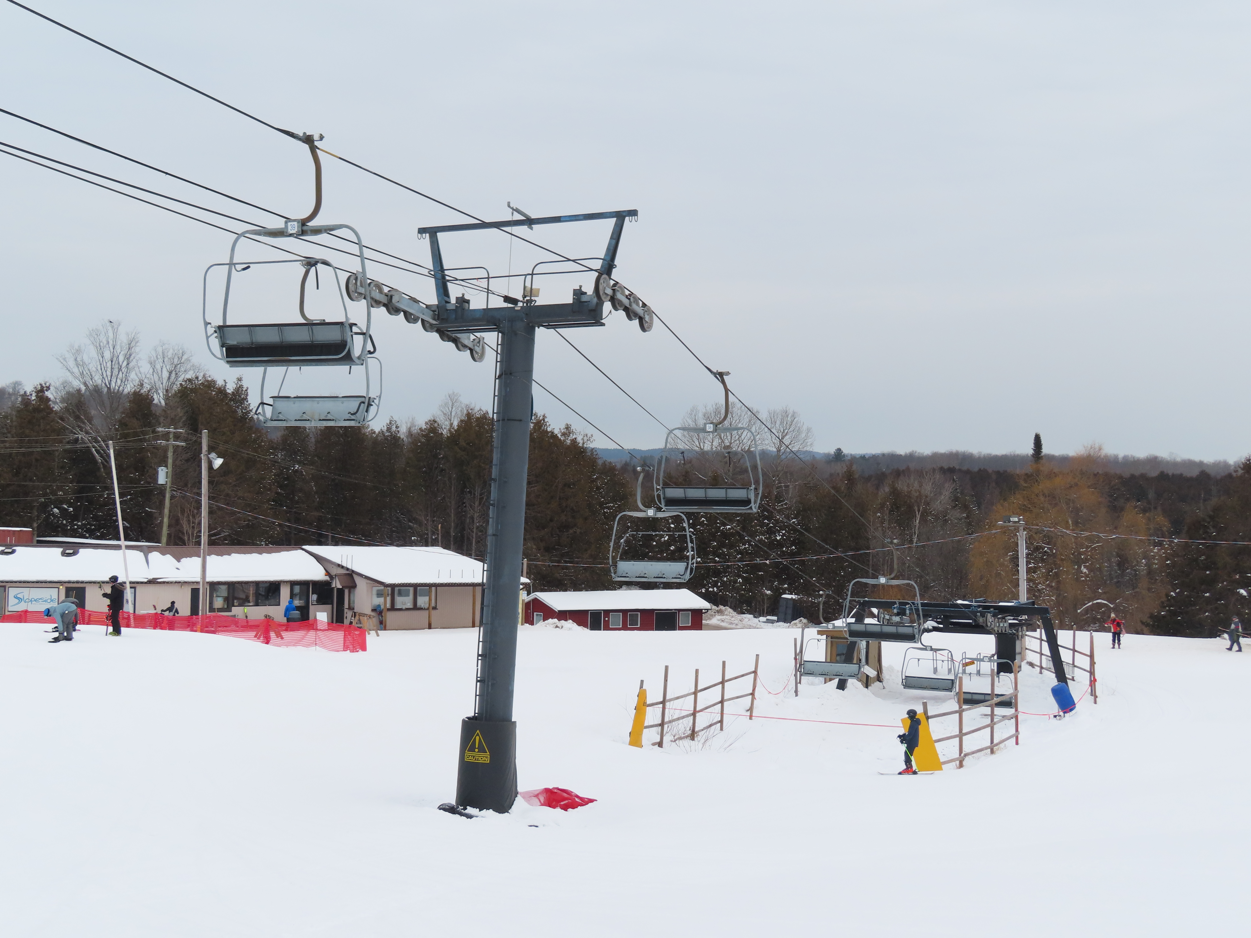 This lift is one of two Blue Mountain quads built at Brimacombe, formerly the Oshawa Ski Club.Loading area.Fixed top drive terminal.Upper station overview.Chairs on this lift are Poma.View up the lift line.Tower 1 in the base area.Downhill end of the top terminal.Lift overview.