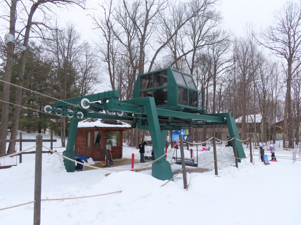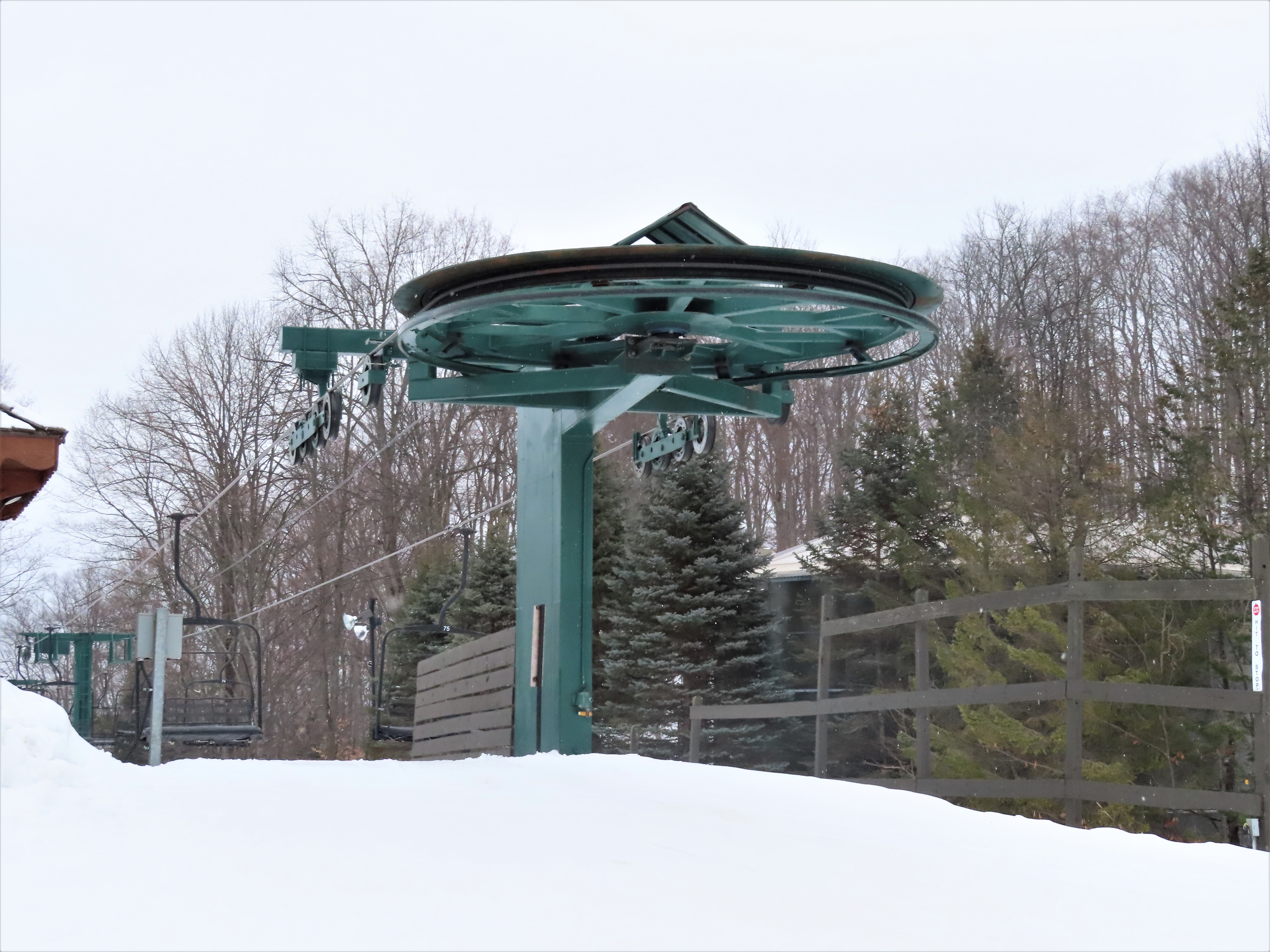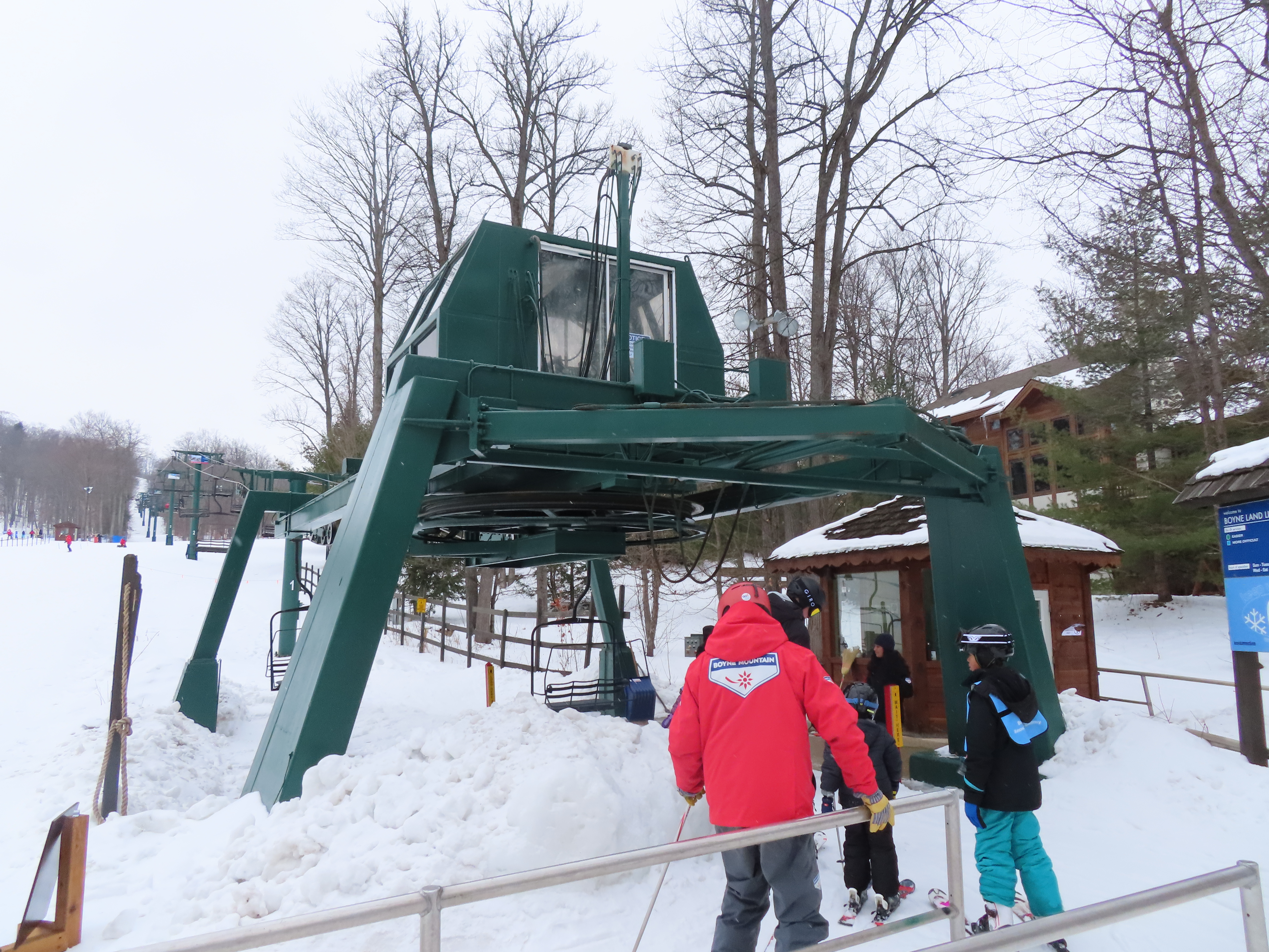 Among the two Boyne Michigan resorts, this is the only Borvig lift.This beginner lift passes mostly through forest.Looking up the line.Lower lift line.Drive station.Loading area and lift line.Arriving at the return with Disciples Ridge in the background.Top bullwheel.Lift line seen from above.