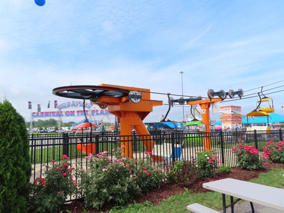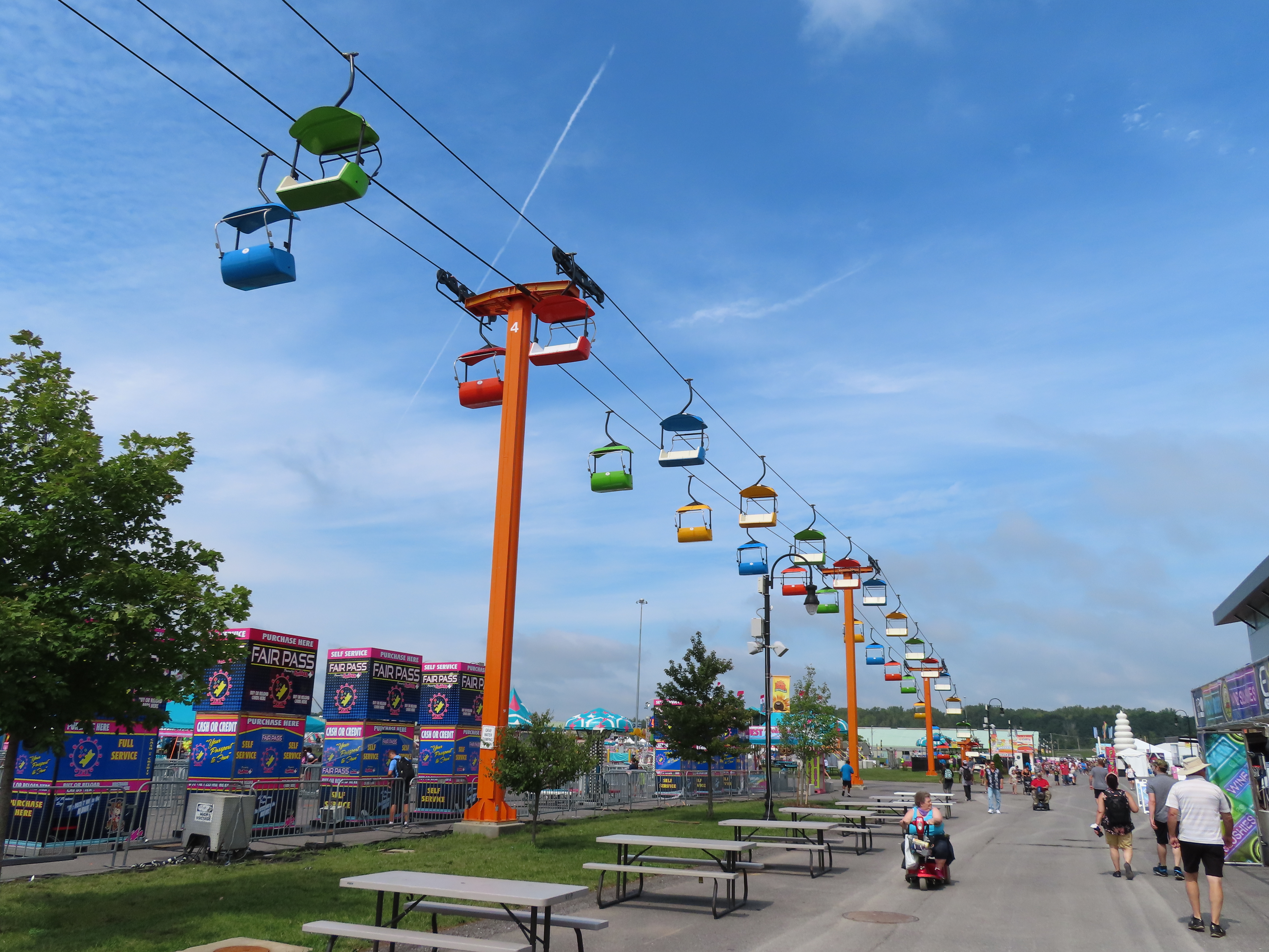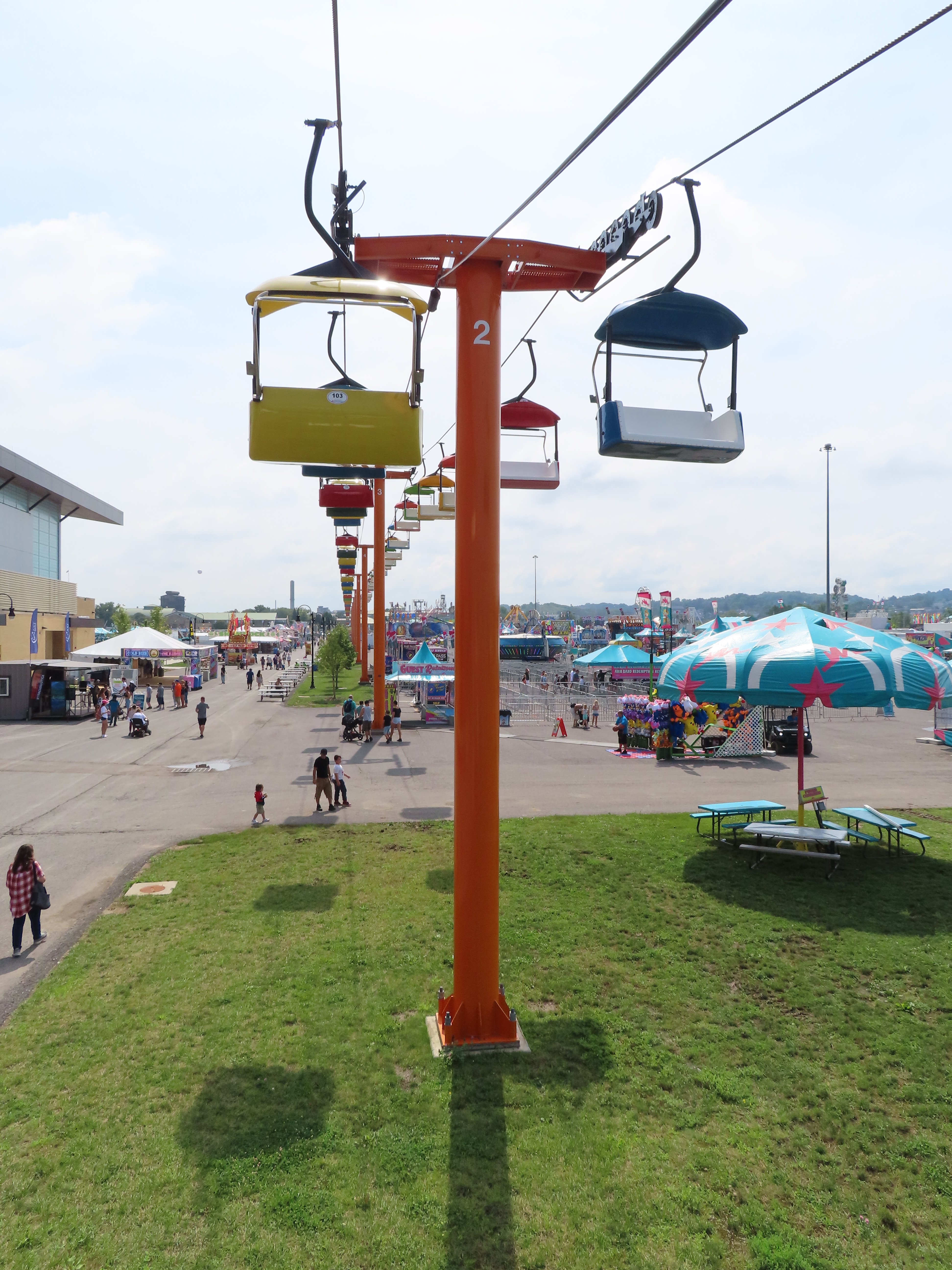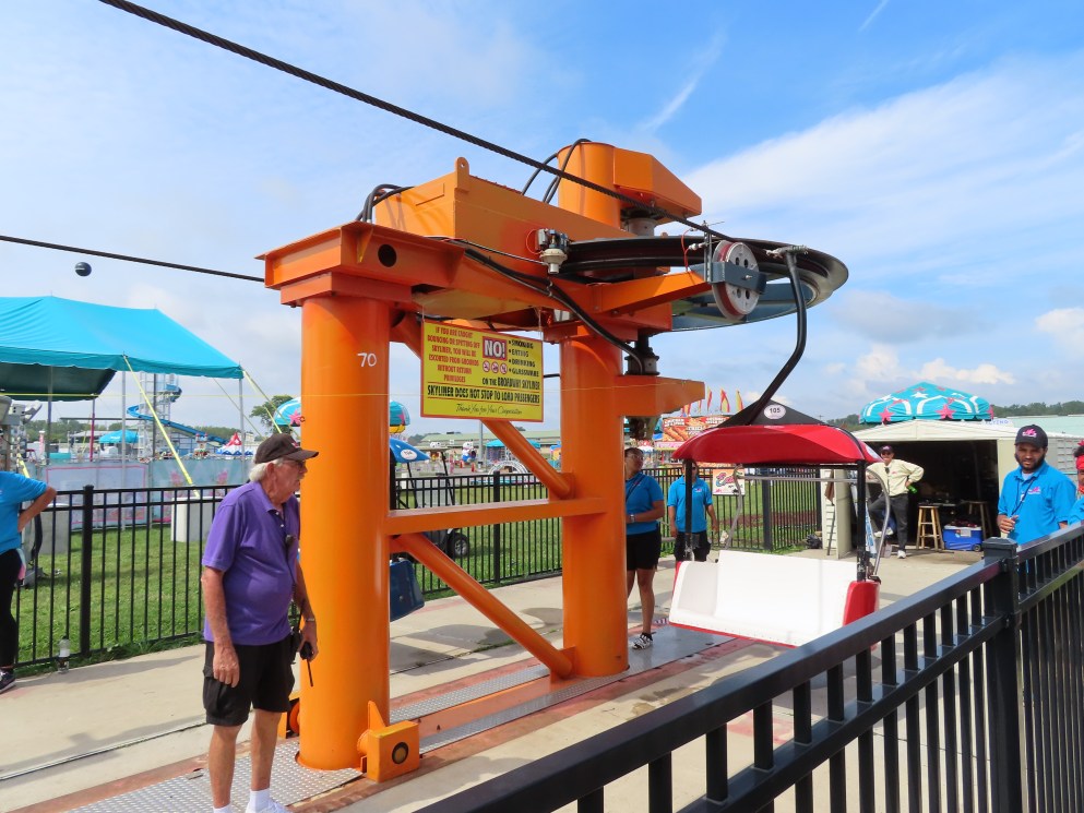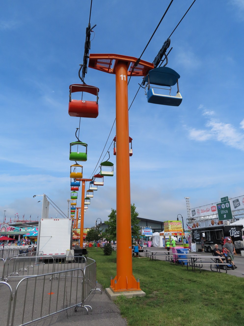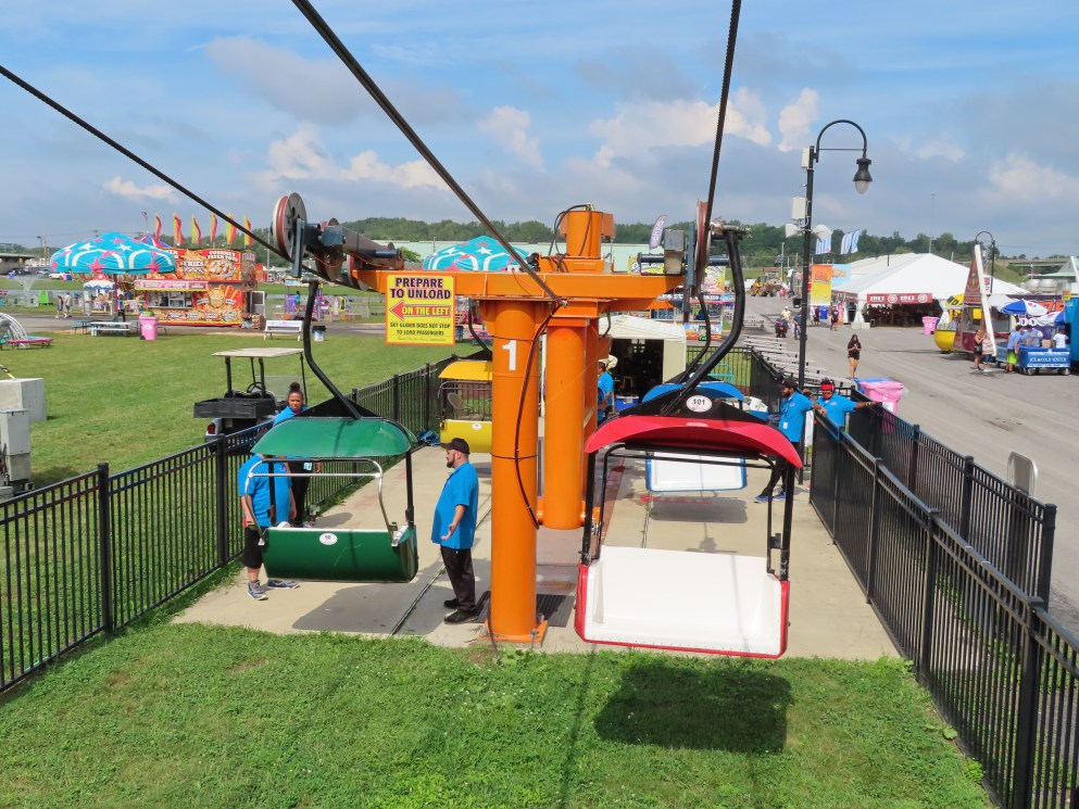 This lift came to the State Fair in 2017 with a mix of new and remanufactured parts.Mostly new Skytrans terminal.Side view of the east station.The towers are Stadeli and came from Sugarloaf’s Bucksaw lift.Carriers above the midway.The last four towers.Tall towers in the middle of the line.The western half of the lift.Lift line.Tower 3.The drive terminal.Loading area.Looking east.Drive bullwheel.Tower 1 with operator controls.View back to T1.Stadeli tower 2.A carrier.Fixed return terminal.