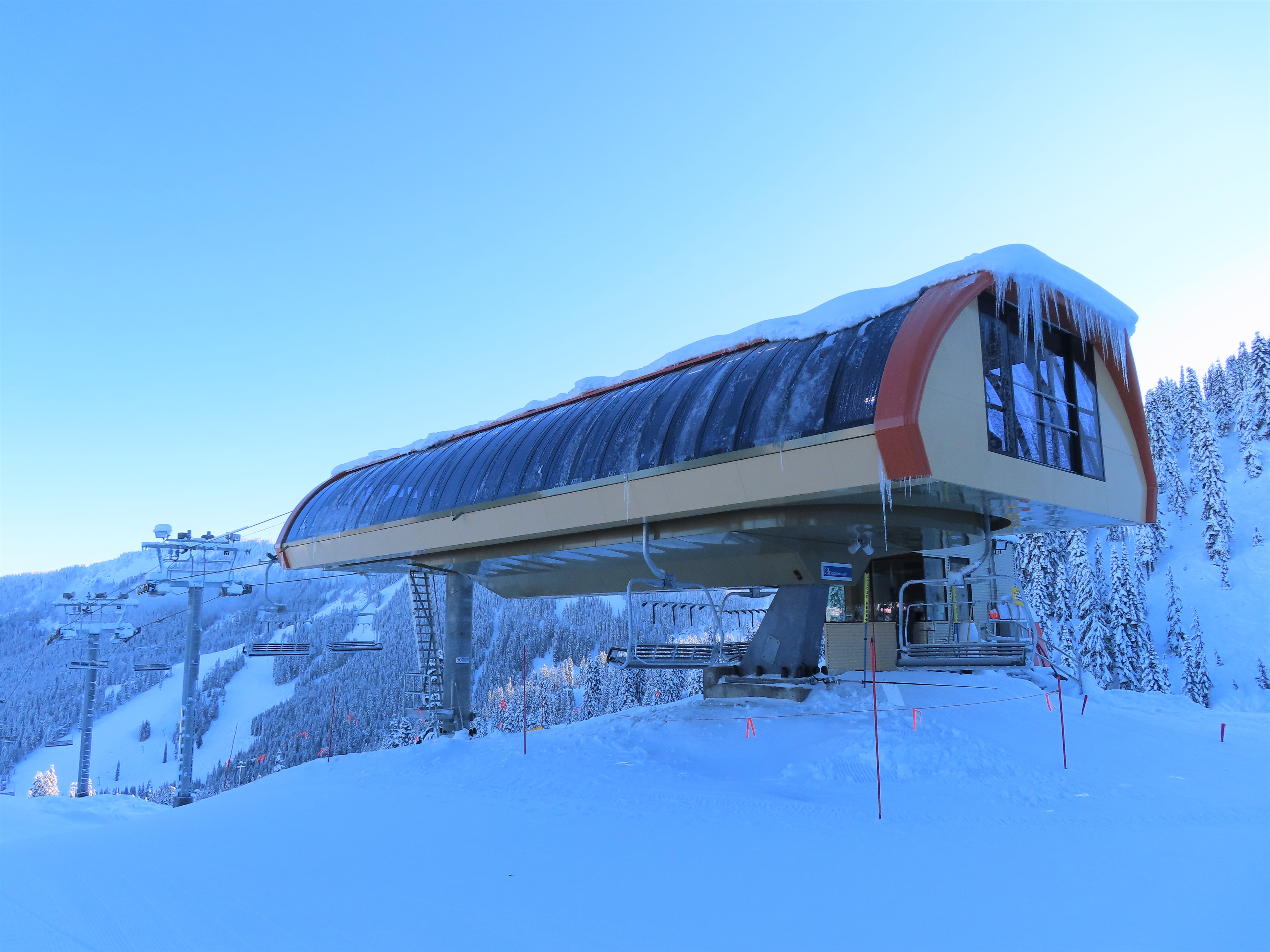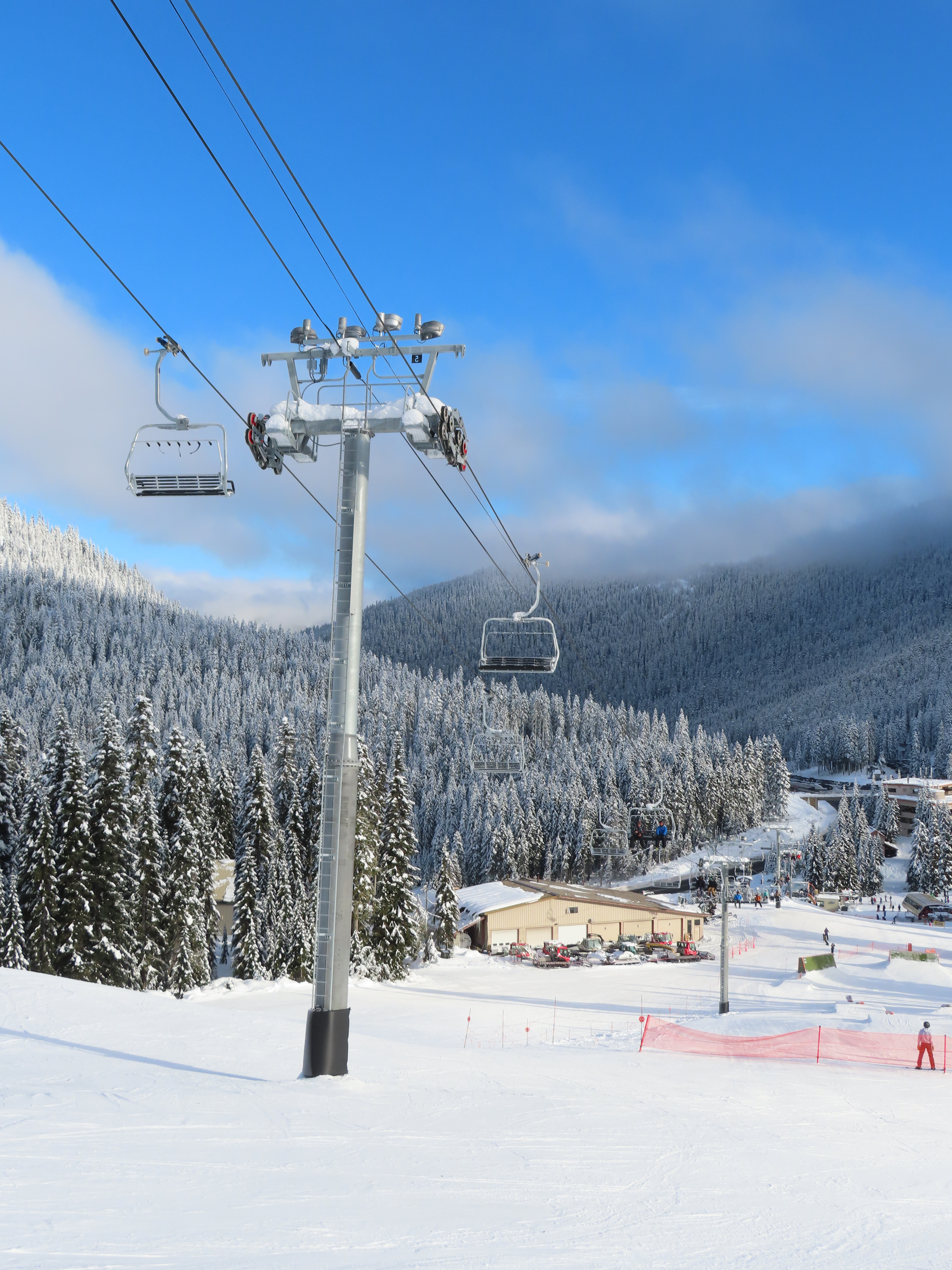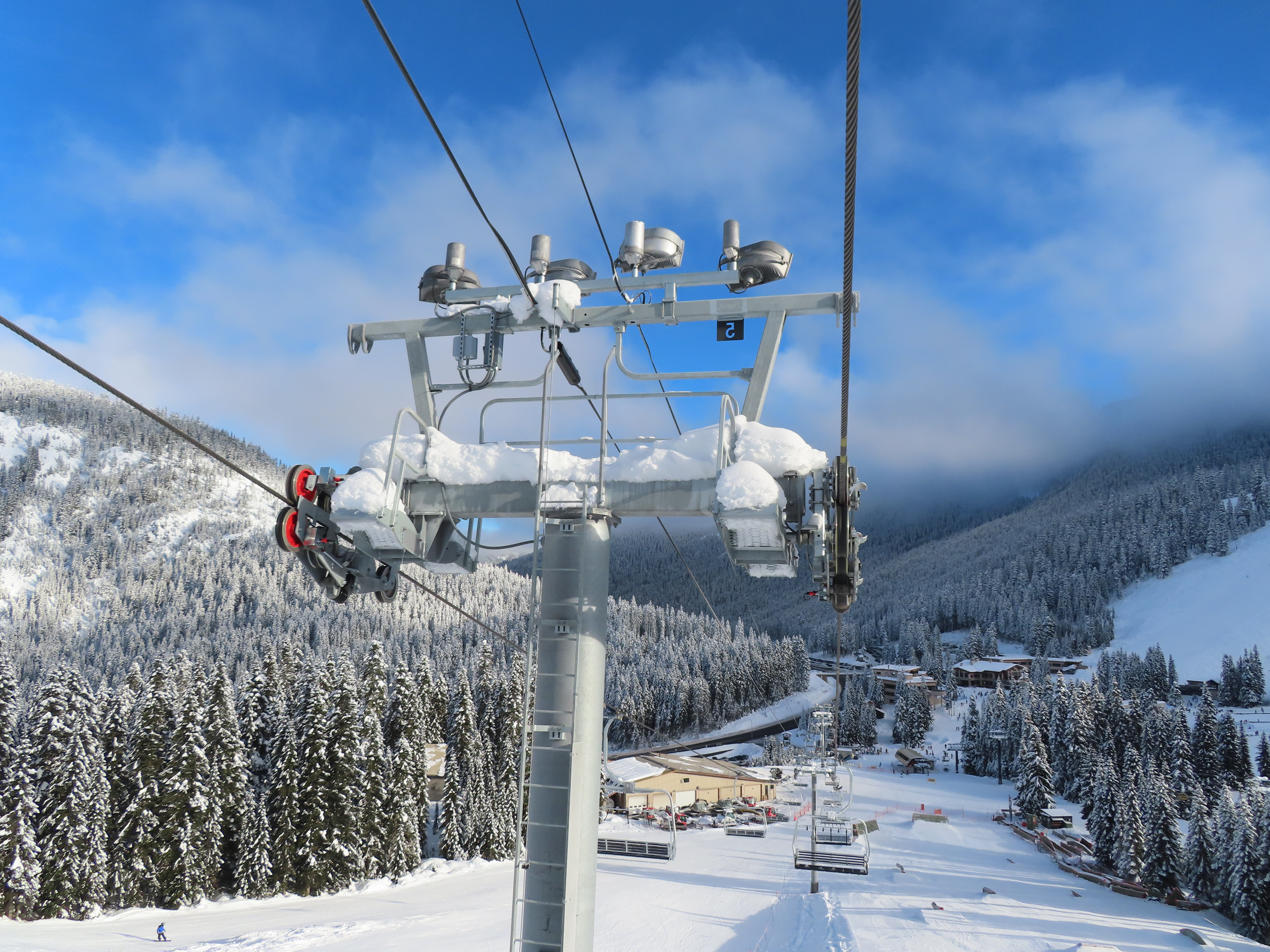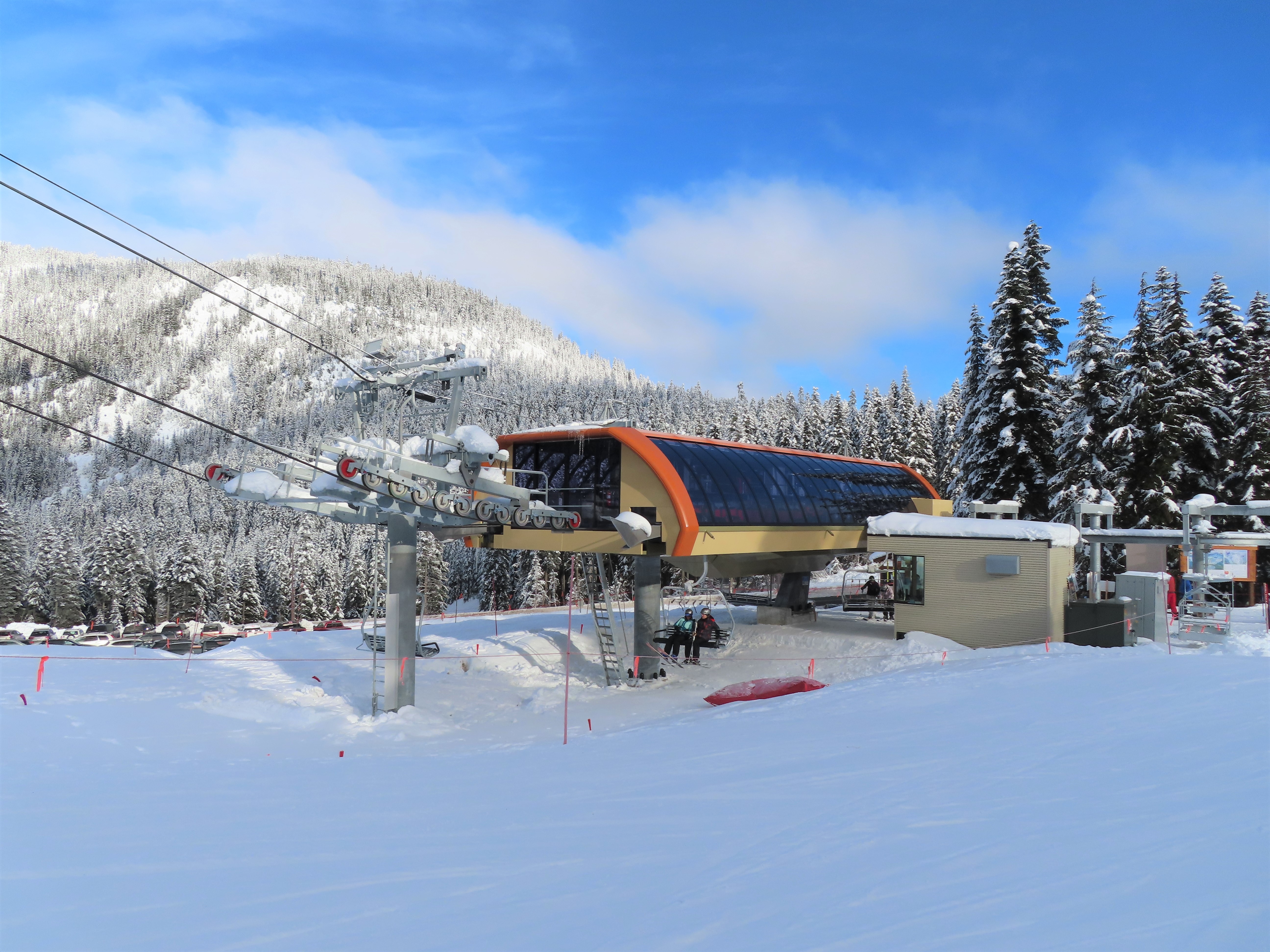 The Brooks Express replaced a Riblet double in 2019.The top terminal is longer than the bottom and houses the tensioning system.Top return terminal.Downhill end of the top station.View down the lift line.Looking up the line.Tower 9.The alignment has lots of ups and down.The top terminal seen from Skyline.Side view of the top station.Unique sheave configuration.Breakover towers.Small maintenance rail at the bottom.Riding up at tower 3.Middle lift line.Looking back at tower 6.Riding up the middle part of the line.The final two towers.Arriving at the return.View from the summit.Tower 13.Lower part of the line.The bottom terminal.Loading area.Doppelmayr Connect controls.As part of the Brooks Express construction, the Skyline Express was moved uphill.Riding out of the base area.A chair with wind slats and no footrests.Combo assemblies.Tower 6.Tower 15 with UV guards.Depression tower 8.Lower part of the lift line.Side view of an eight sheave combination assembly.The bottom station.Drive station.Lower terminal next to Skyline and Hogsback.