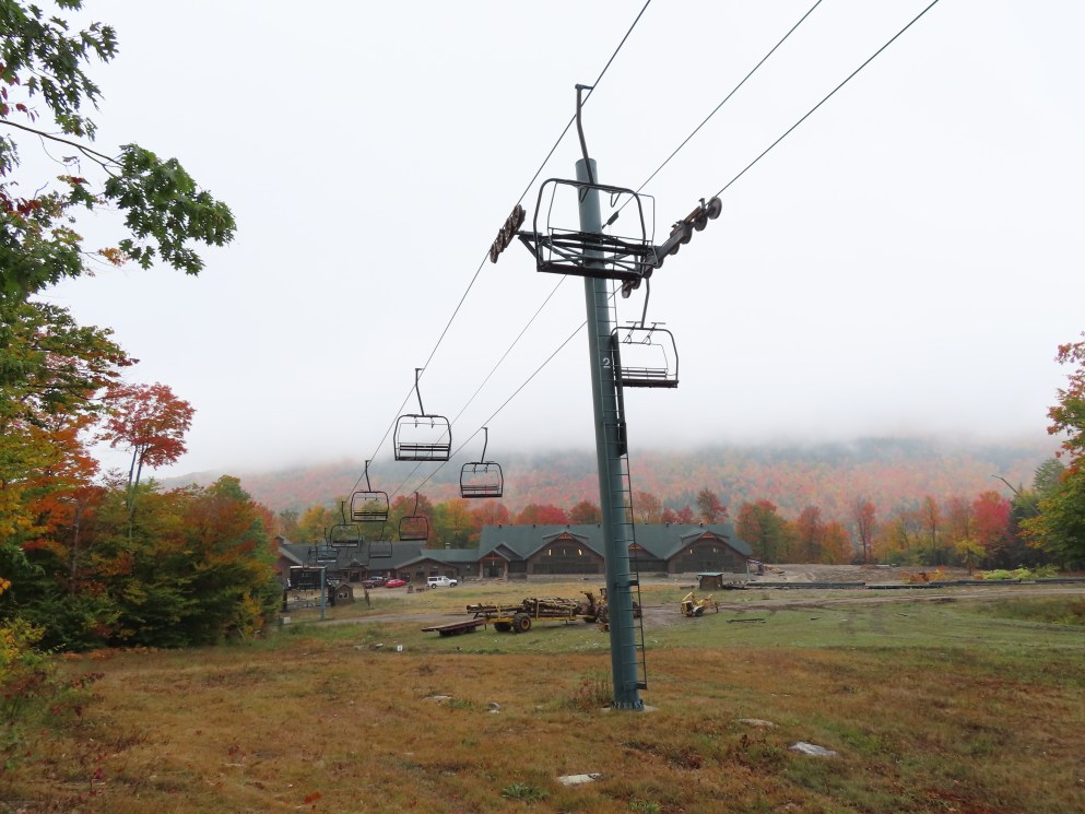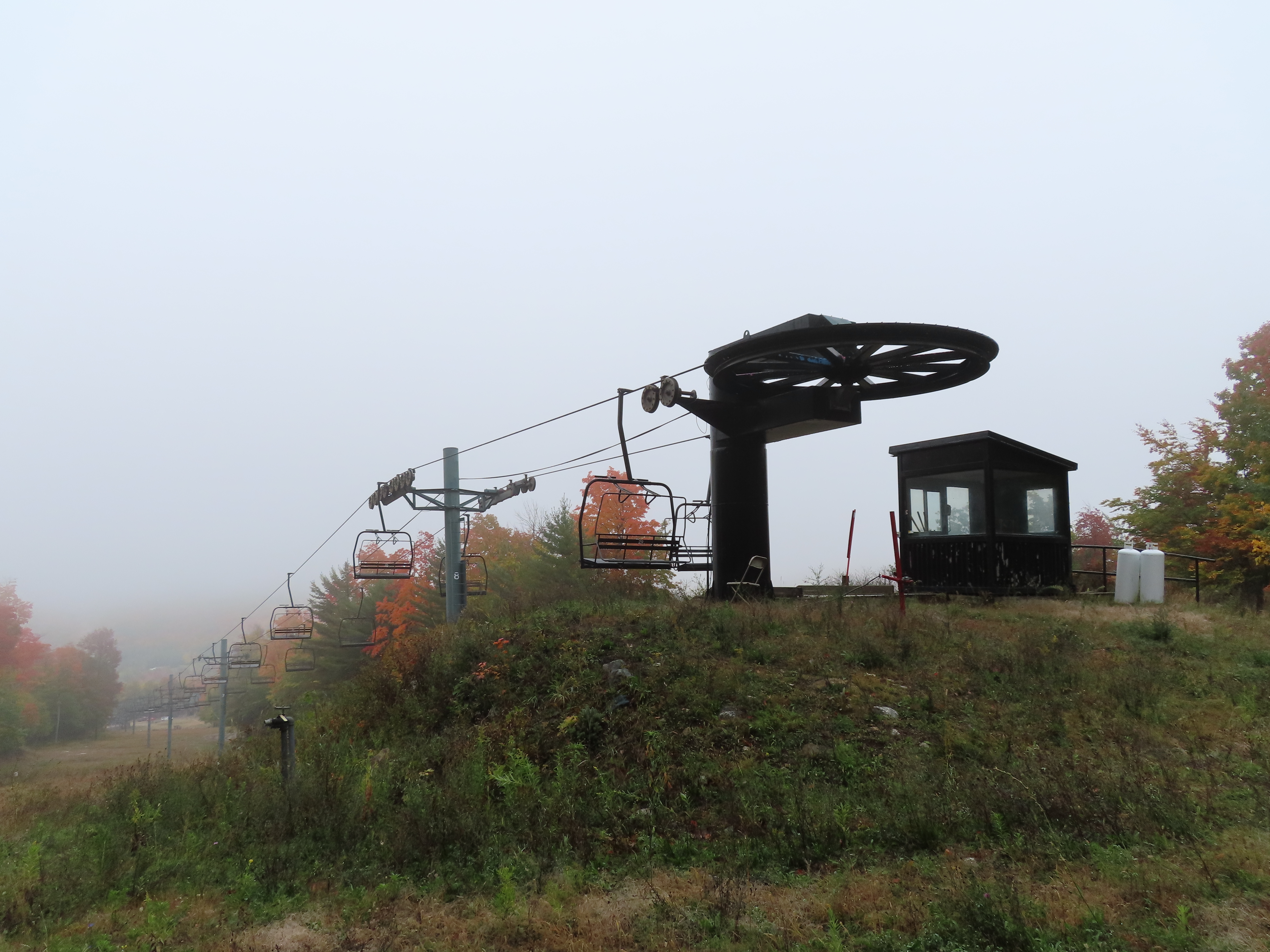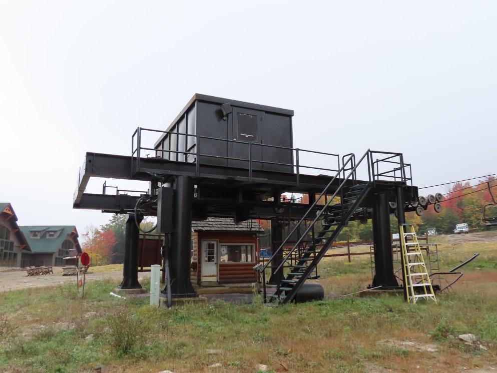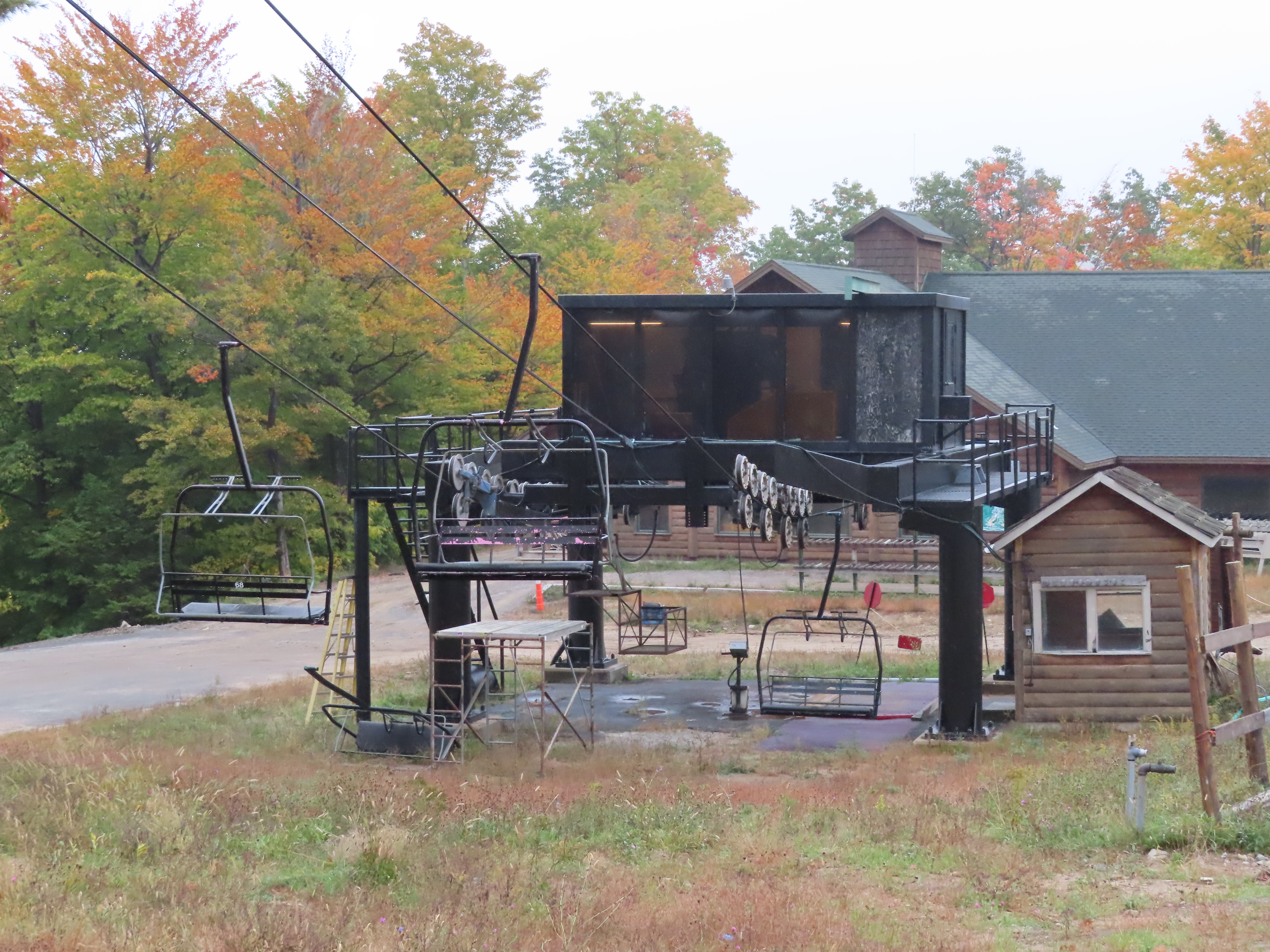 As for the lift in the boneyard, it’s not actually a complete lift. There are no towers. It was the Mid Station Shuttle Double, half of a tandem lift. The other half went to Gore as the Topridge Triple, with used Hall and Riblet tower tubes, and some new parts from CTEC. Since they no longer had the other side, the tandem towers were scrapped. I’m not sure if any of this is still there, but as of October 2018, they had a motor room enclosure, a bullwheel, some sheave trains, and a whole bunch of chairs still in the boneyard. It’s been a parts donor for all the other Hall lifts at Whiteface. Chair seats and sheaves have clearly been removed for use elsewhere.
