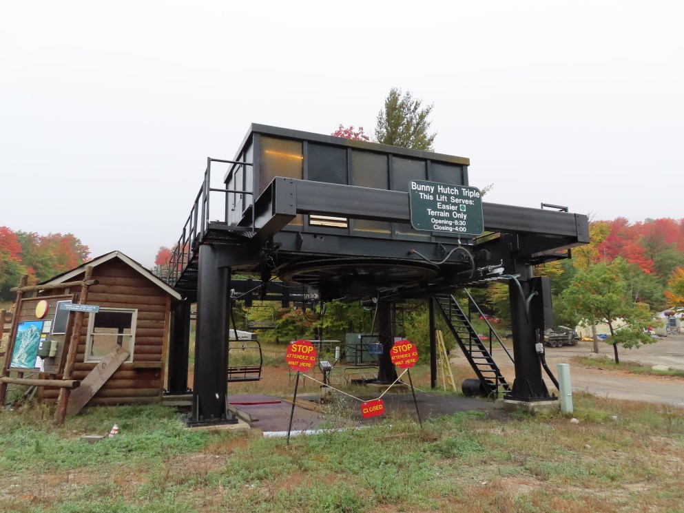 The lone remaining Riblet at a mountain that once had a handful, Bunny Hutch services the Bear Den beginner base area.Fixed return bullwheel at the top.Lift line.Upper part of the lift.Lower lift line. These look like double towers from another lift that were widened.View up from the base.Riblet ’80s-style drive station.Loading area.Side view of the bottom station.