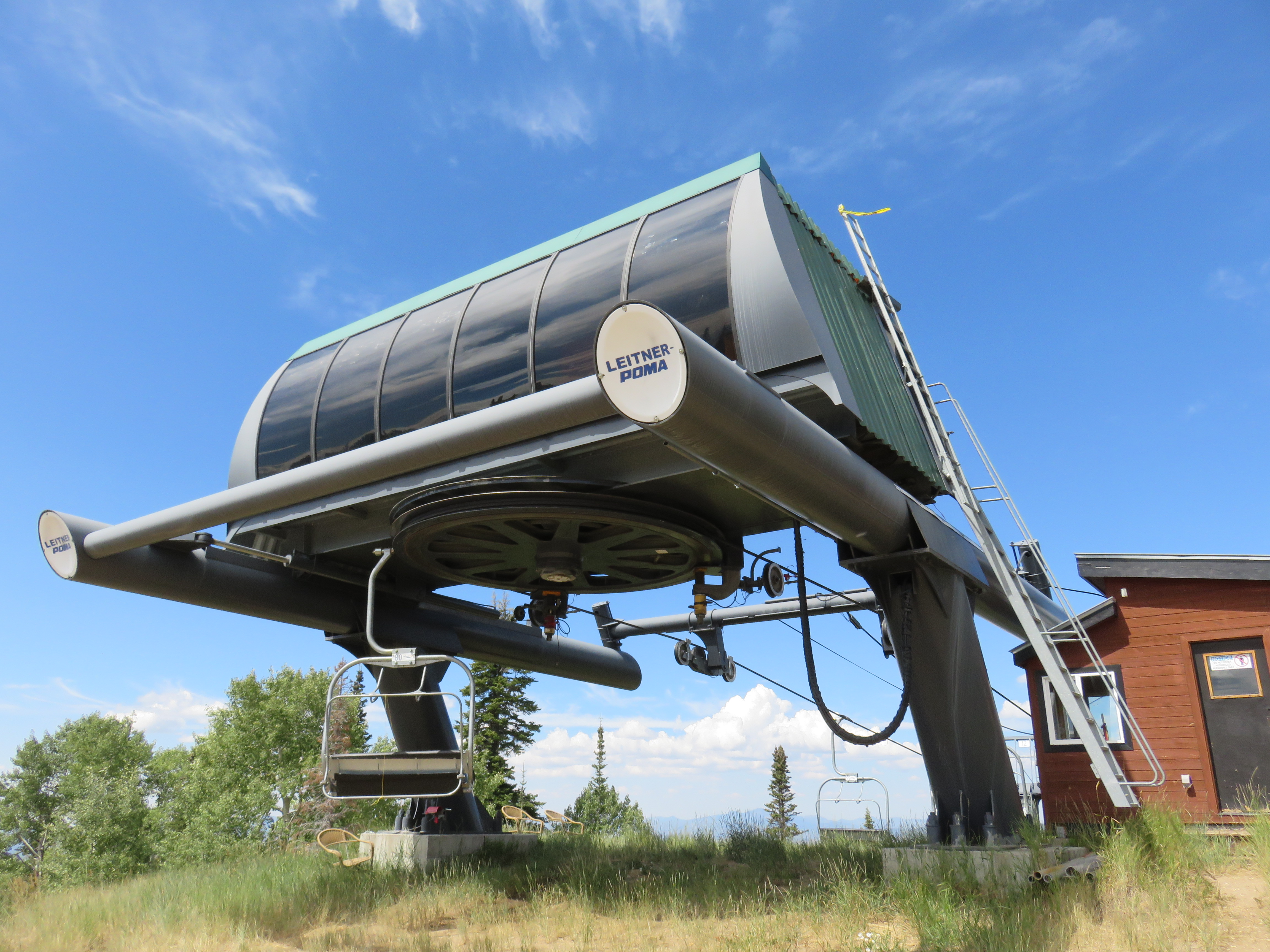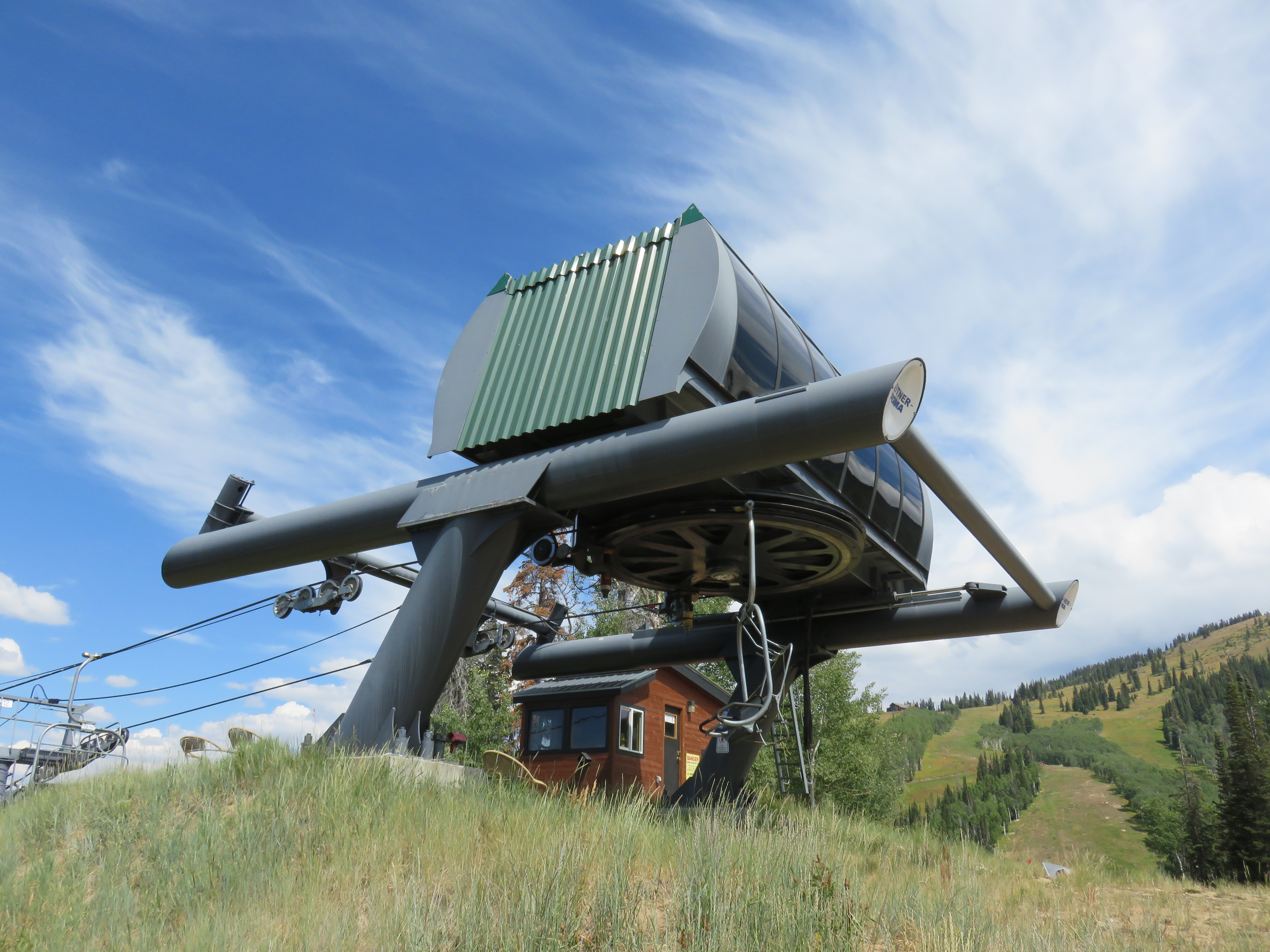 Leitner-Poma Alpha drive station up top.View down the lift line.Unloading area.Lift line view.Return bullwheel from above.Tower 1.Looking up from the base.Loading area.Lift overview.Upper lift line from below.Compression tower.Leitner-Poma Alpha drive station.