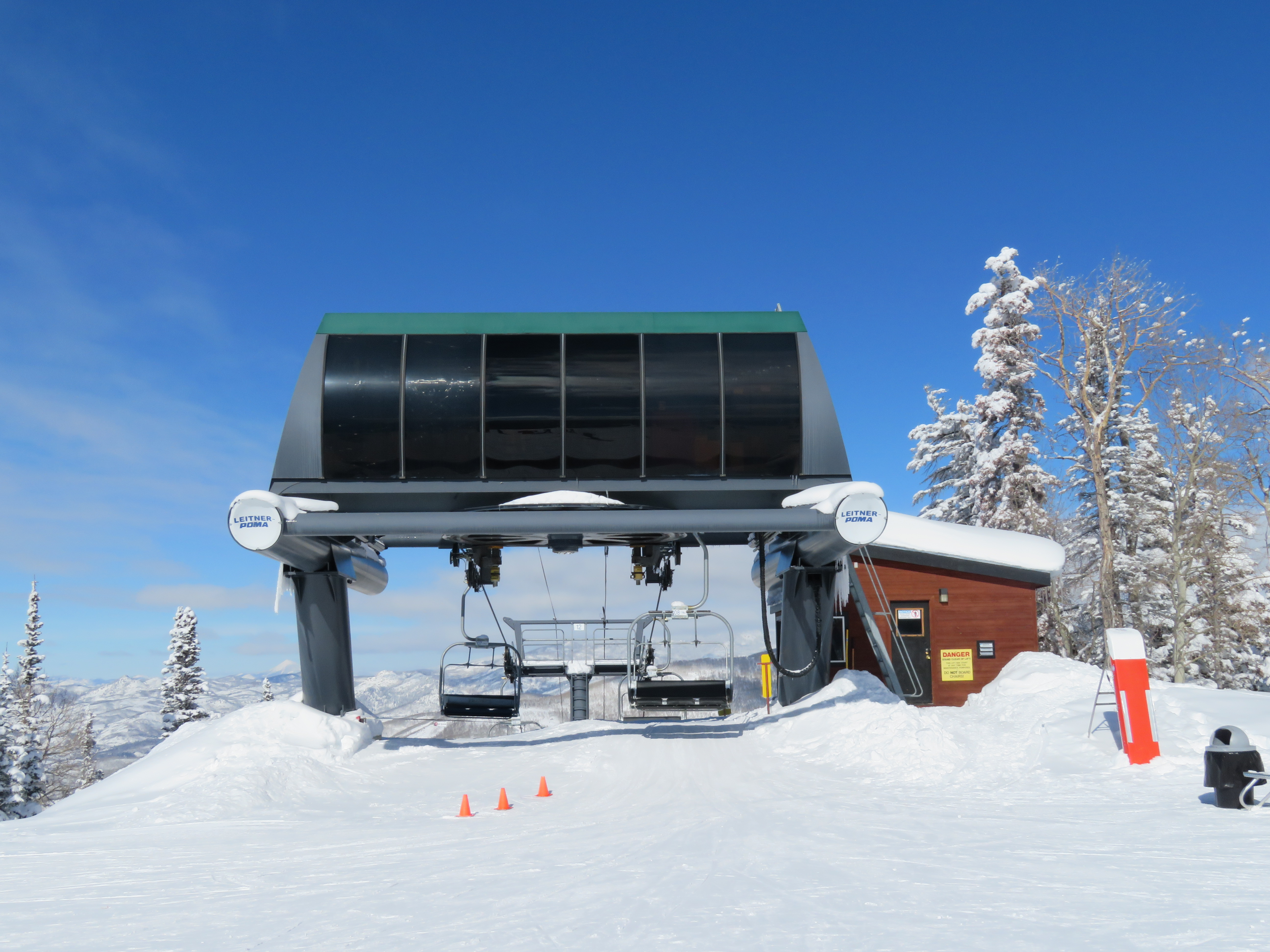 High-speed detachables are uneconomical for lifts under a mile in length due to their initial cost and maintenance. An exception had to be made for the Elkhead Express as it’s the primary egress route from the Priest Creek area. The previous fixed-grip quad was a bottleneck at the end of the day. It seemed to have more capacity than tired, worn-out skiers and riders were able to deal with. This lift (YAN, 1984-2016) was acquired by China Peak Mountain Resort outside Fresno, CA. The first Elkhead lift, a Heron-Poma double chair, 1972-1984, went to Winter Park.