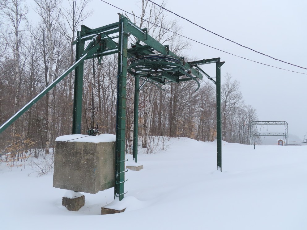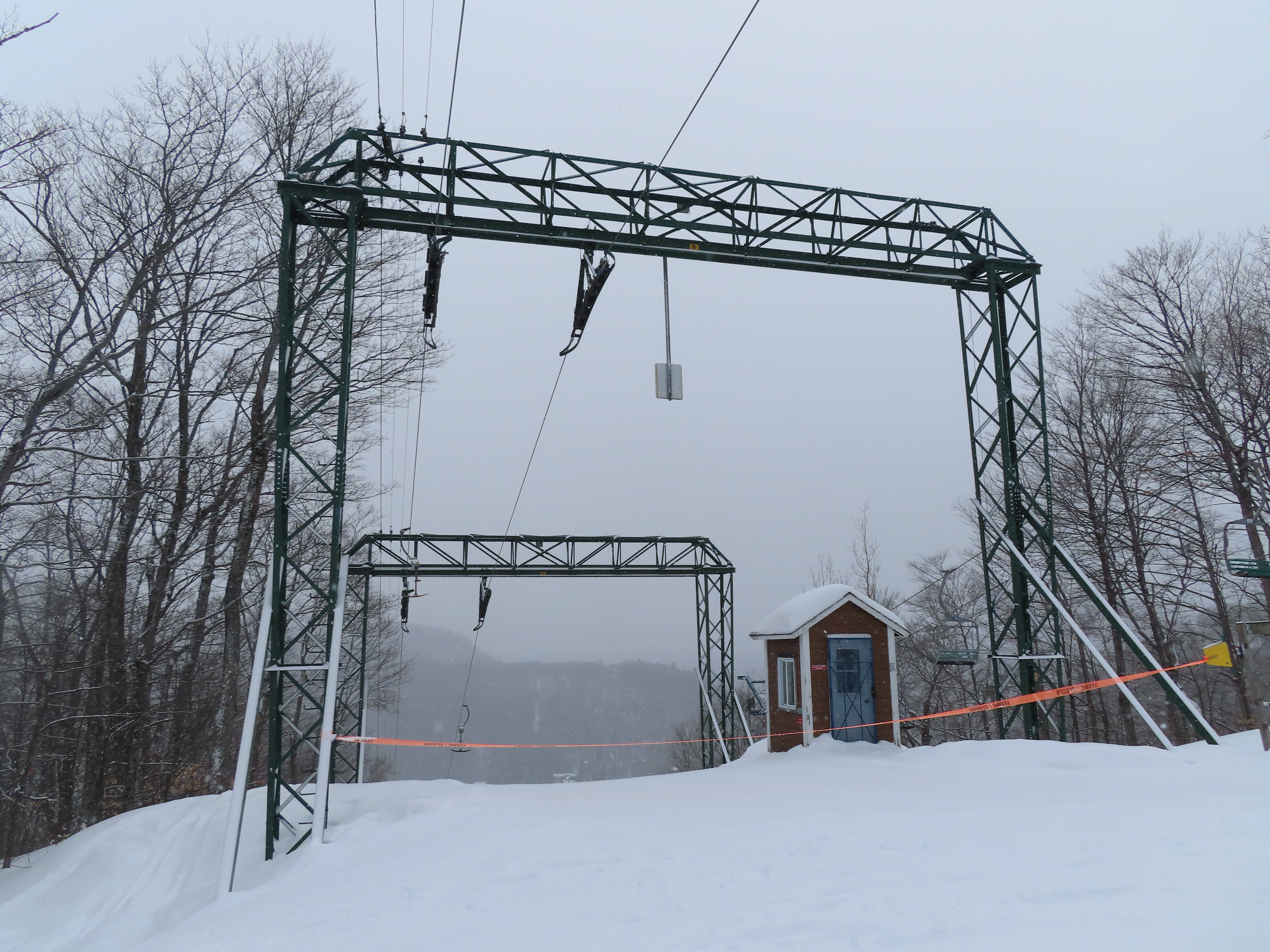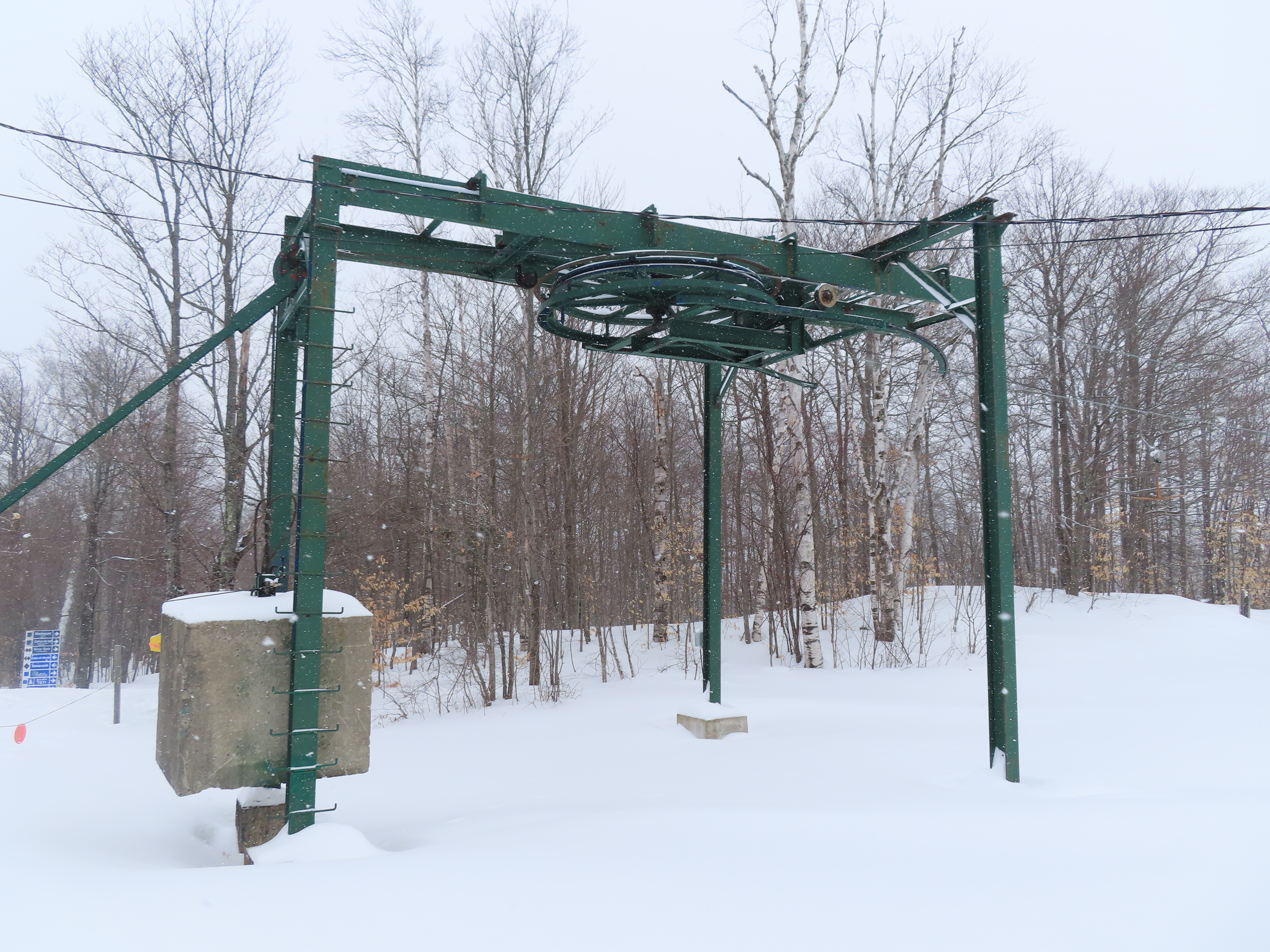 This T-Bar services as backup to the A triple chair.Tension terminal up top.These towers are large because there used to be a second T-Bar alongside.Portal tower 1.Wooden T.Drive terminal.View up the lift line.A tower.The top breakover seen from the triple chair.Side view of the top terminal.