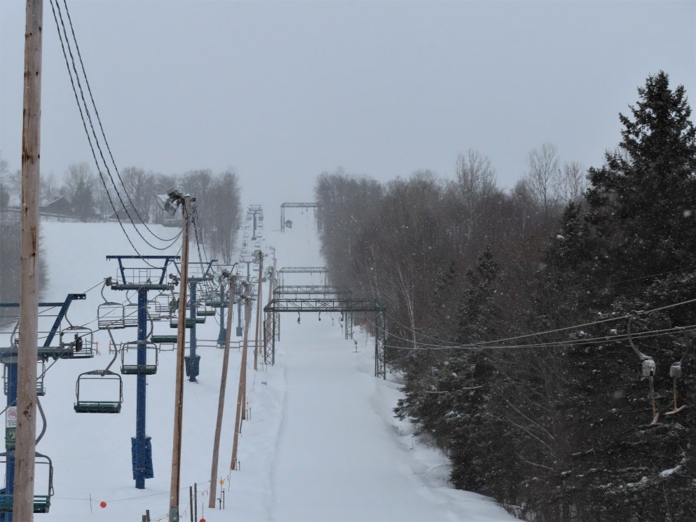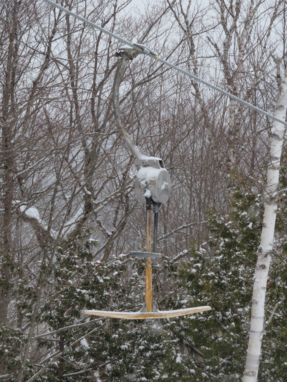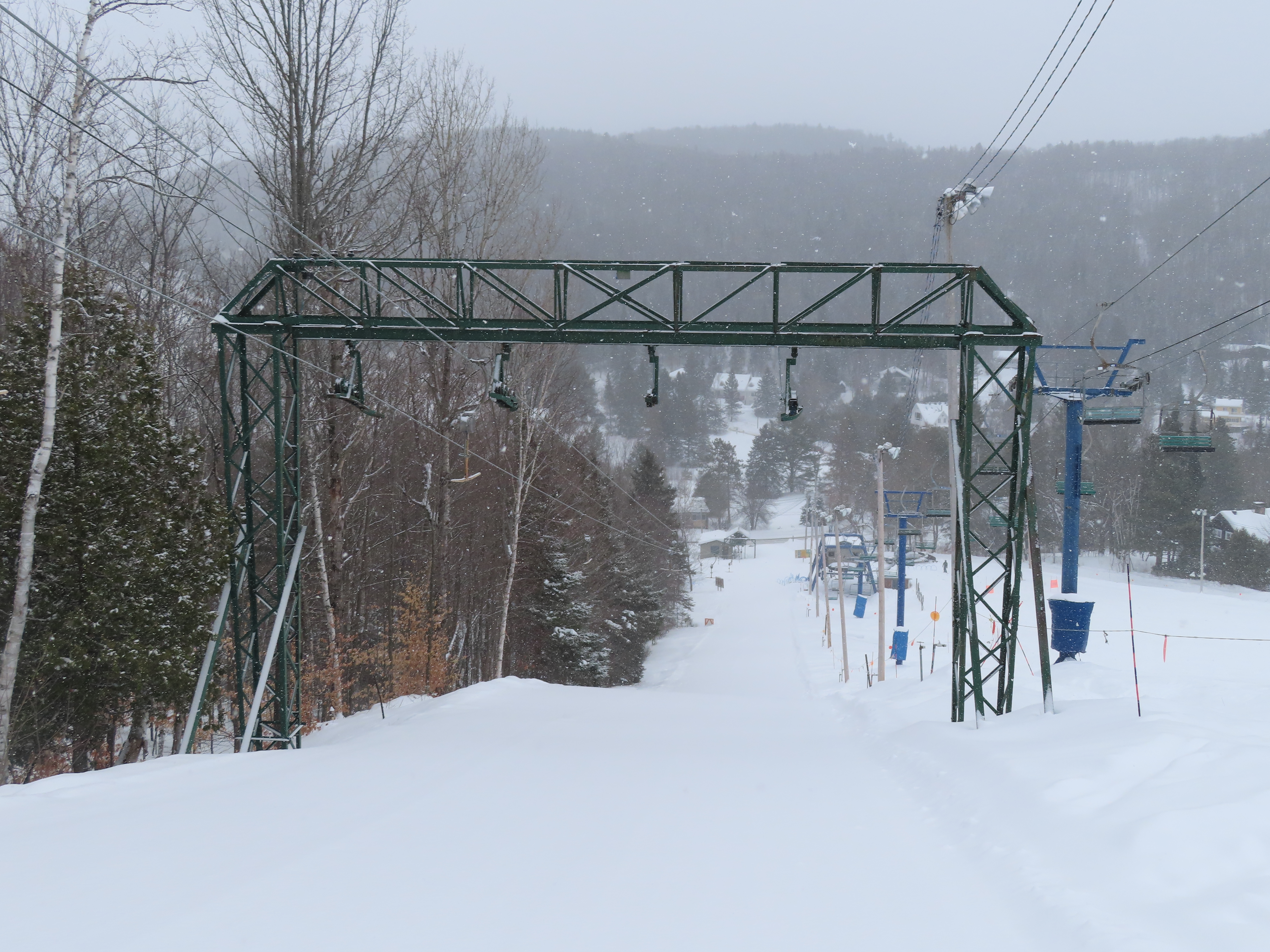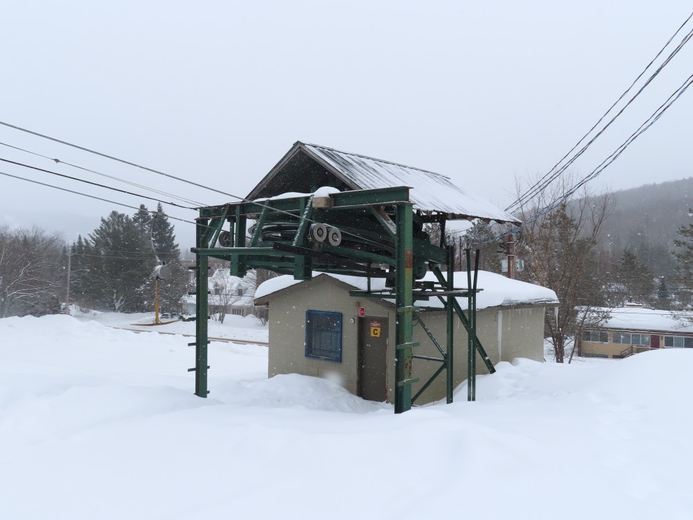 This T-Bar services as backup to the A triple chair.Tension terminal up top.These towers are large because there used to be a second T-Bar alongside.Portal tower 1.Wooden T.Drive terminal.View up the lift line.A tower.The top breakover seen from the triple chair.Side view of the top terminal.
